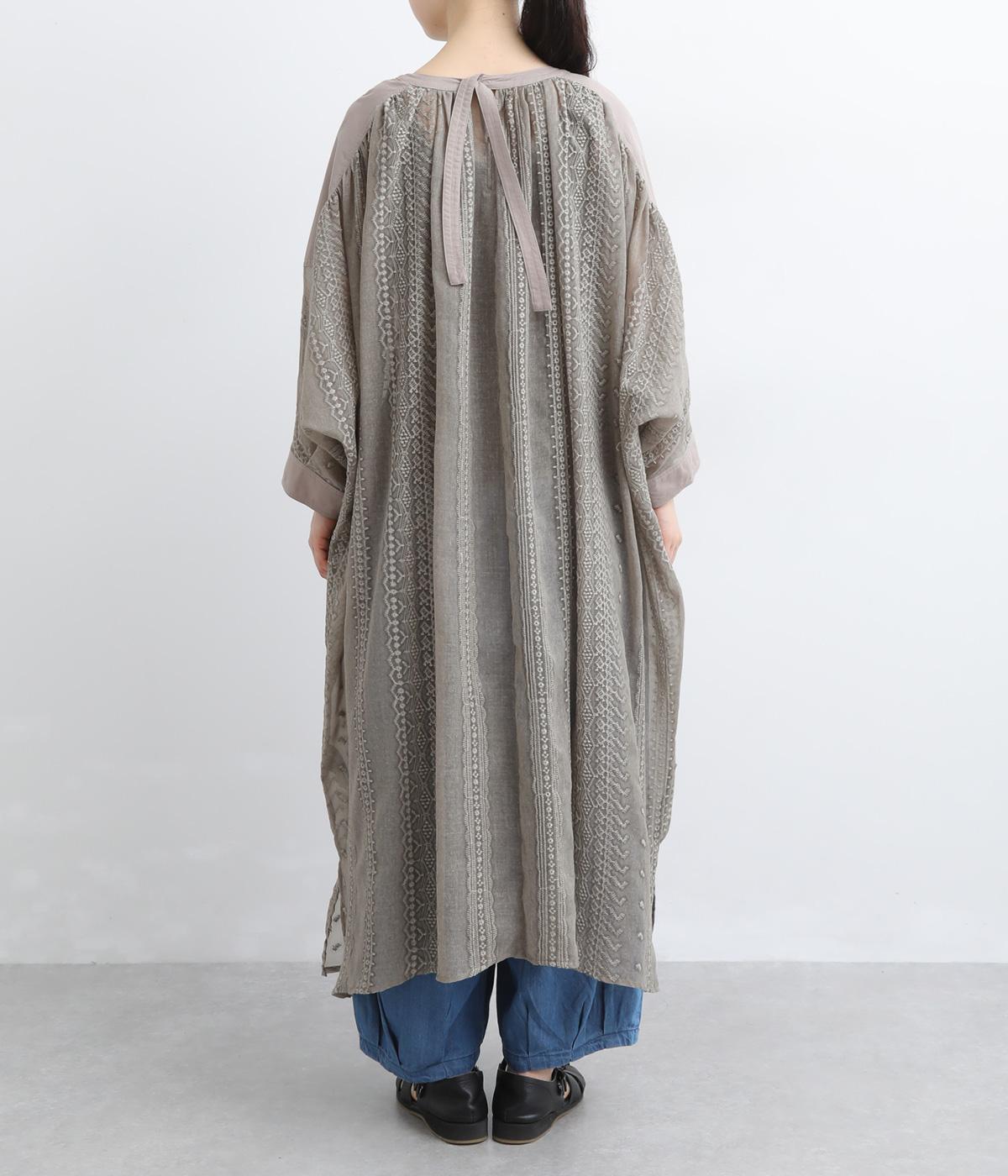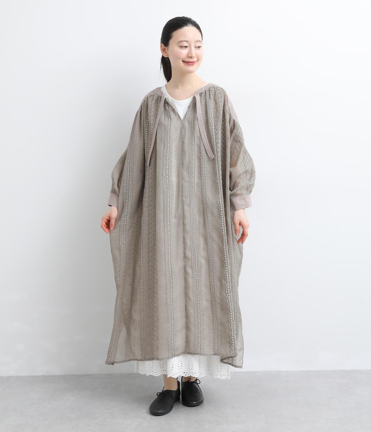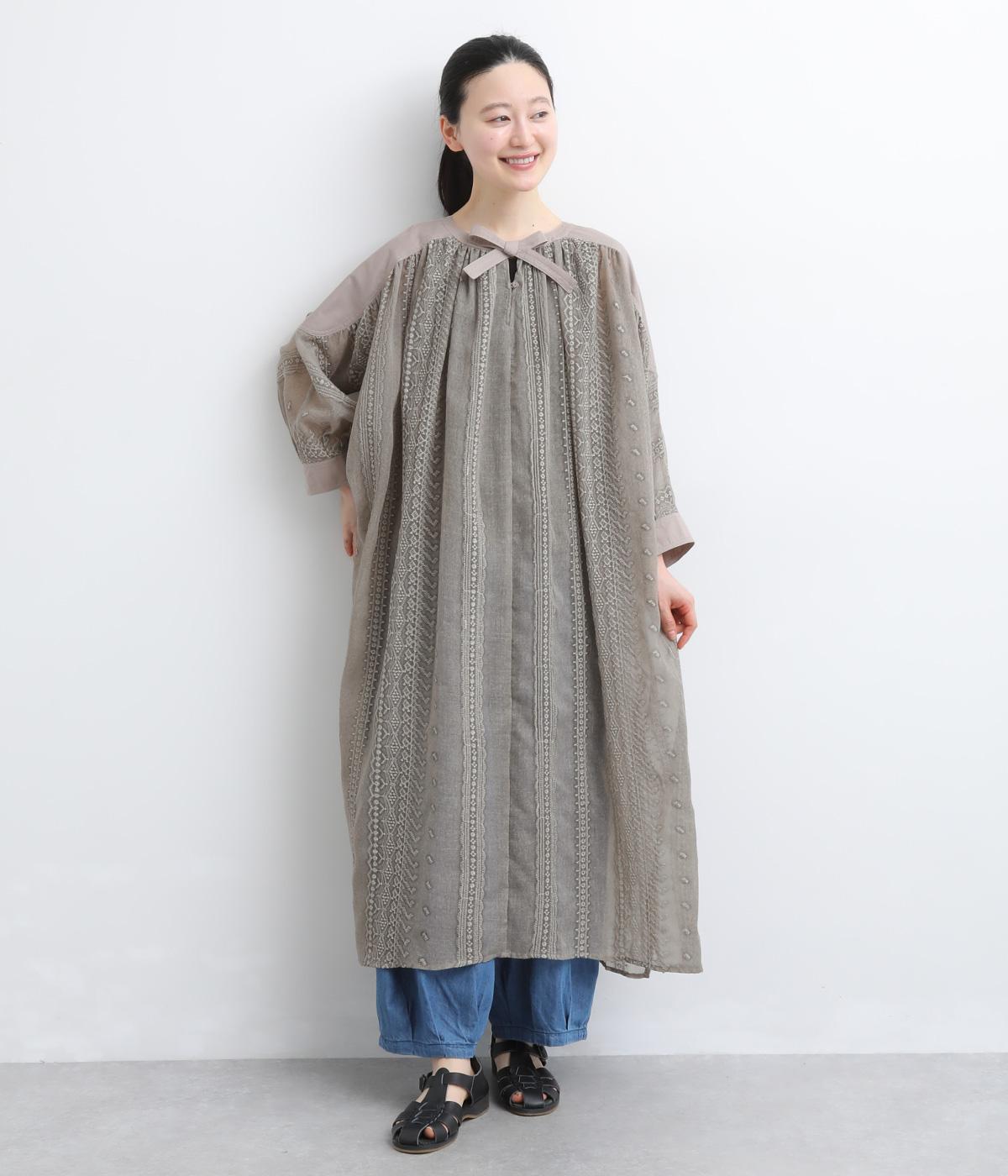 奥行きのあるシザー素材に繊細な刺しゅうがドラマティックな雰囲気に。ゆったりとしたドレスワンピースは、前あきで羽織ったり、襟ぐりのリボンをワンポイントにしたりと前後2wayでたのしめます。ドルマン袖でボリュームのあるインナー合わせも◎。