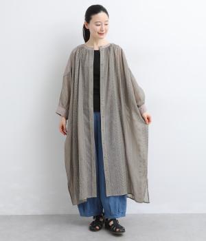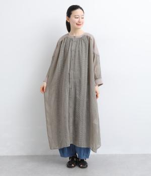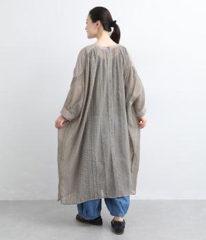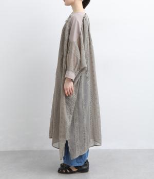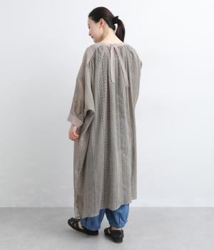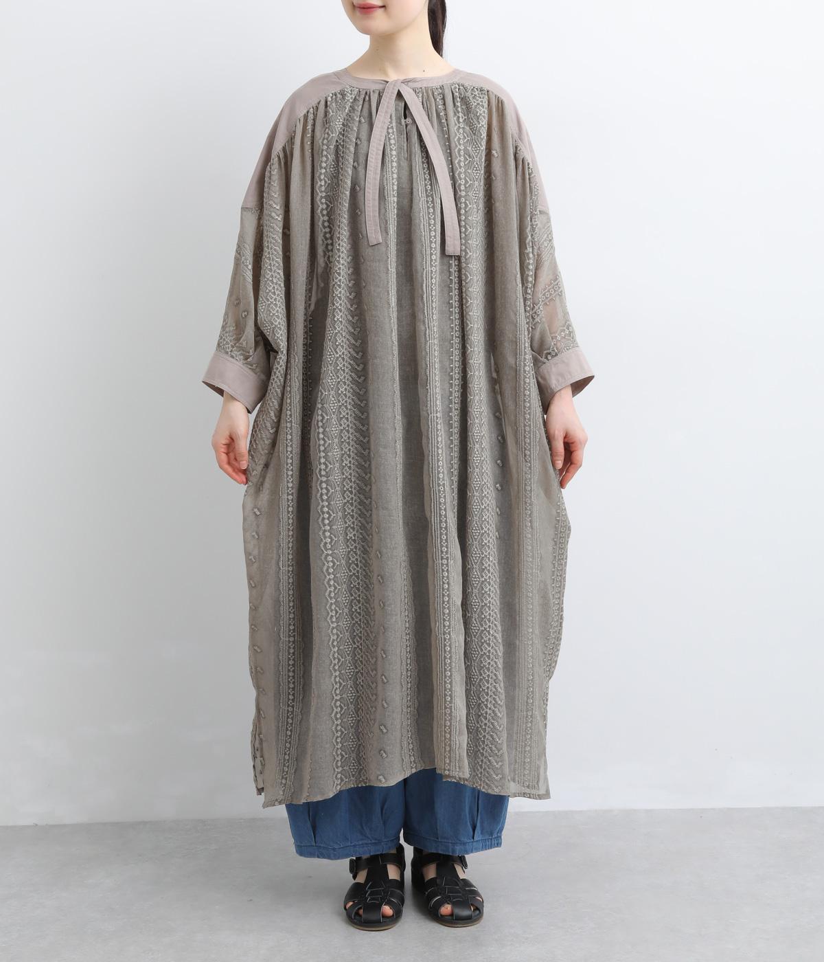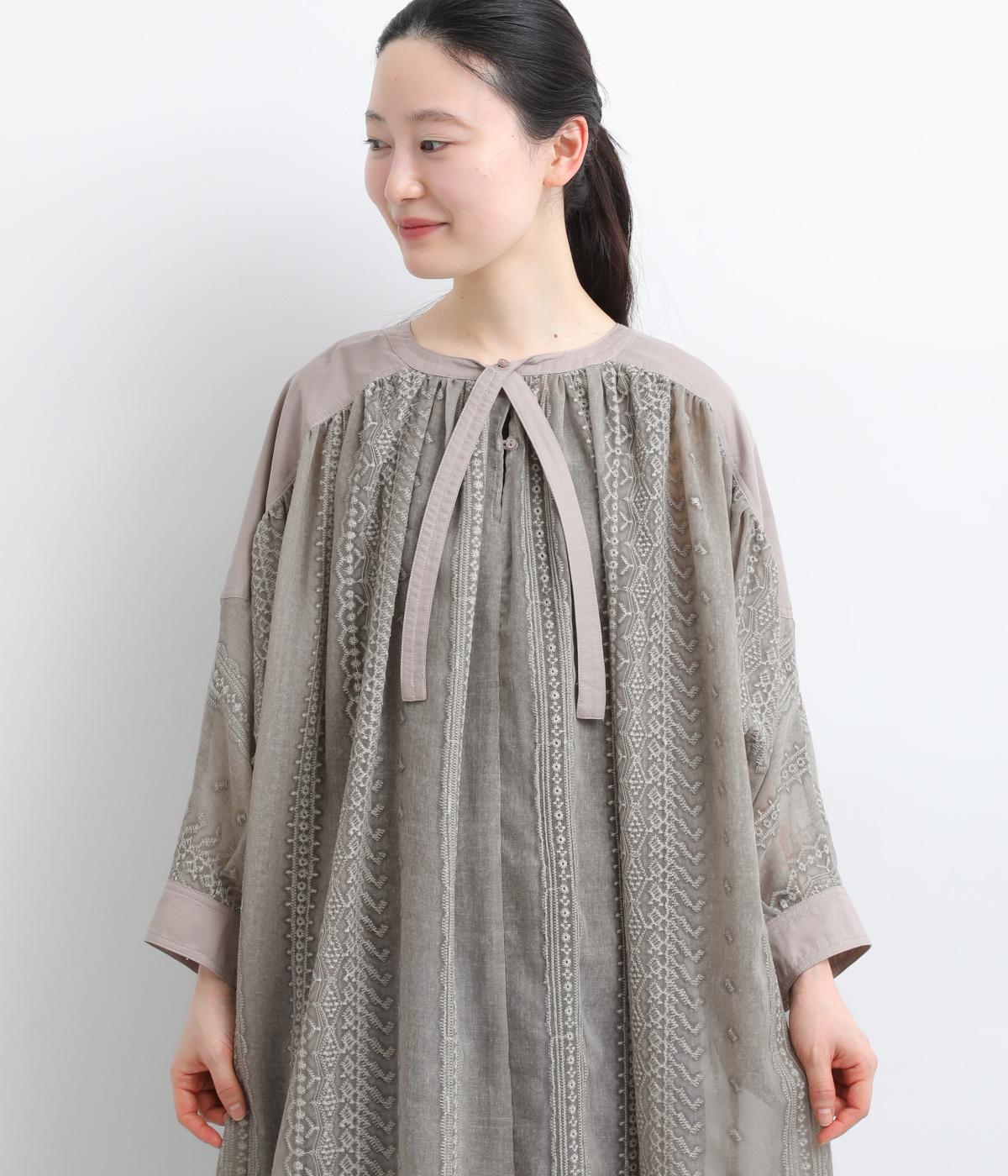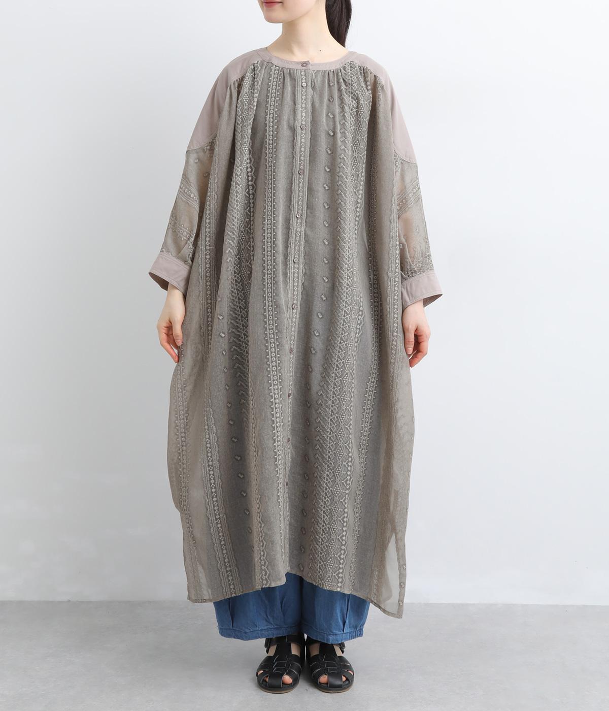 奥行きのあるシザー素材に繊細な刺しゅうがドラマティックな雰囲気に。ゆったりとしたドレスワンピースは、前あきで羽織ったり、襟ぐりのリボンをワンポイントにしたりと前後2wayでたのしめます。ドルマン袖でボリュームのあるインナー合わせも◎。