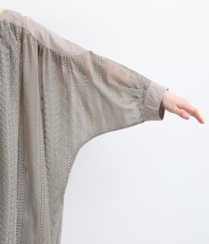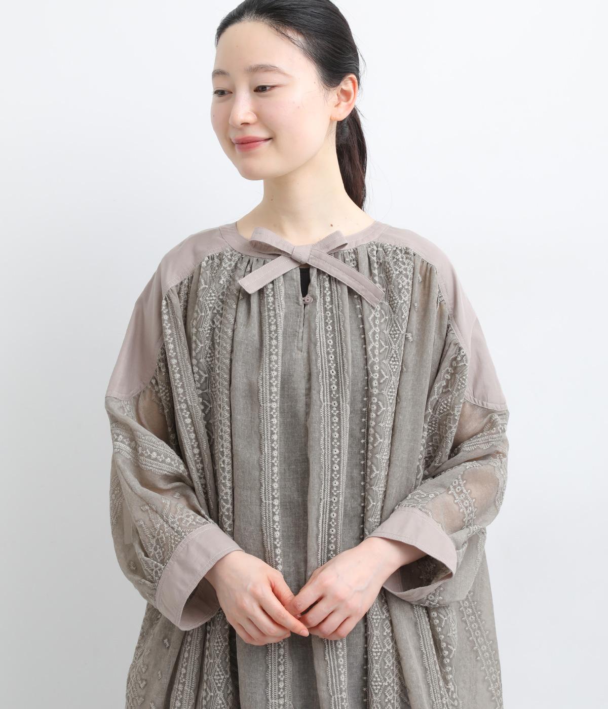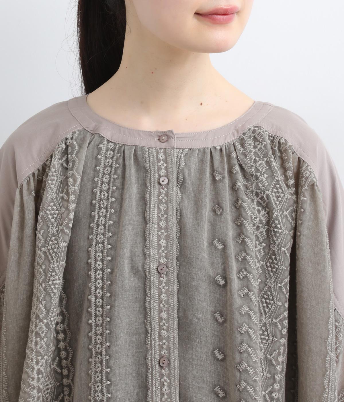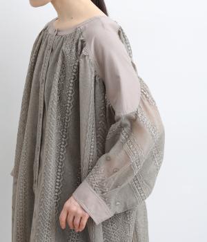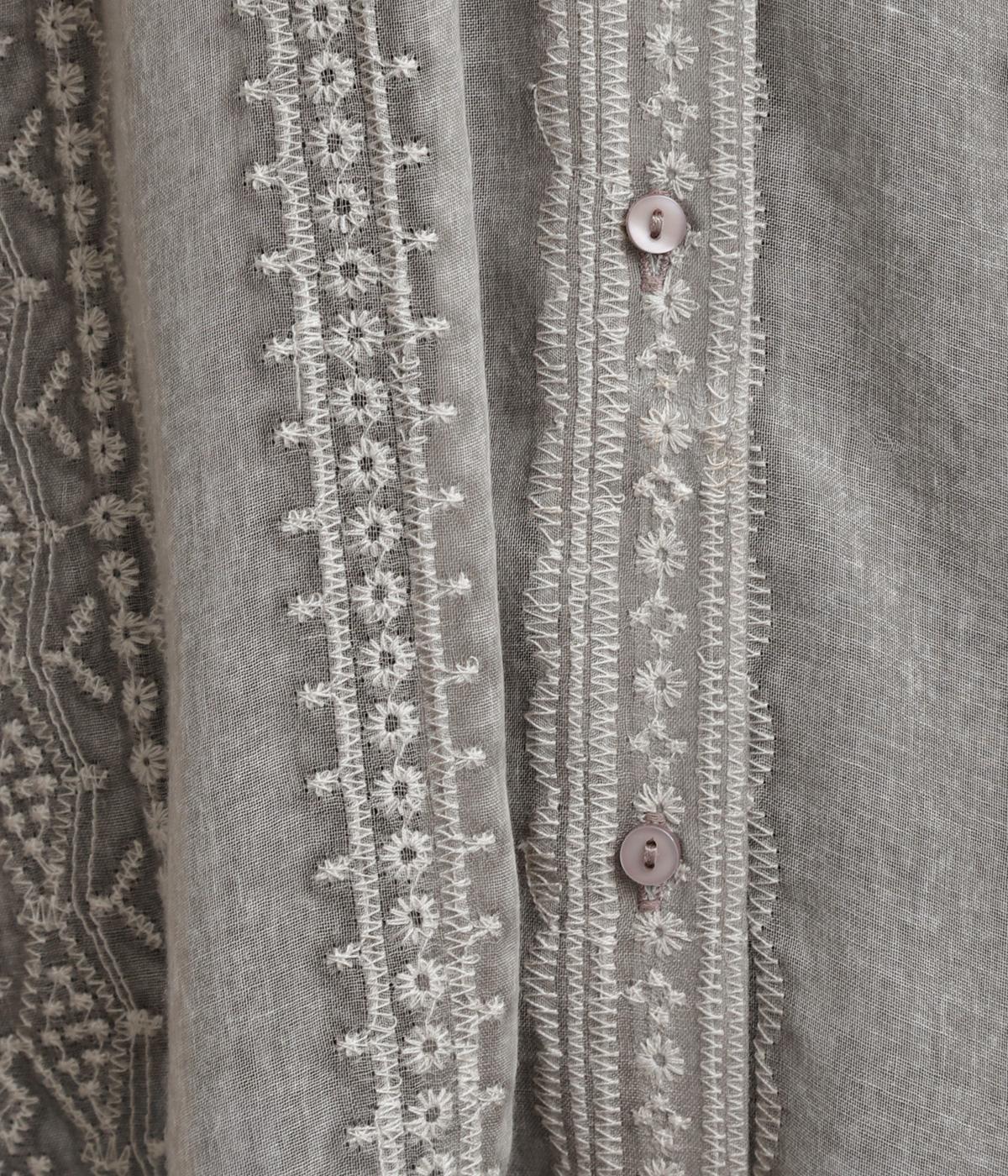 繊細さのあるシアー素材にエンブロイダリー刺しゅうを贅沢にたっぷりとほどこしました。肩ヨークや袖口はコットンでメリハリをプラス。