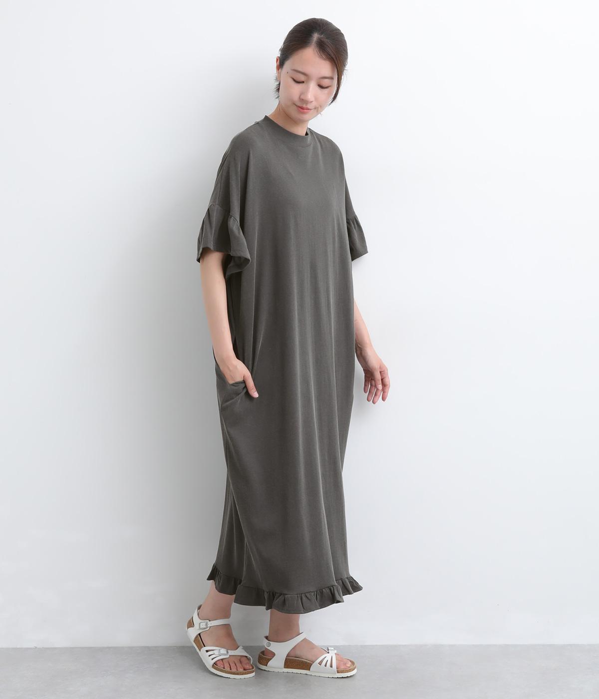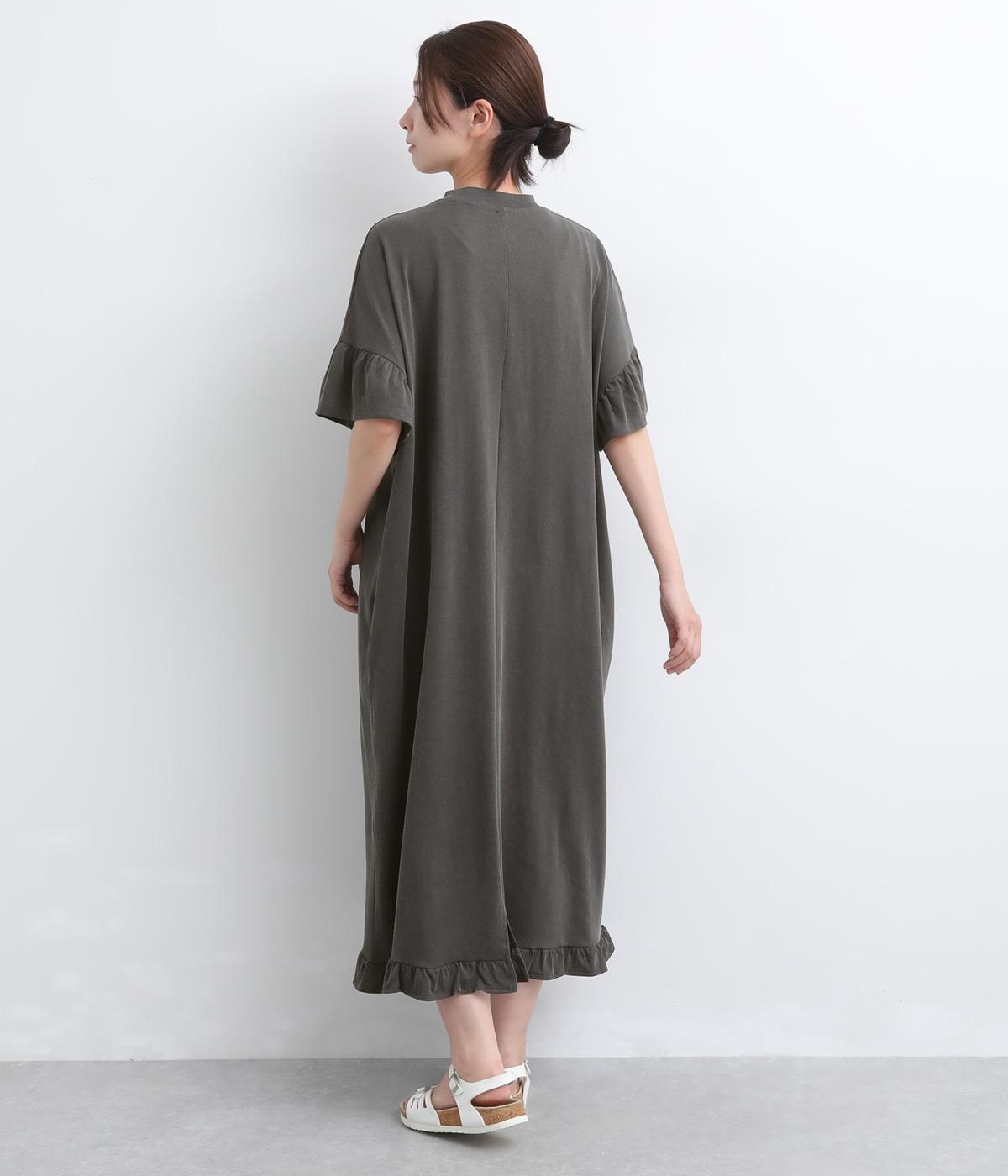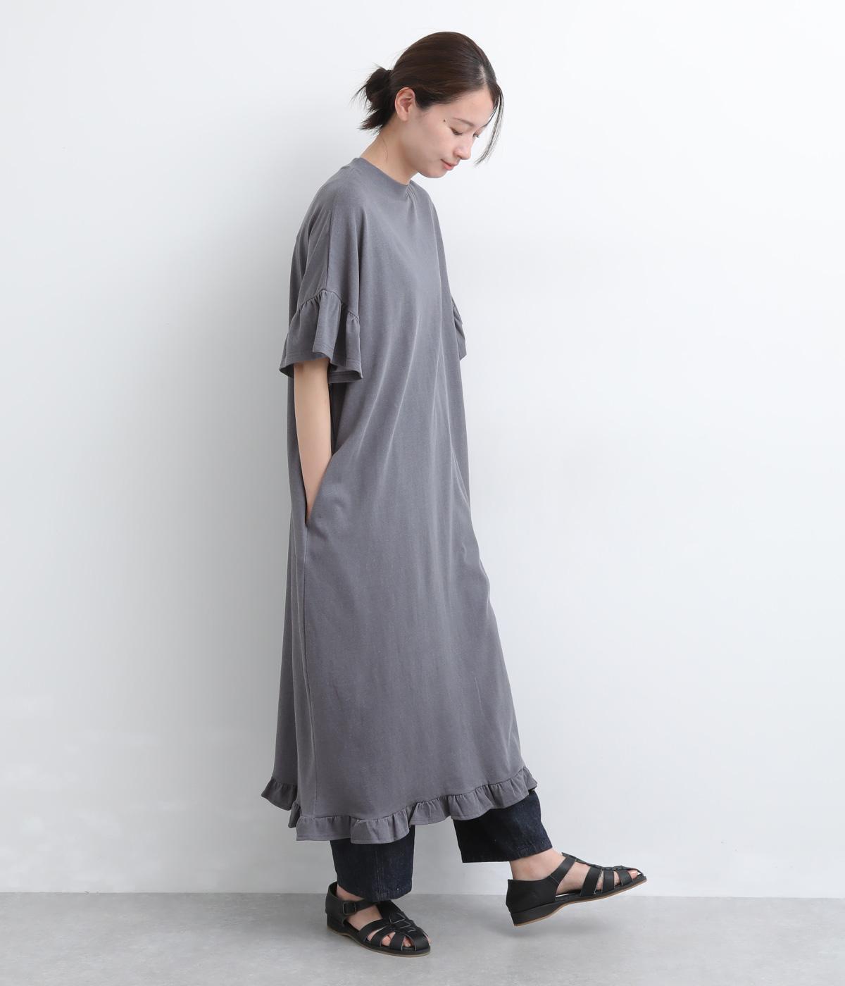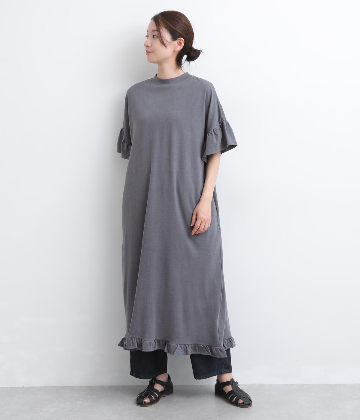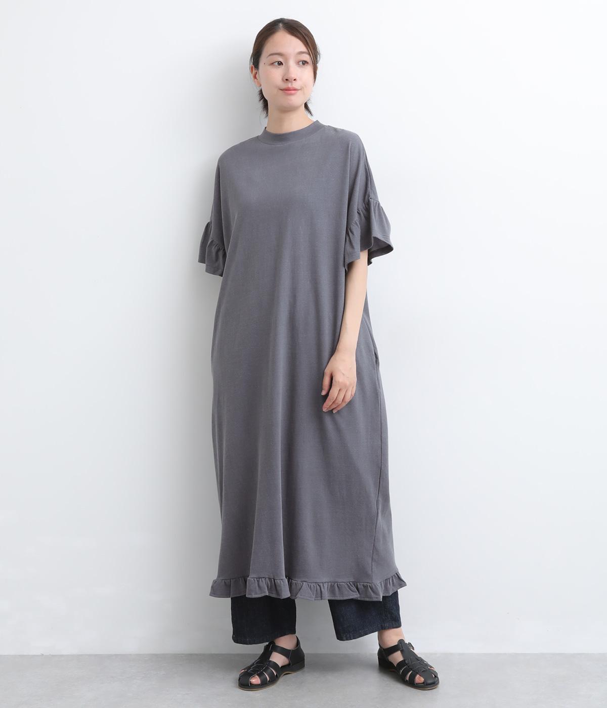 リラックス気分に寄り添ってくれるカットソーワンピースは、袖と裾にフリルをあしらいフェミニンテイストに仕上げました。やや立ち上がったラウンドネックで顔まわりはすっきりきちんと感を。便利なポケットつきでデイリー使いに最適な一着。