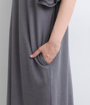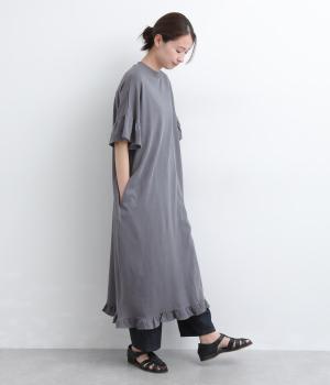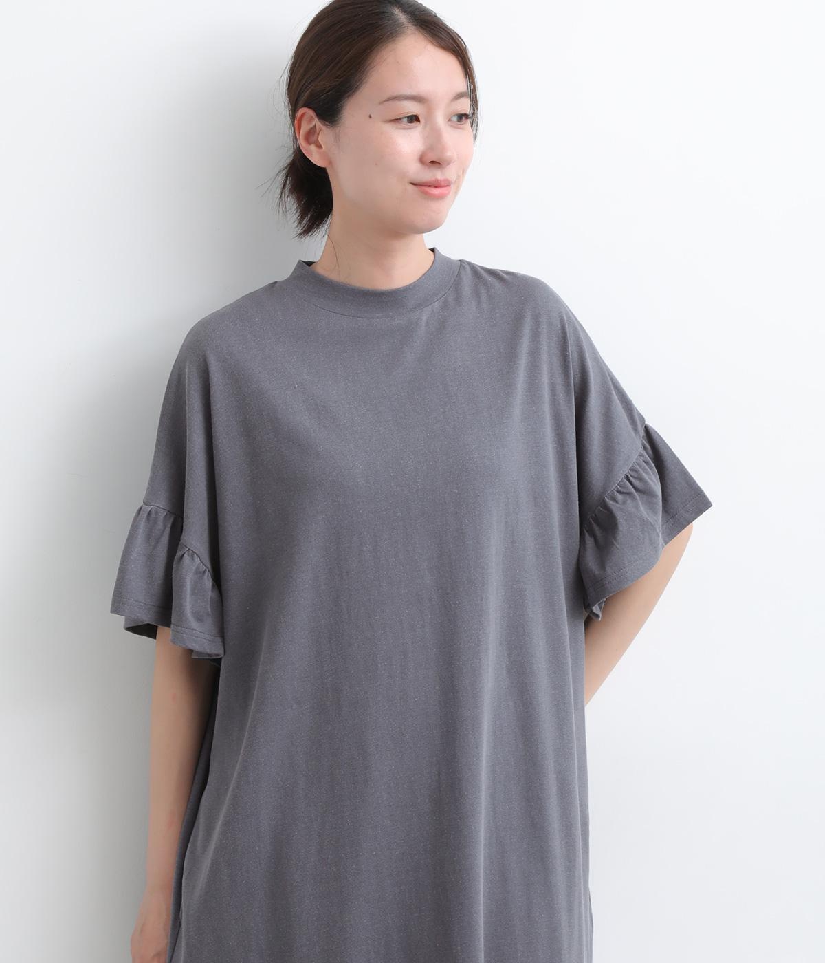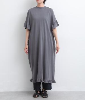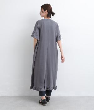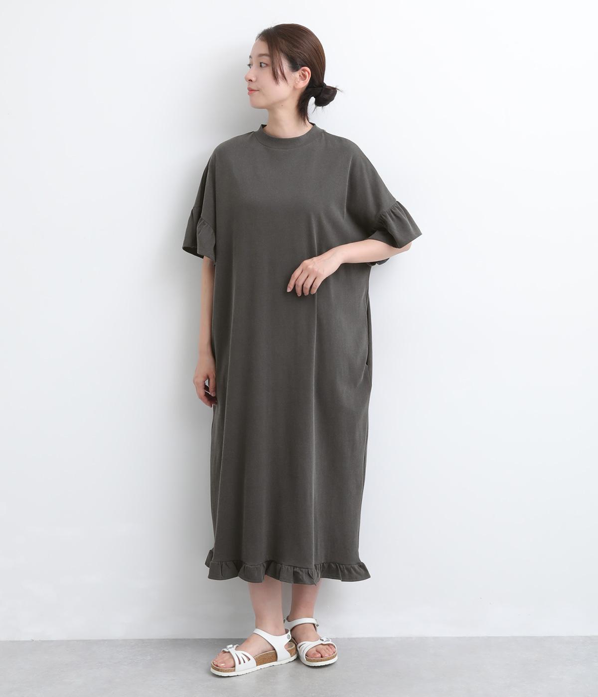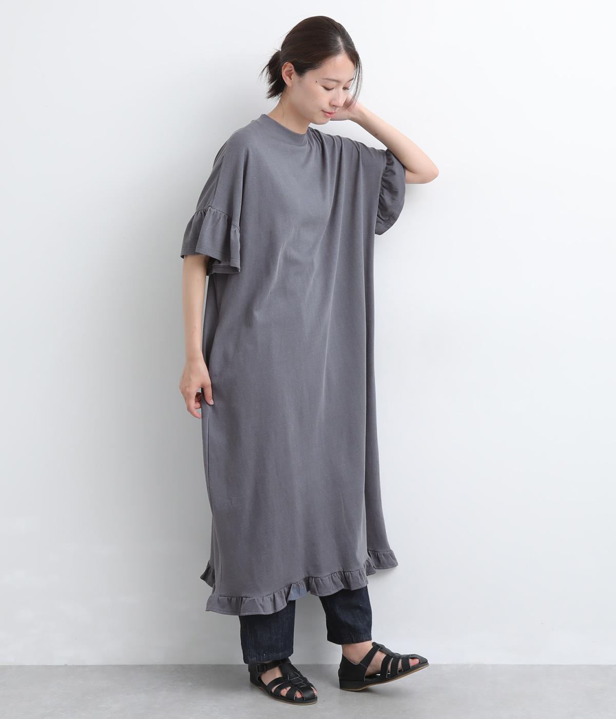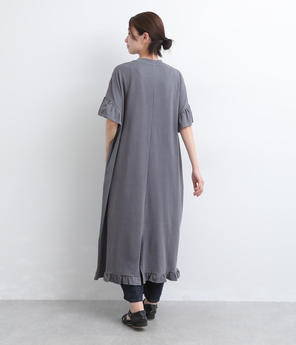 リラックス気分に寄り添ってくれるカットソーワンピースは、袖と裾にフリルをあしらいフェミニンテイストに仕上げました。やや立ち上がったラウンドネックで顔まわりはすっきりきちんと感を。便利なポケットつきでデイリー使いに最適な一着。