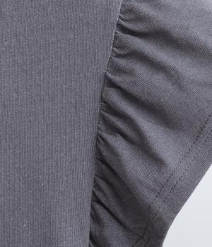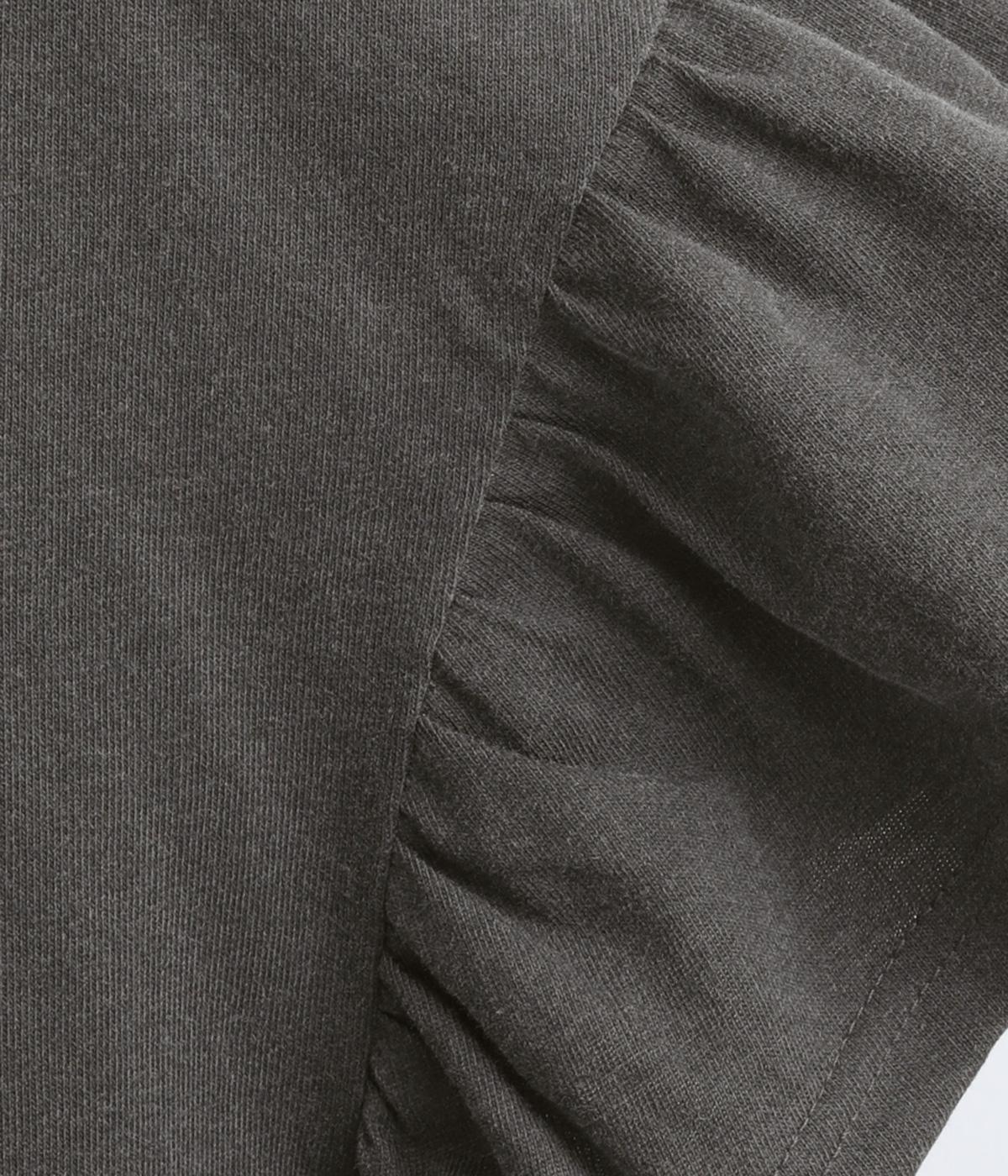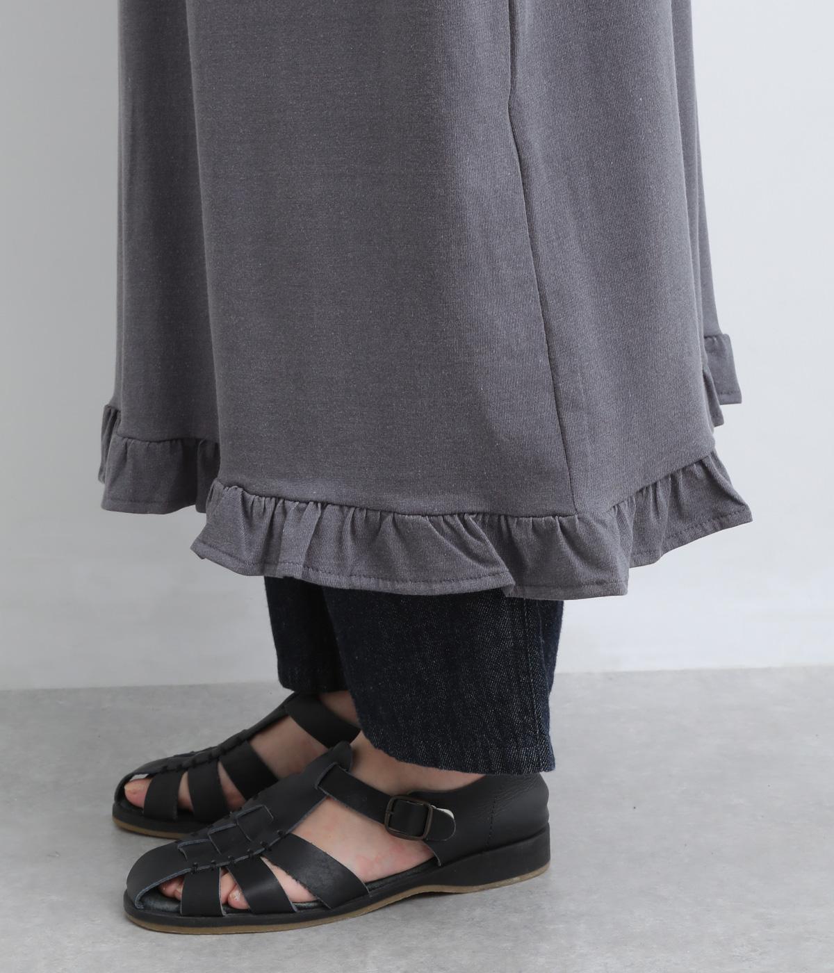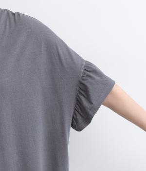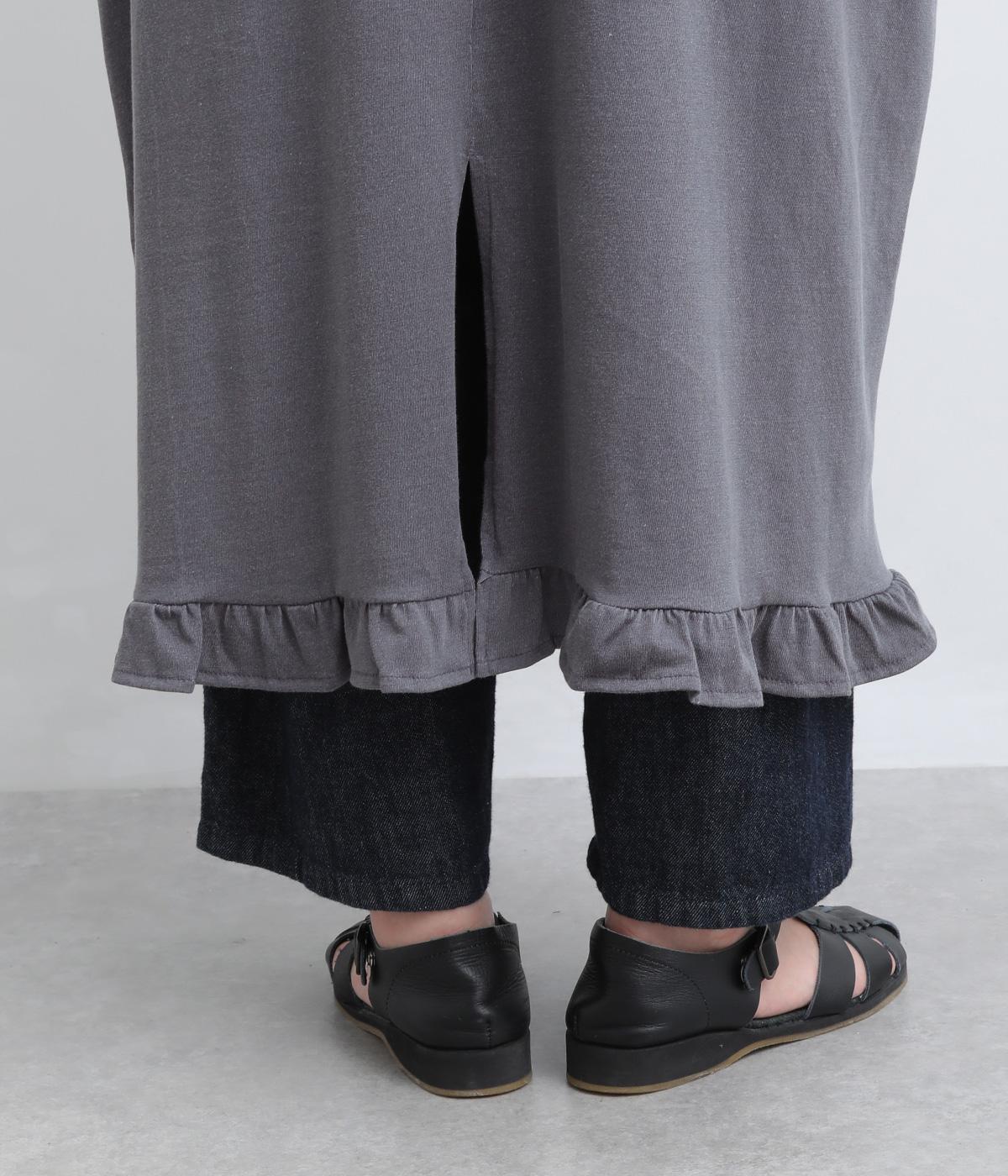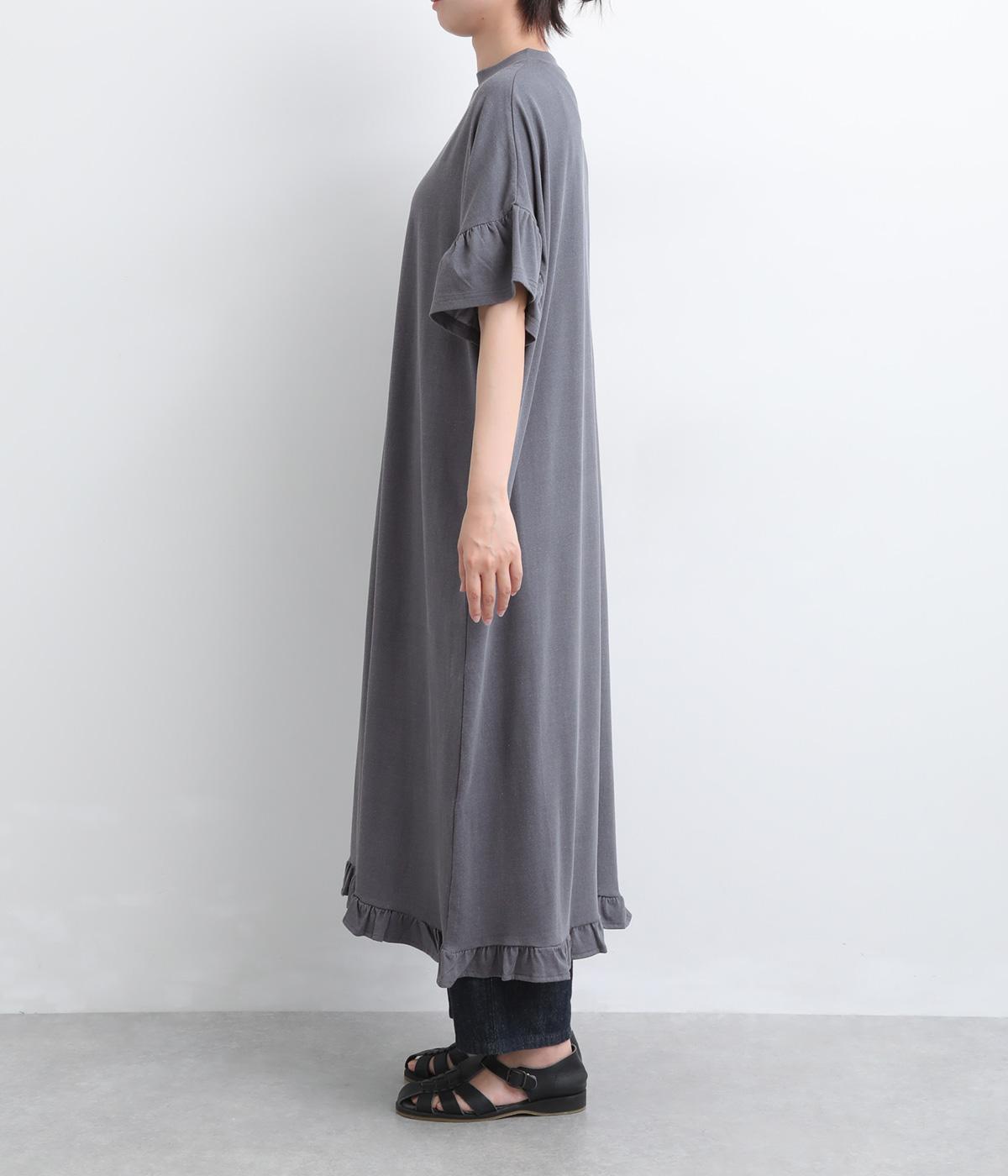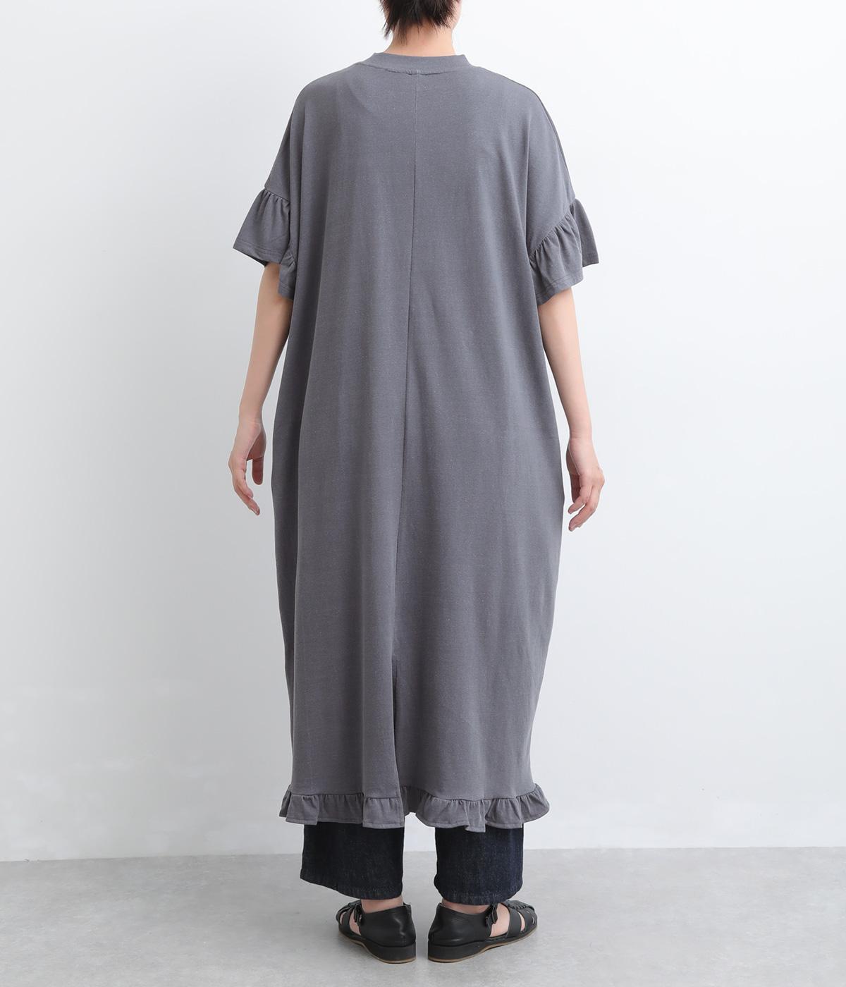 リラックス気分に寄り添ってくれるカットソーワンピースは、袖と裾にフリルをあしらいフェミニンテイストに仕上げました。やや立ち上がったラウンドネックで顔まわりはすっきりきちんと感を。便利なポケットつきでデイリー使いに最適な一着。