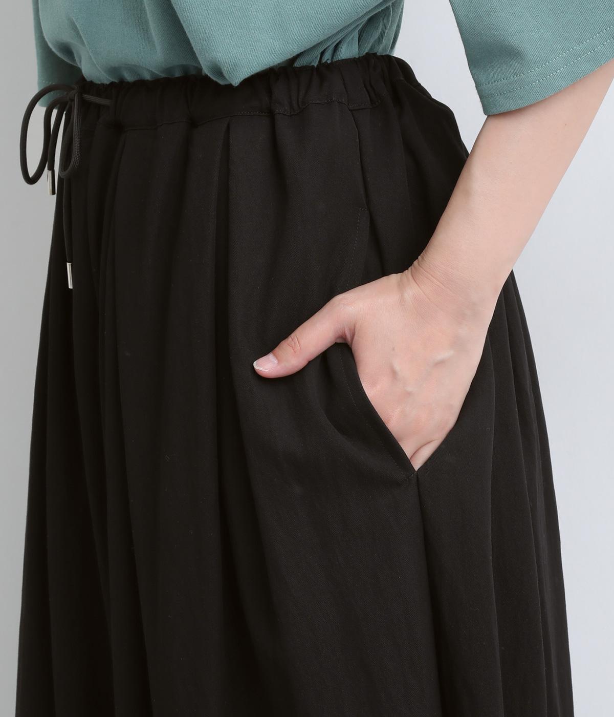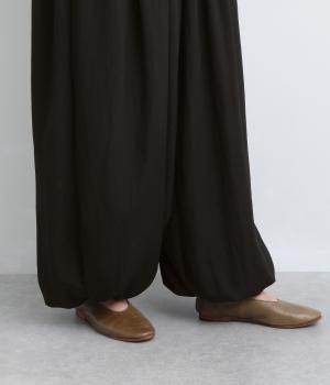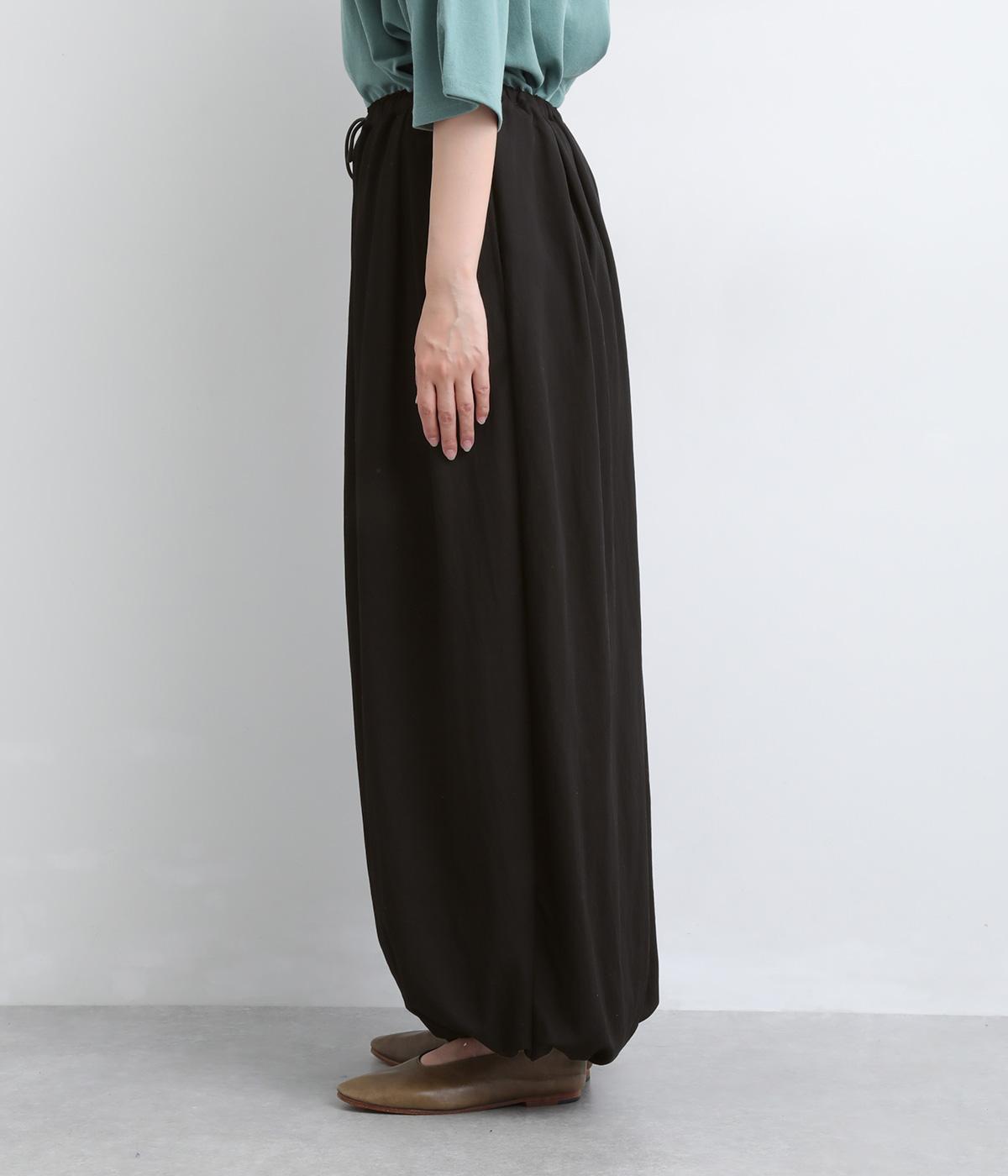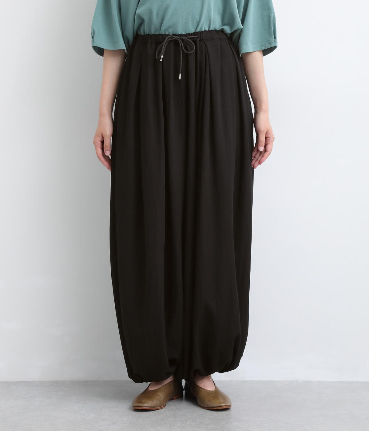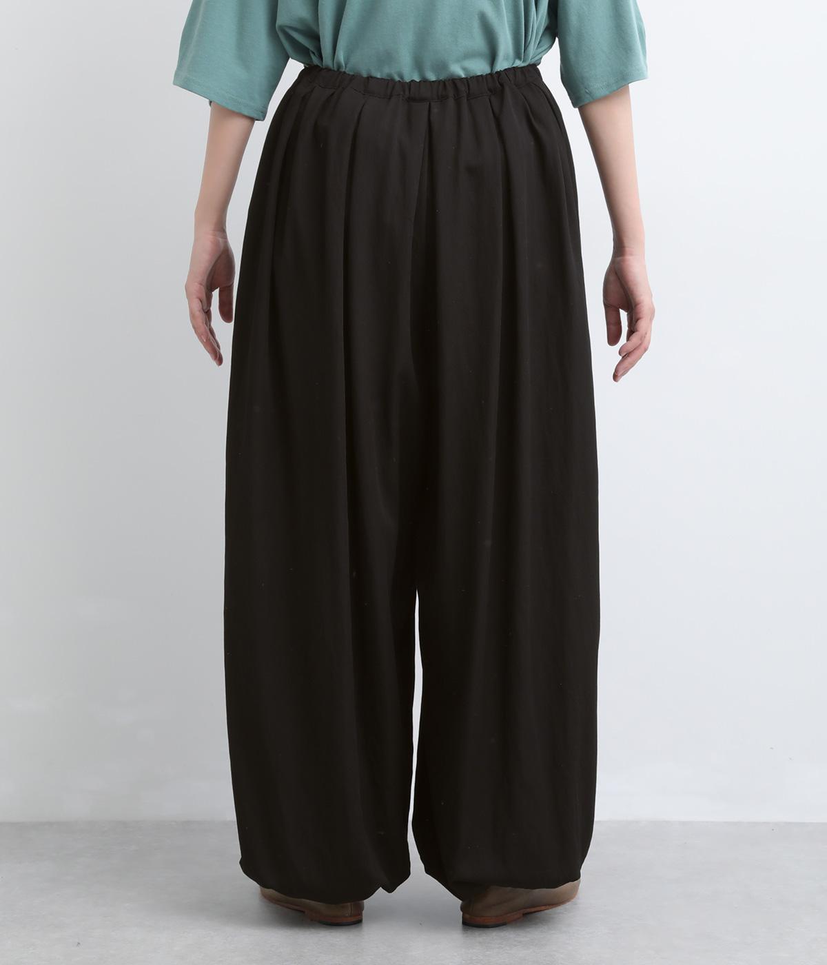 たっぷりとしたボリューム感が着映えするタックパンツは、タテラインを強調する落ち感があり、横姿も美しくきまります。裾ゴムによって足元に自然なバルーンシルエットが生まれ、リラックス感とモードな雰囲気のバランスが◎。ウエストは総ゴム&調整紐つき。