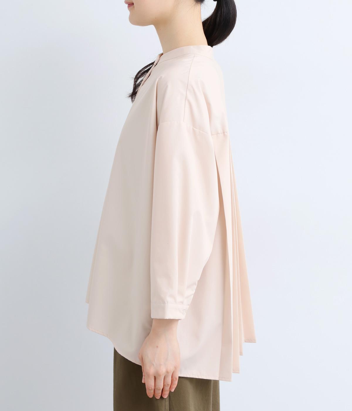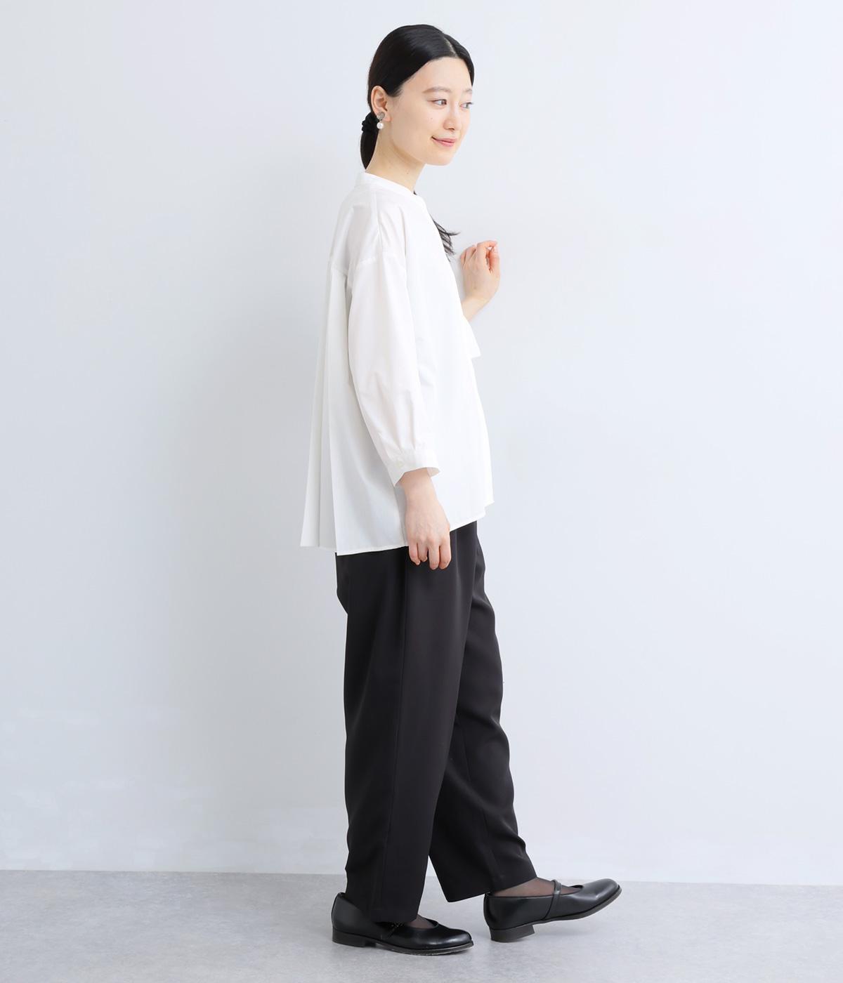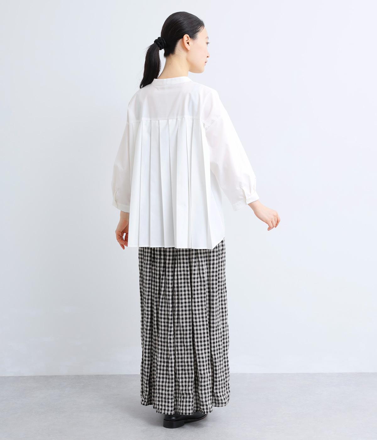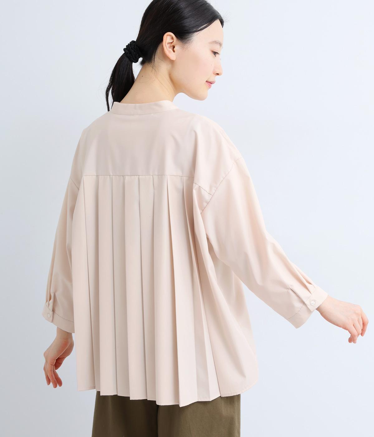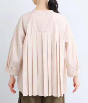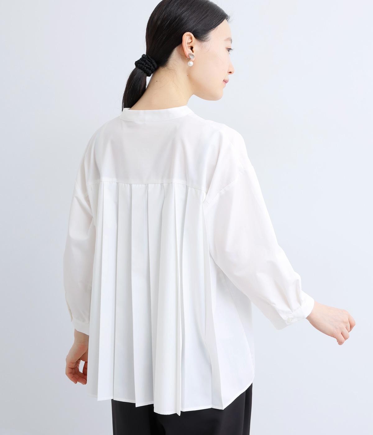 背中の立体的なプリーツが印象的なブラウス。フロントは比翼仕立てでボタンを隠し、シンプルに品よくデザインしました。手首が覗くやや短めの袖丈が女性らしい抜け感を演出。カジュアルにもきれいめにもマッチする一枚です。