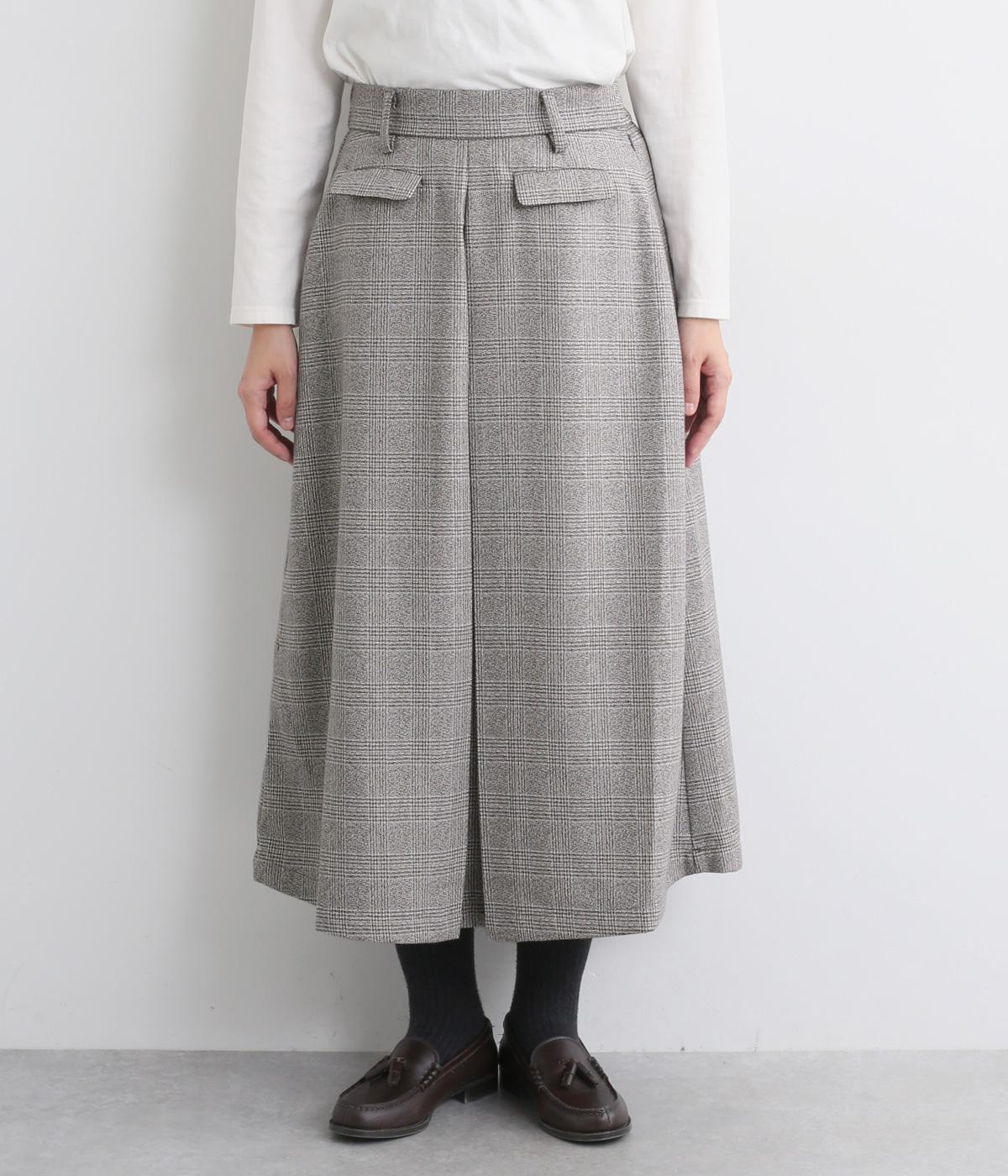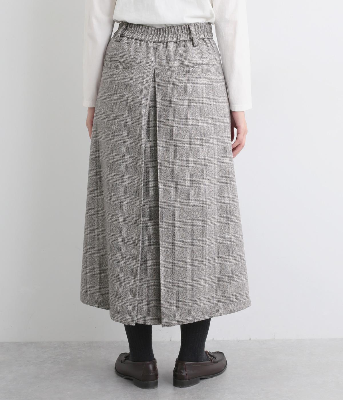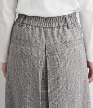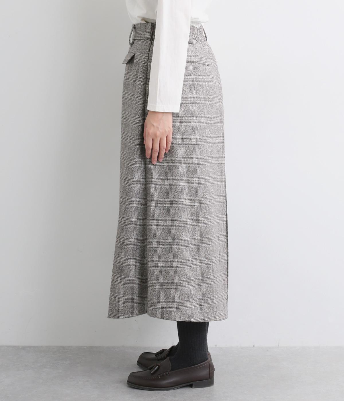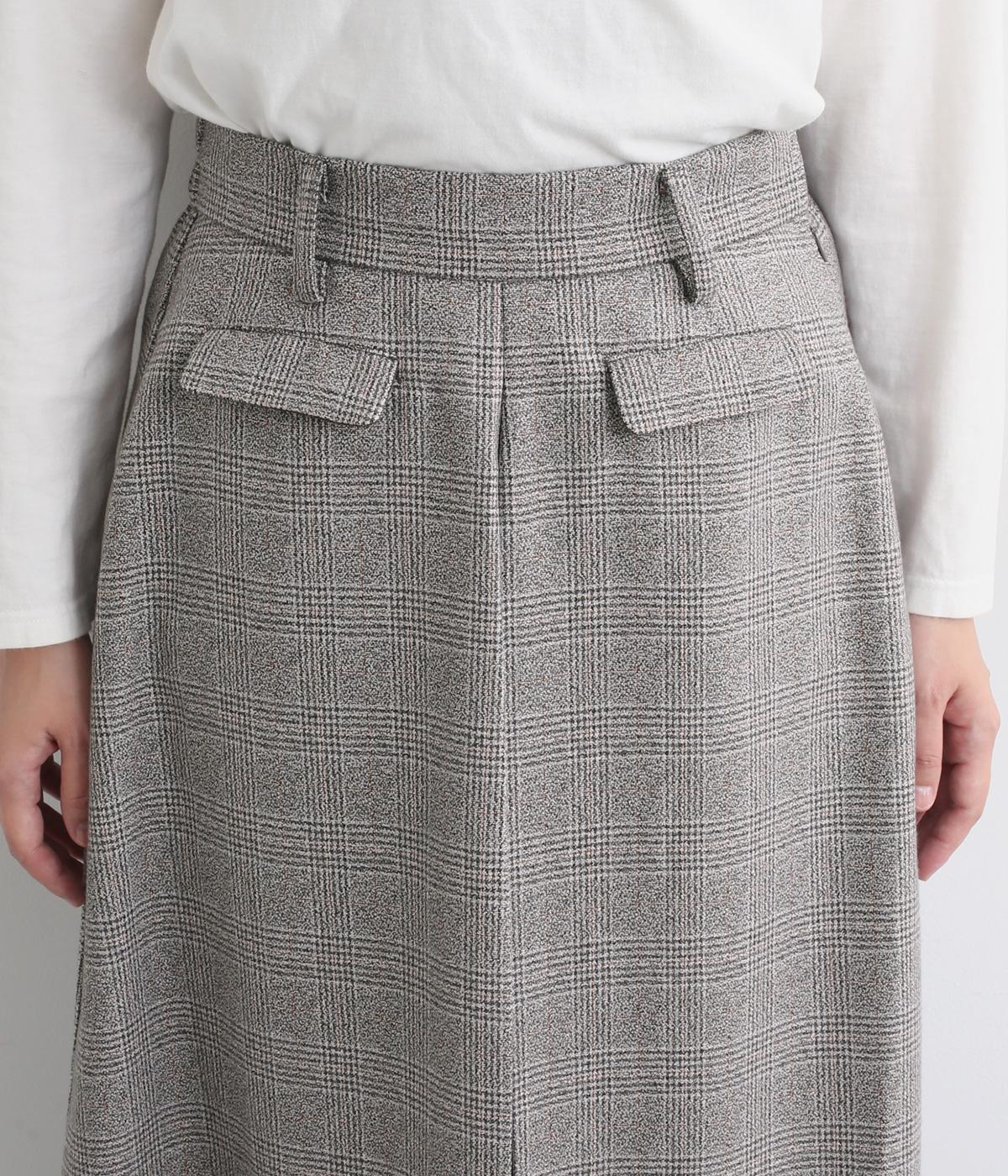 チェック柄やフロントポケットがクラシカルなロングスカート。前後に入れたタックが美しいAラインをつくります。ウエストは後ろゴム仕様でフロントまわりはすっきり。着脱しやすいサイドファスナー仕様です。