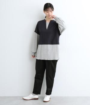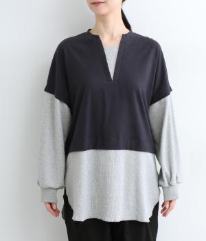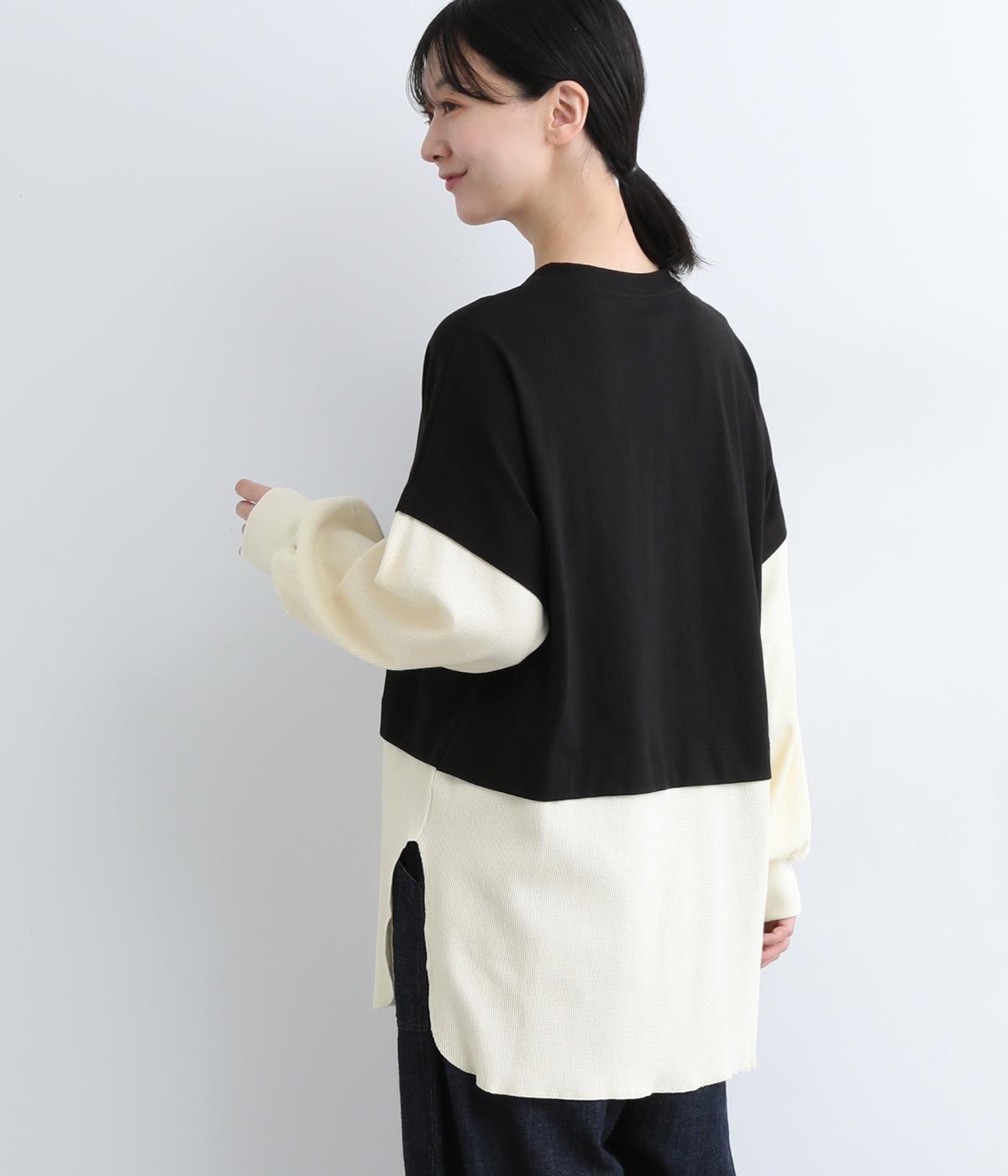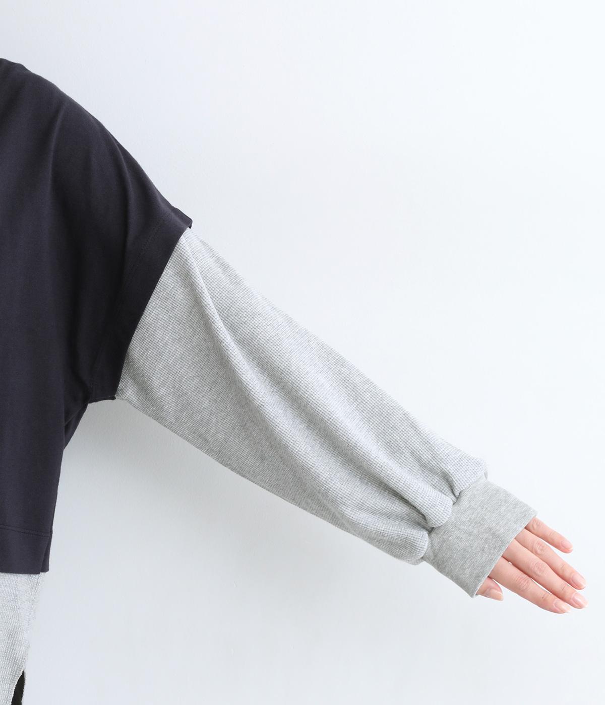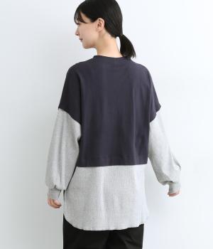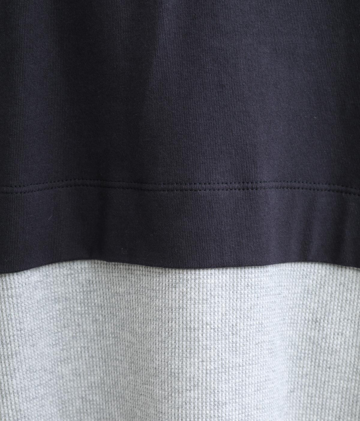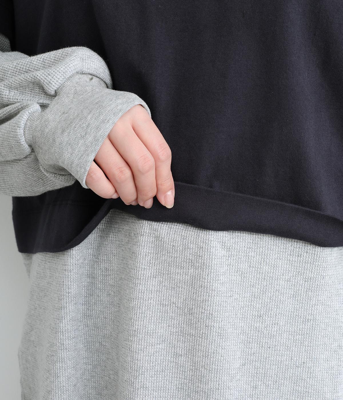 ほのかに起毛したあたたかみのある天竺と、ポコポコとした表面感が特徴的なサーマル生地を組み合わせました。重ね着ではなく切り替えているのでもたつきにくくすっきりとした落ち感があります。