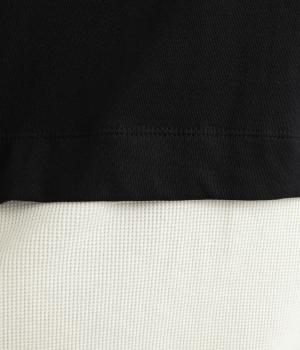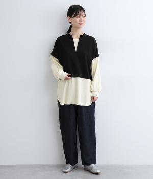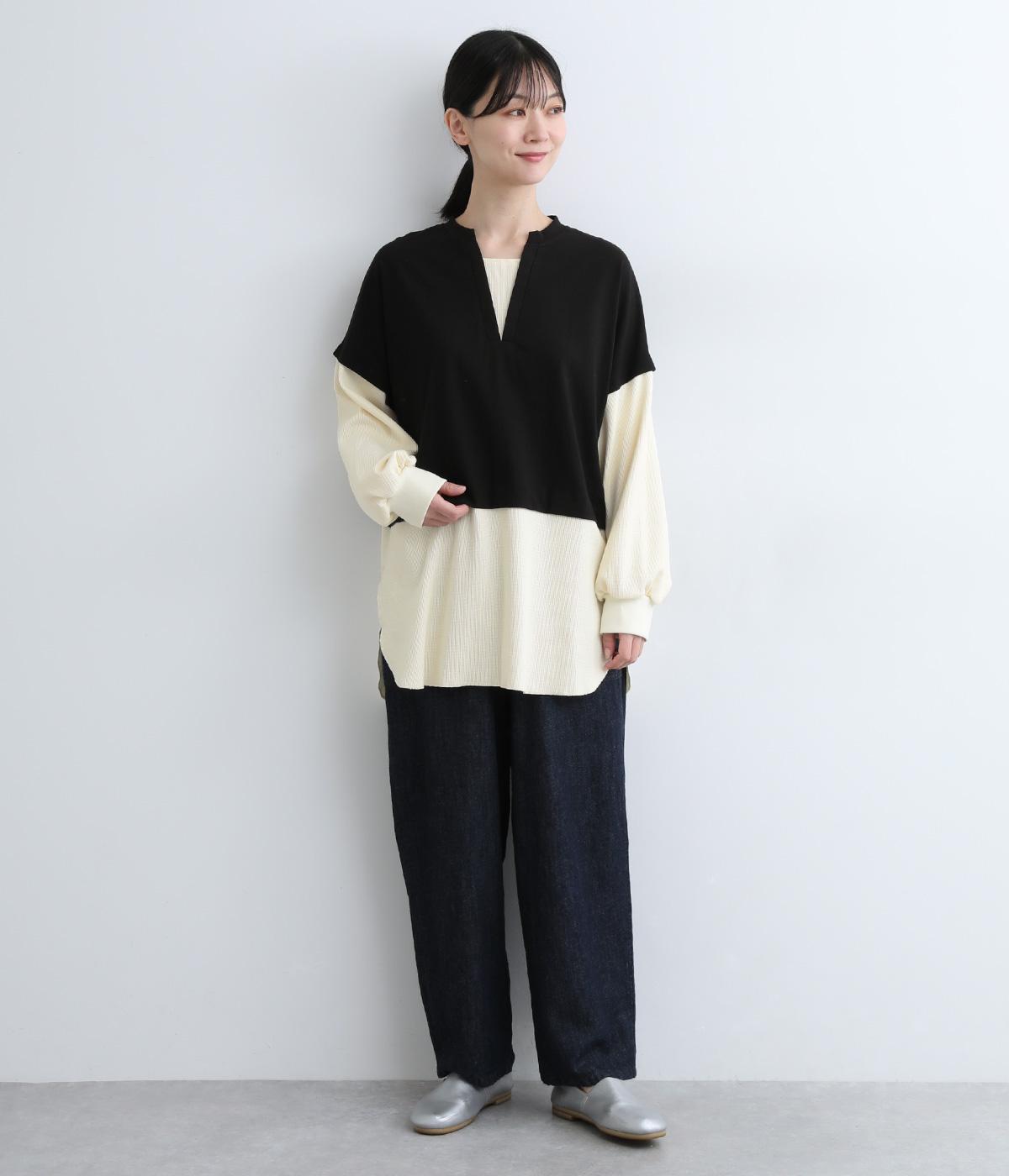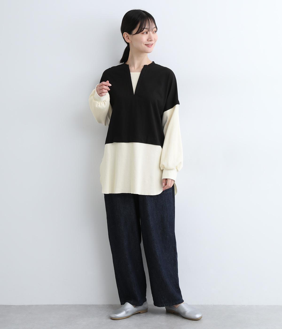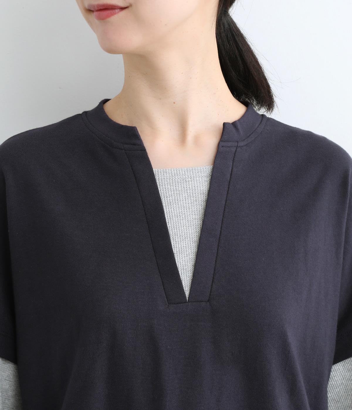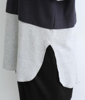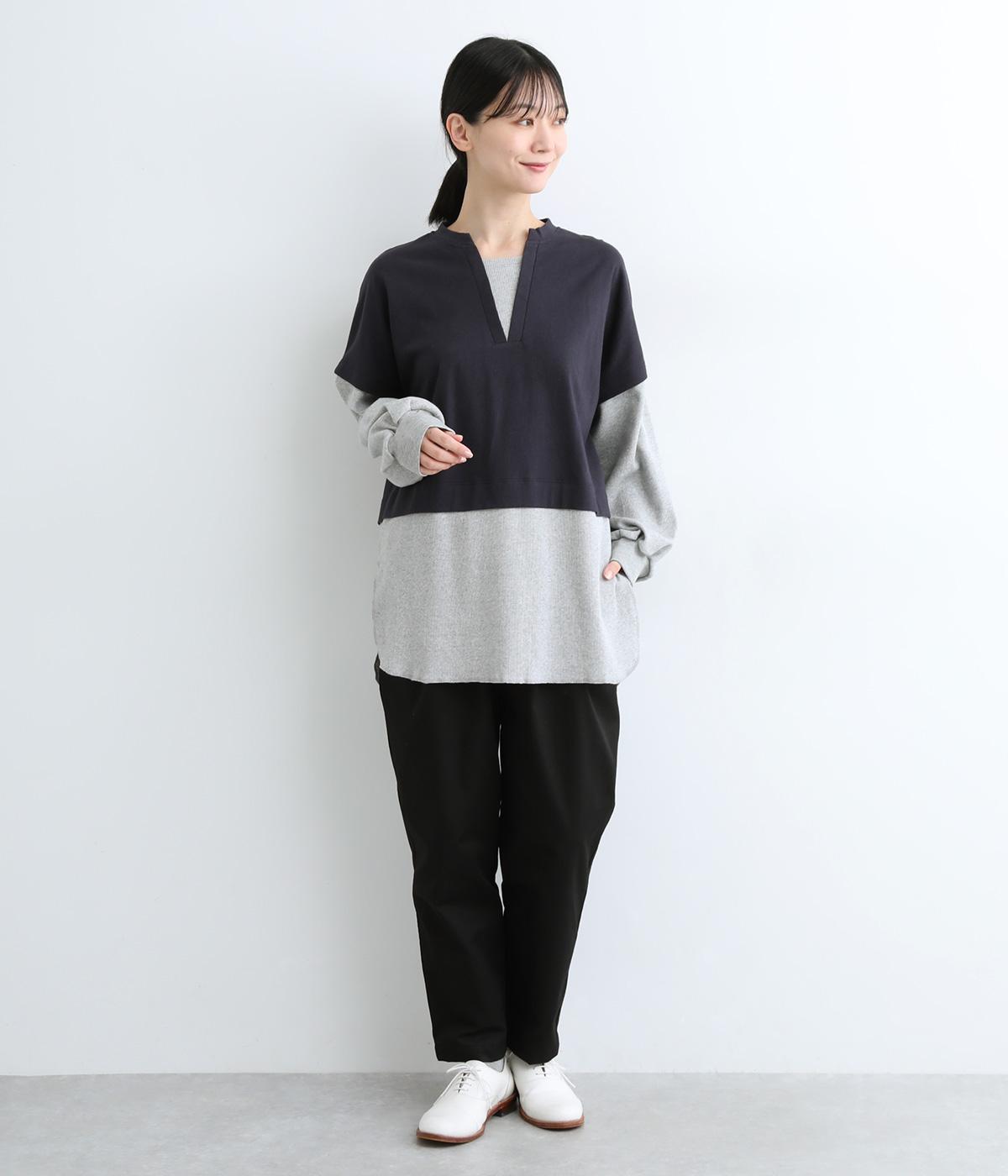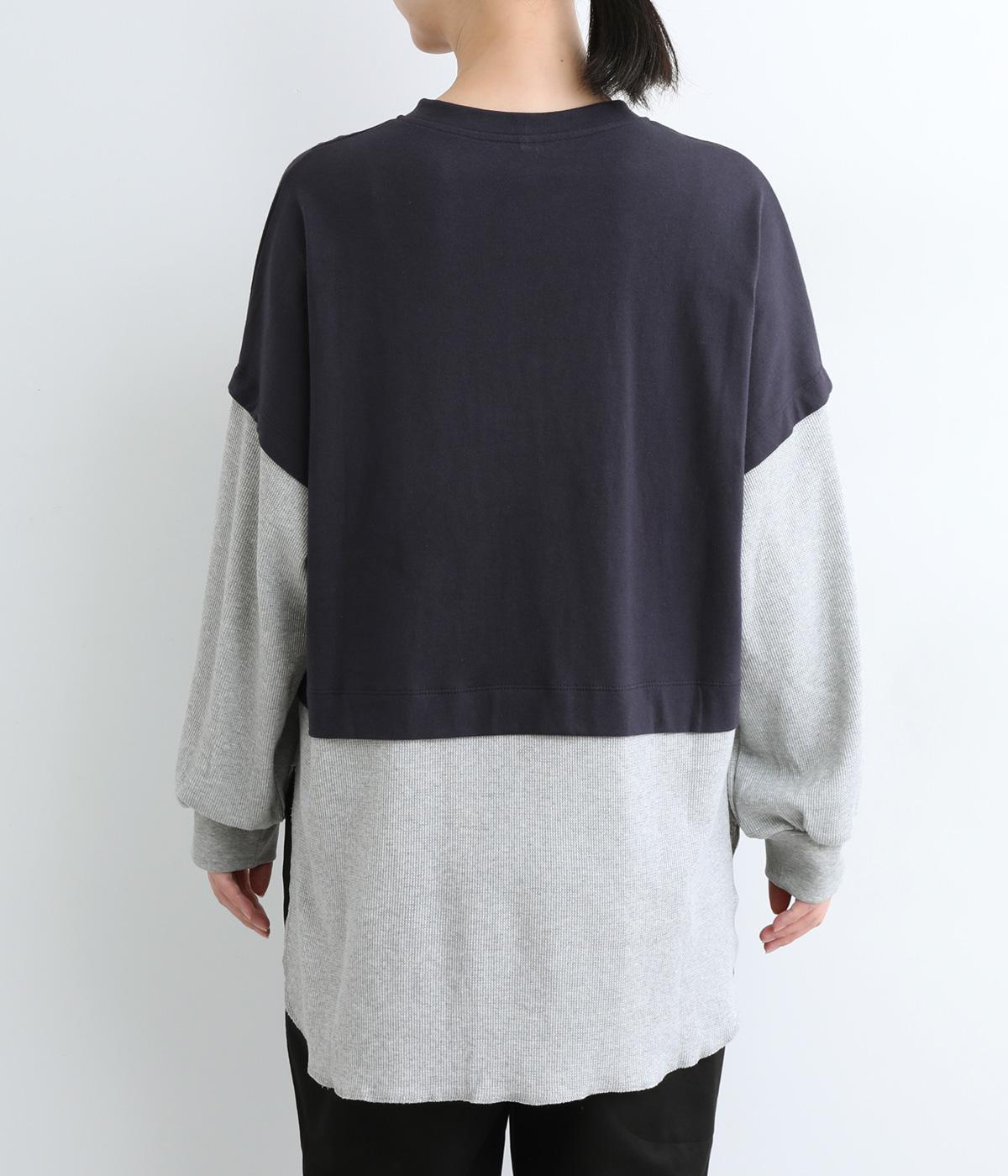 ほのかに起毛したあたたかみのある天竺と、ポコポコとした表面感が特徴的なサーマル生地を組み合わせました。重ね着ではなく切り替えているのでもたつきにくくすっきりとした落ち感があります。
