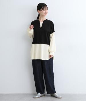 深Vネックのベストにプルオーバーを重ねたようなデザインが特徴。袖口にギャザーを寄せたボリュームスリーブがリラックスムード。長めの着丈のラウンドヘムは、脇位置を高めに設定してバランスをとりました。一枚着でレイヤード風スタイルが叶います。