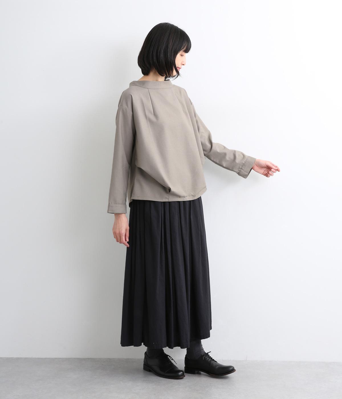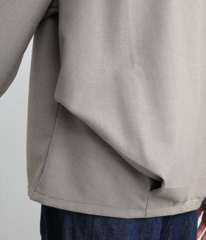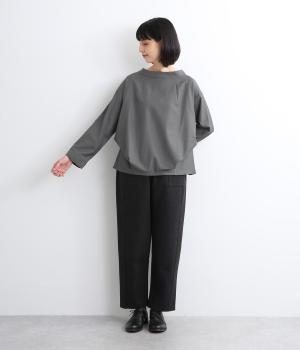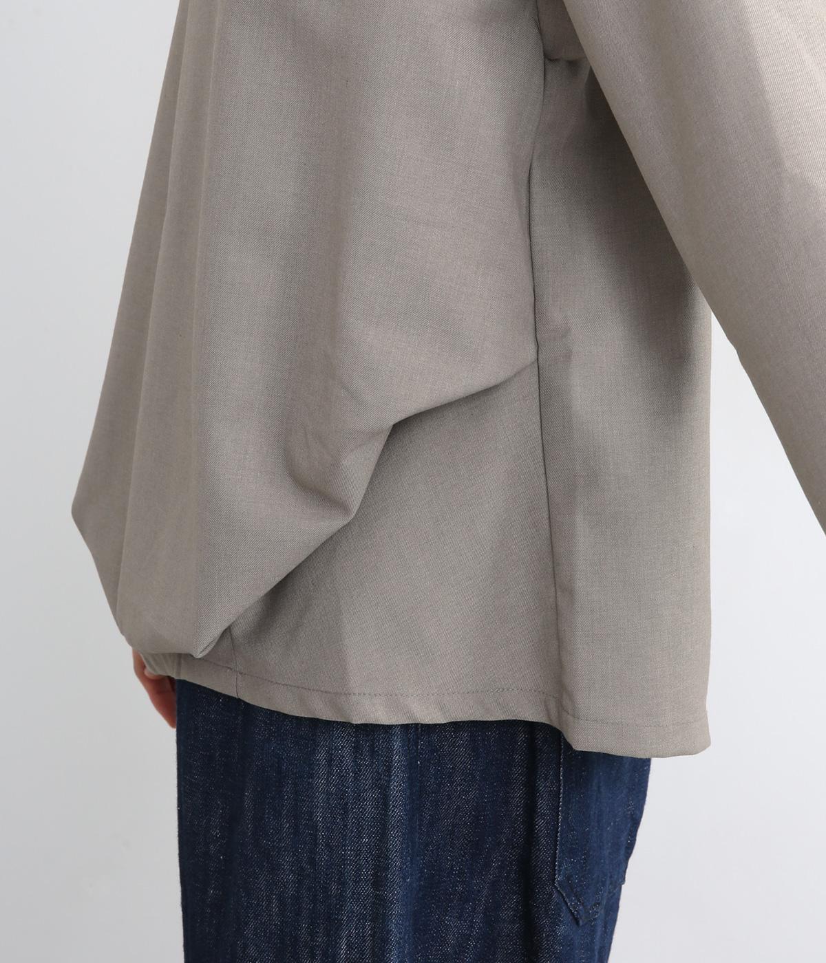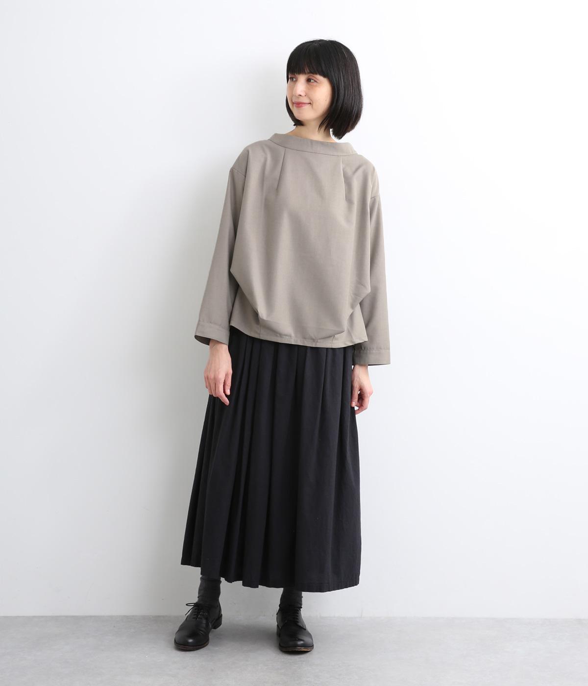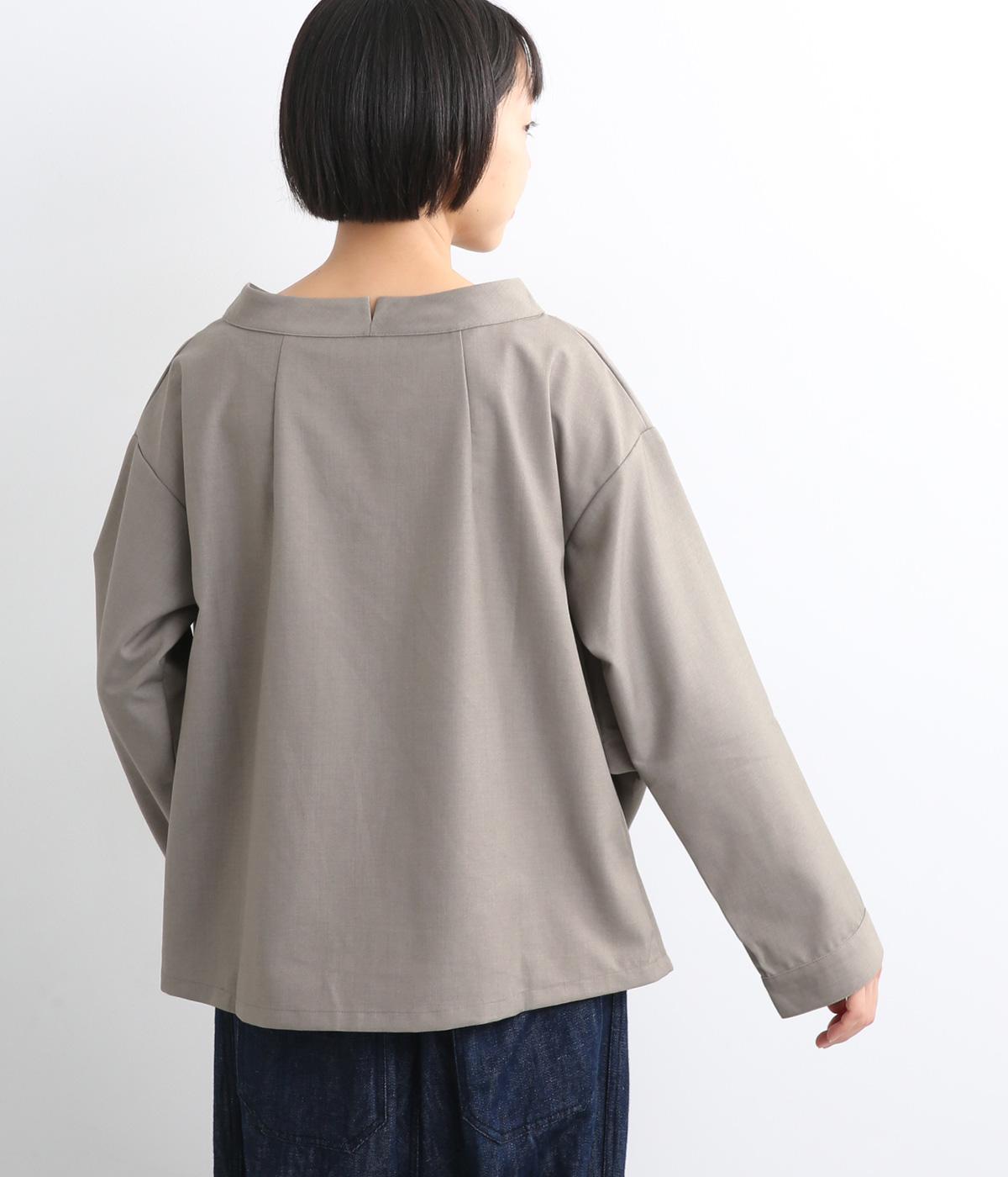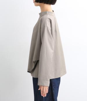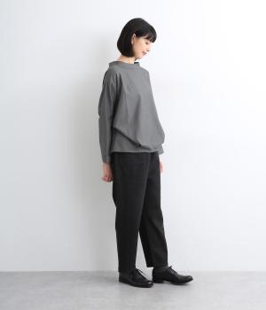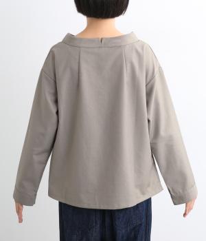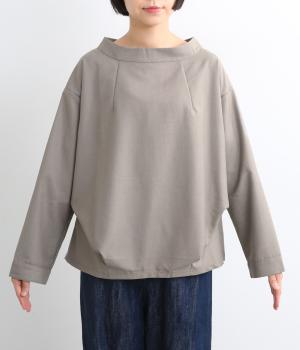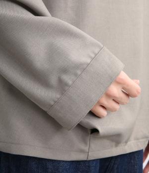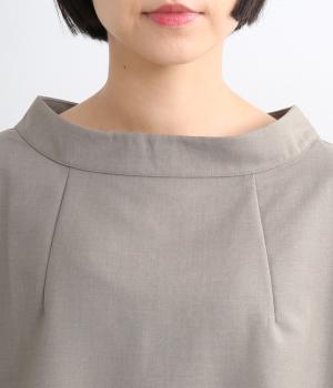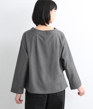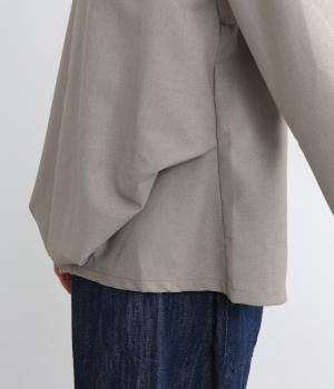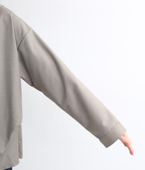 裾や脇に変形タックをほどこし、まるでタックインしているようなシルエットが着映えする一枚。立ち上げた襟は後ろにスリットを入れ、背中まわりもきれいに見せてくれます。袖はあえてストレートにしてすっきり感を演出。品が良く、きちんと見えも叶えます。