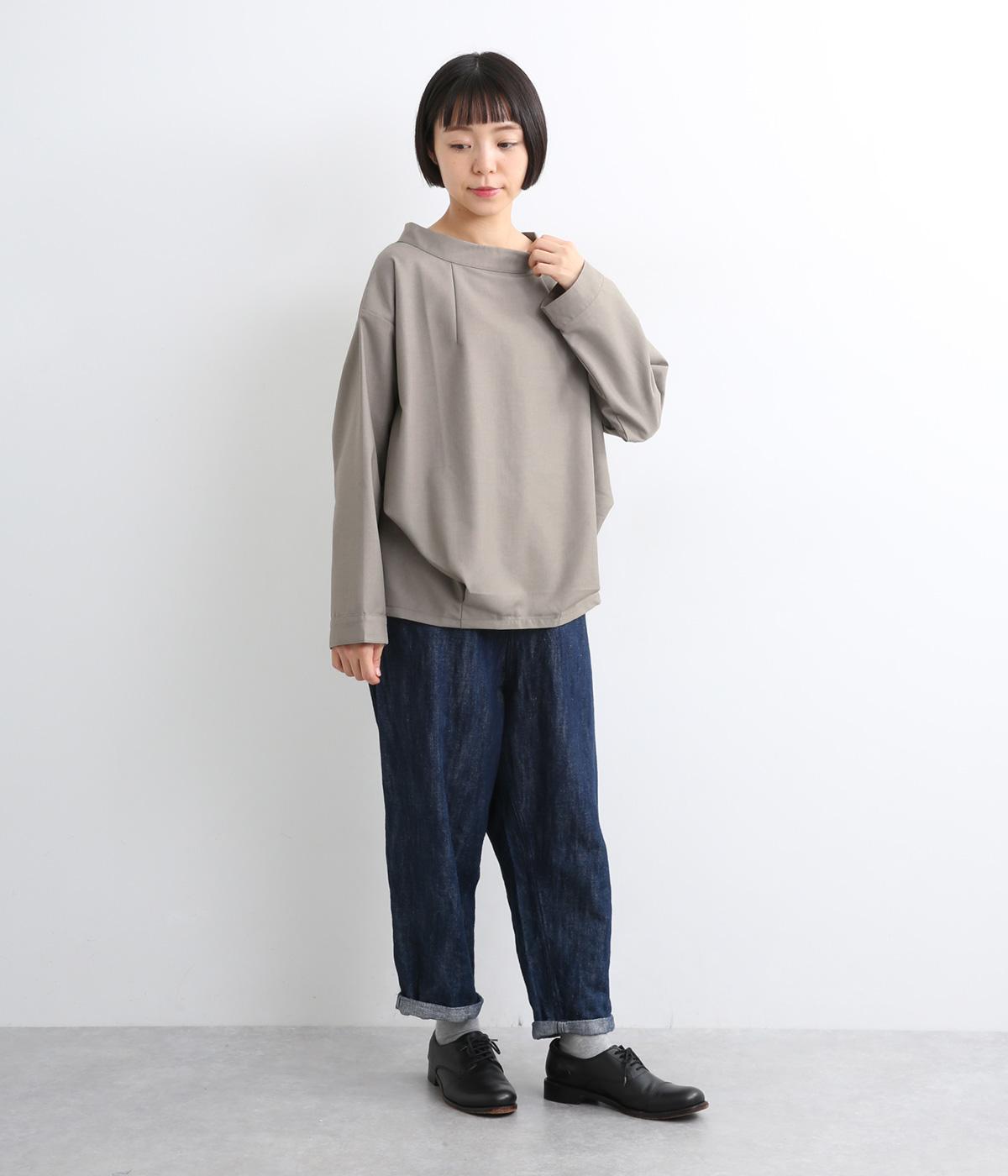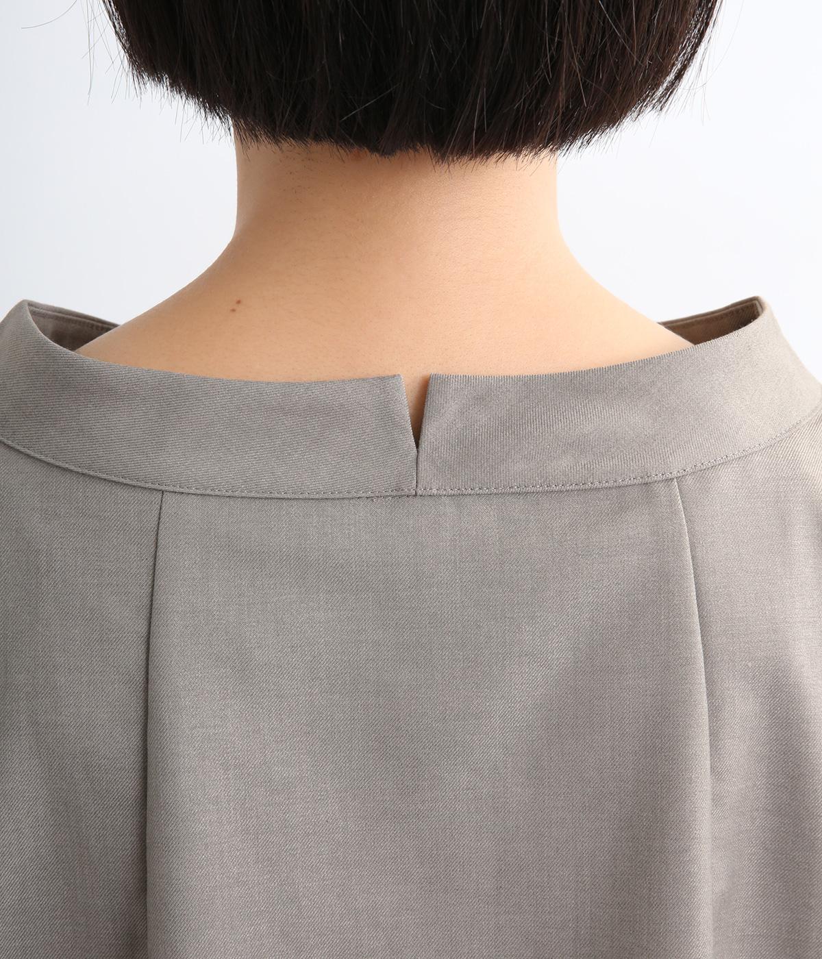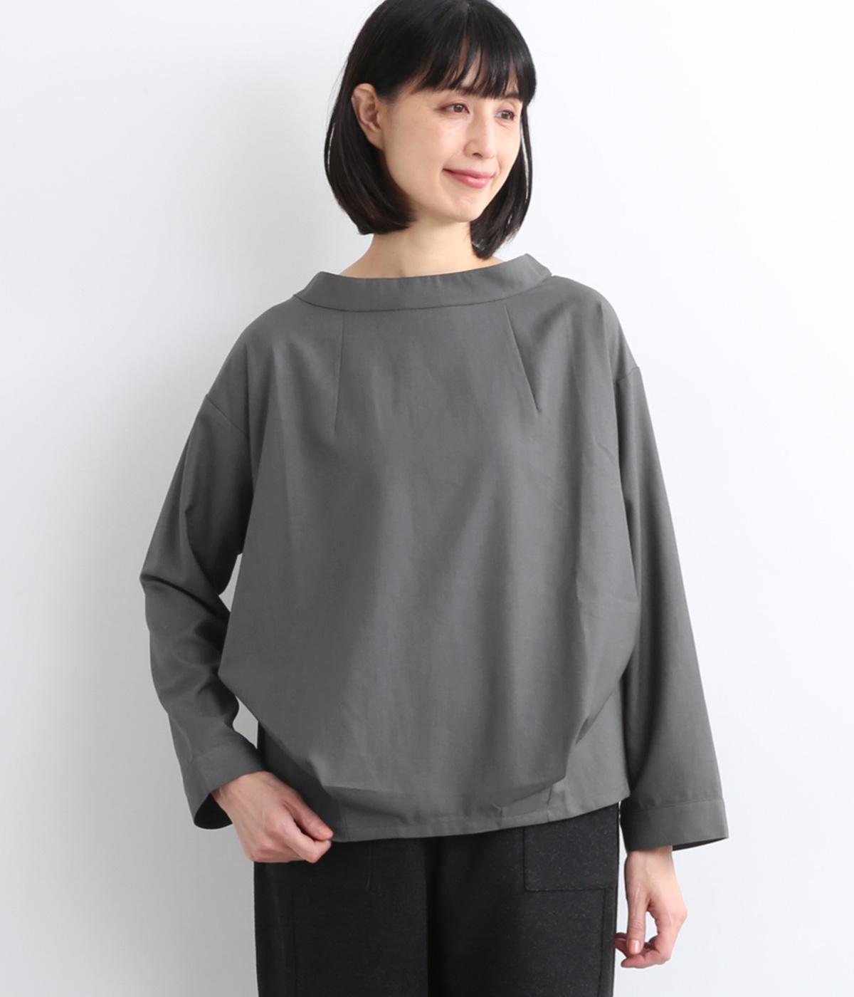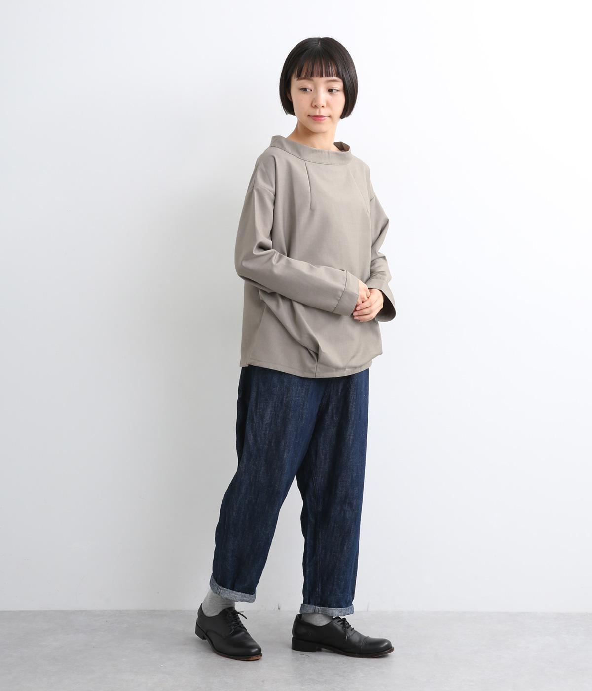 裾や脇に変形タックをほどこし、まるでタックインしているようなシルエットが着映えする一枚。立ち上げた襟は後ろにスリットを入れ、背中まわりもきれいに見せてくれます。袖はあえてストレートにしてすっきり感を演出。品が良く、きちんと見えも叶えます。