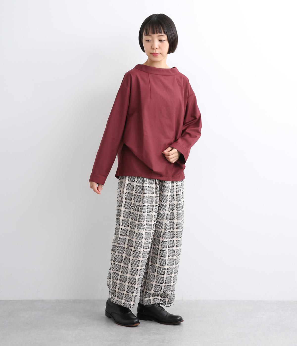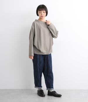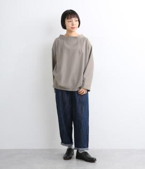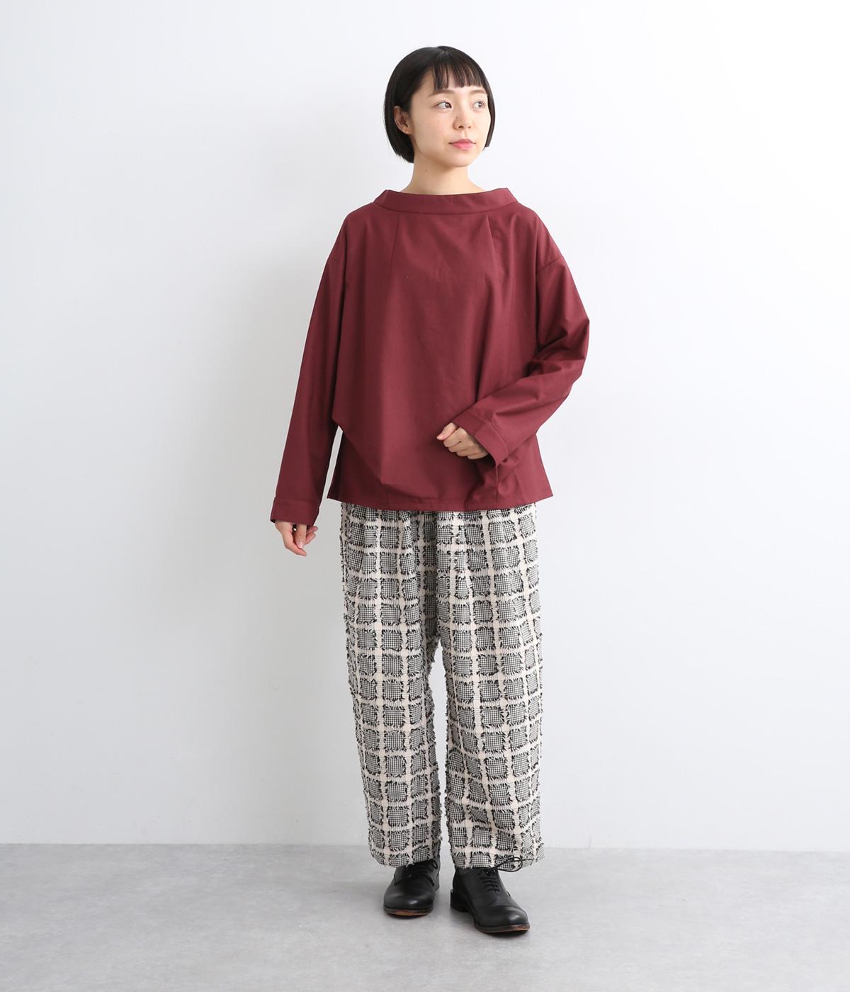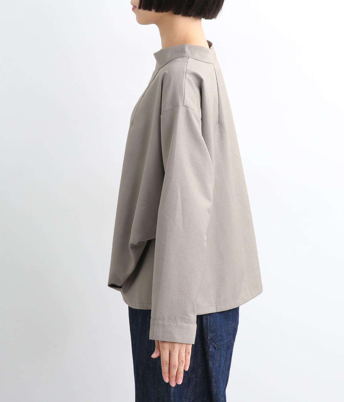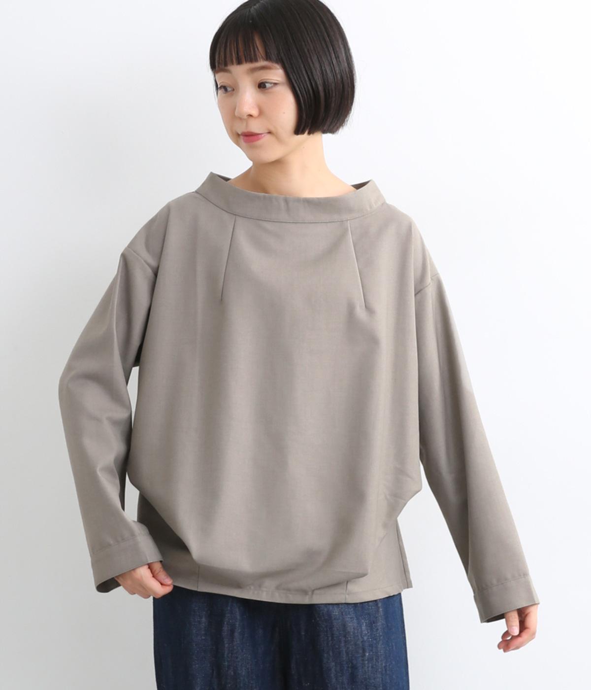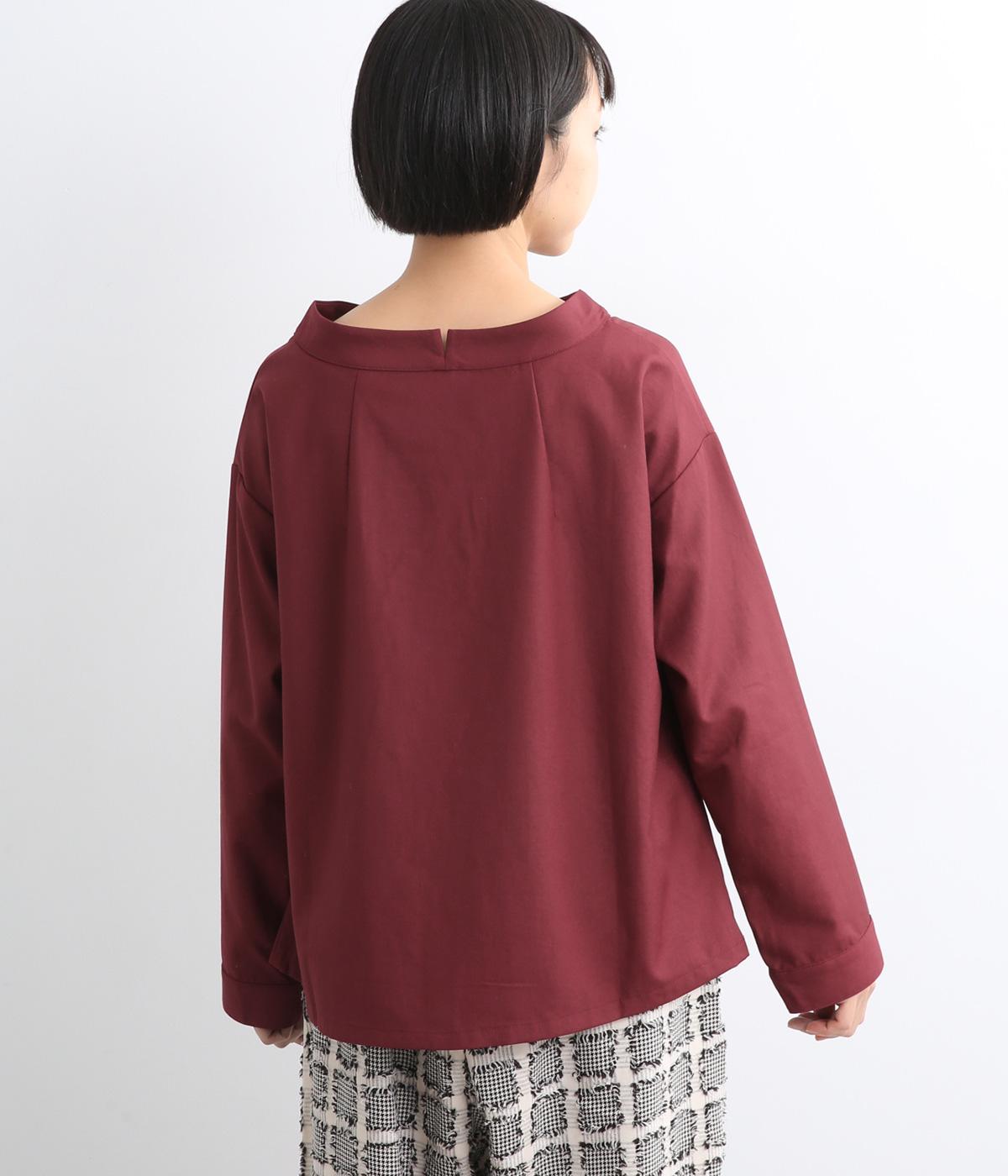 裾や脇に変形タックをほどこし、まるでタックインしているようなシルエットが着映えする一枚。立ち上げた襟は後ろにスリットを入れ、背中まわりもきれいに見せてくれます。袖はあえてストレートにしてすっきり感を演出。品が良く、きちんと見えも叶えます。