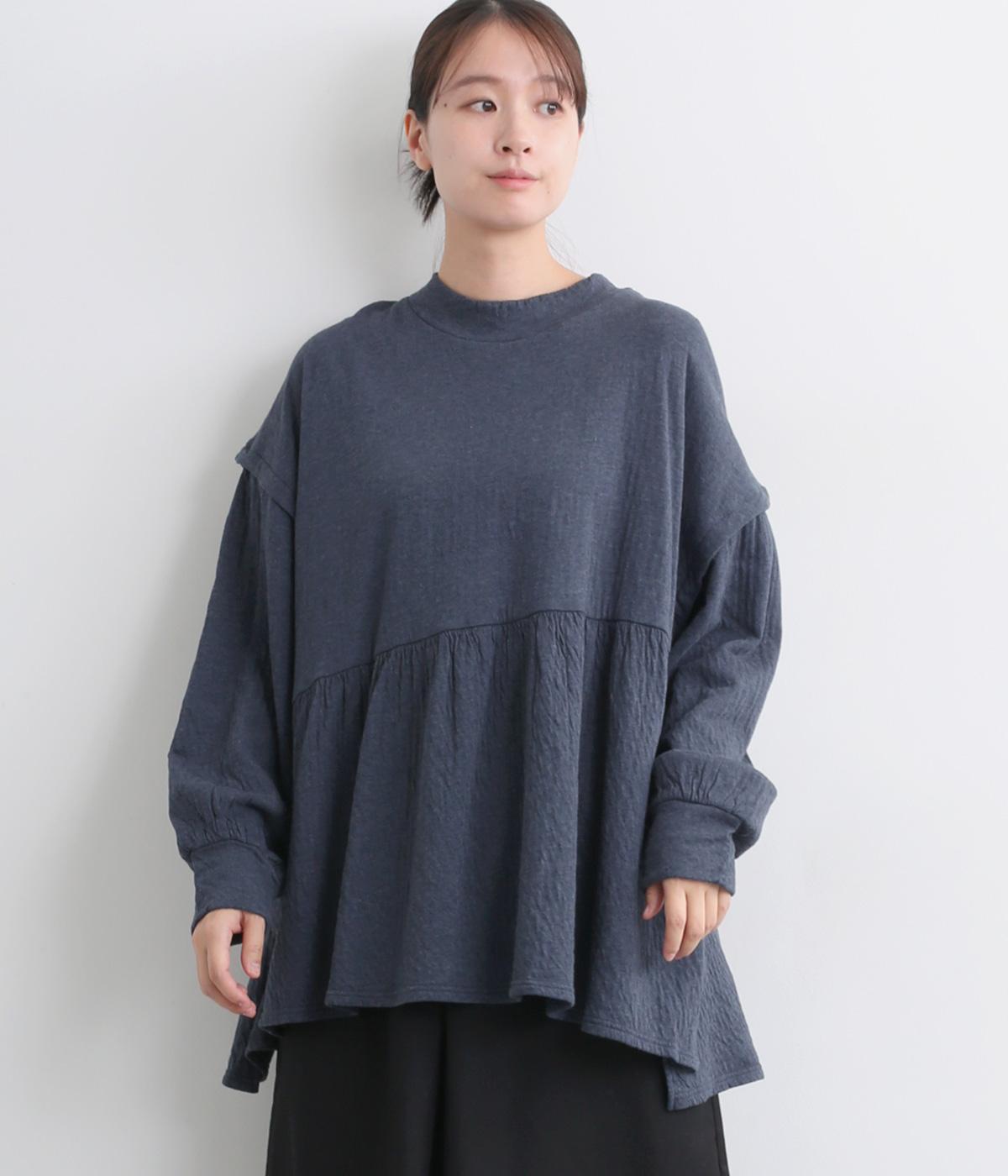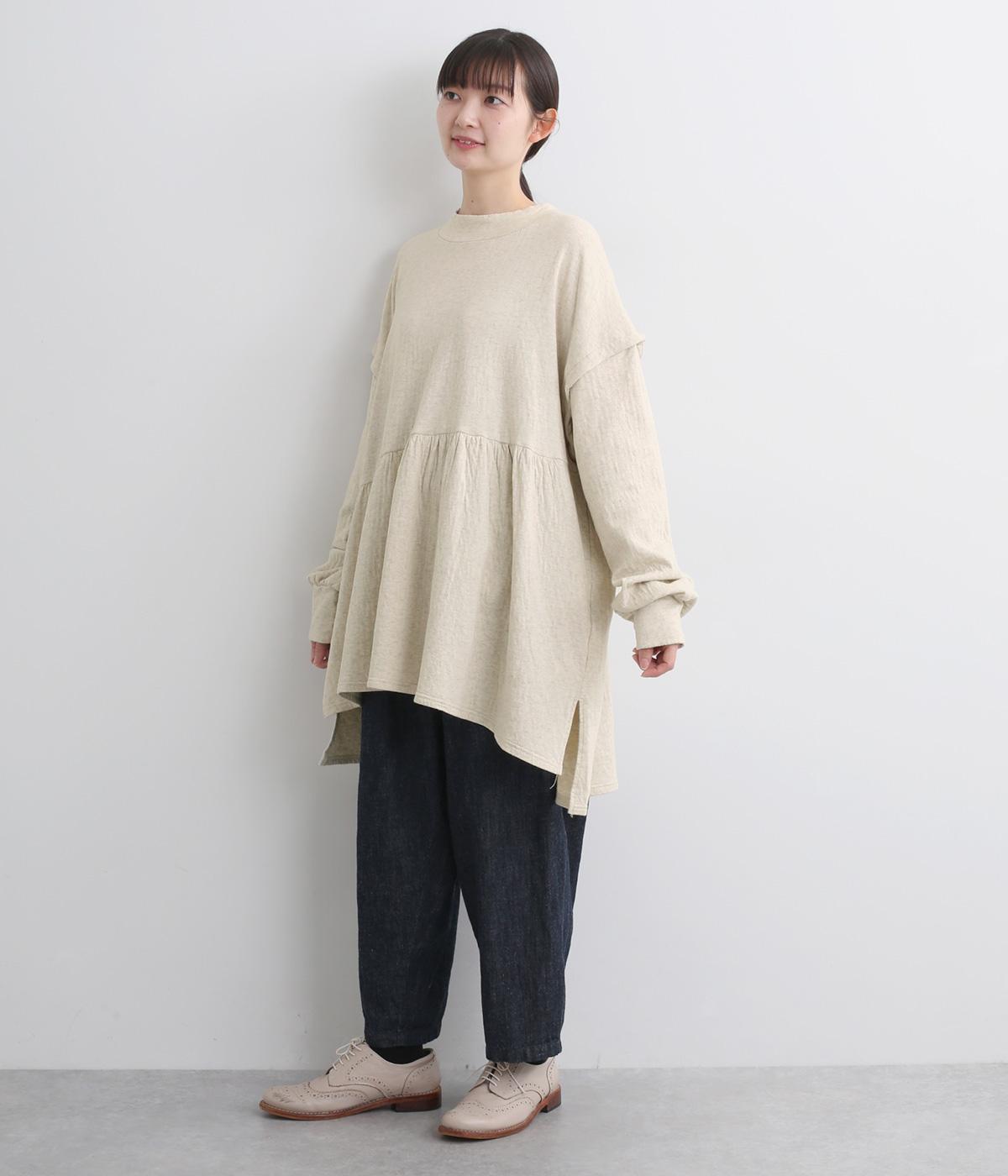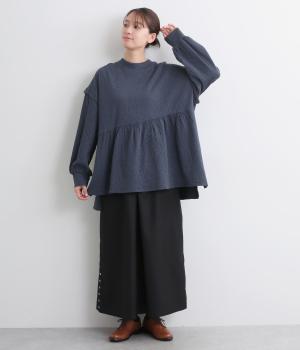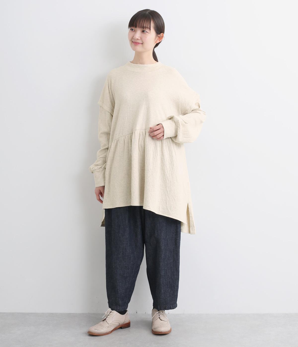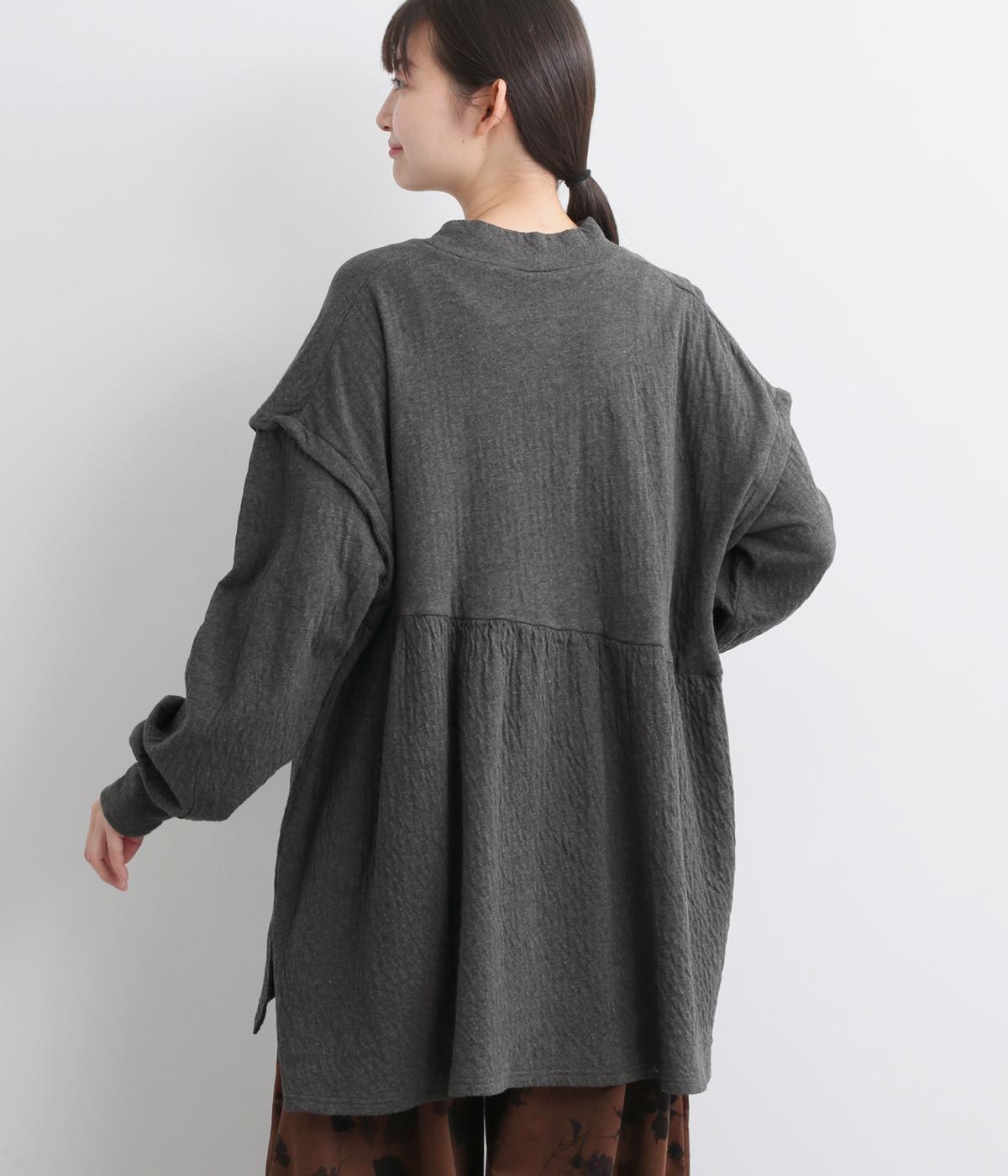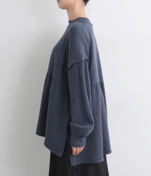肩にアクセントをつけたドロップショルダーや、ほどよいハイネックで品のよさを演出。ウエストからのギャザーによる美しいドレープが、お腹まわりのカバーも叶えてくれます。シンプルながら細やかなディテールが光る、こだわりの1枚です。