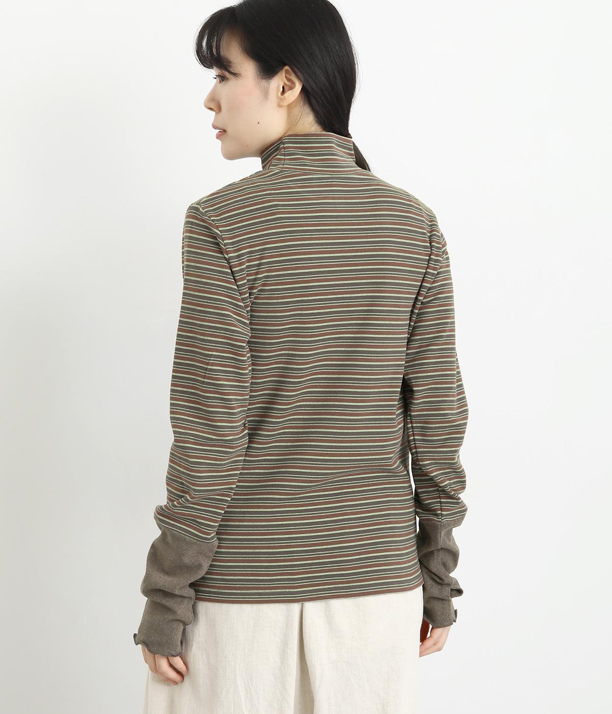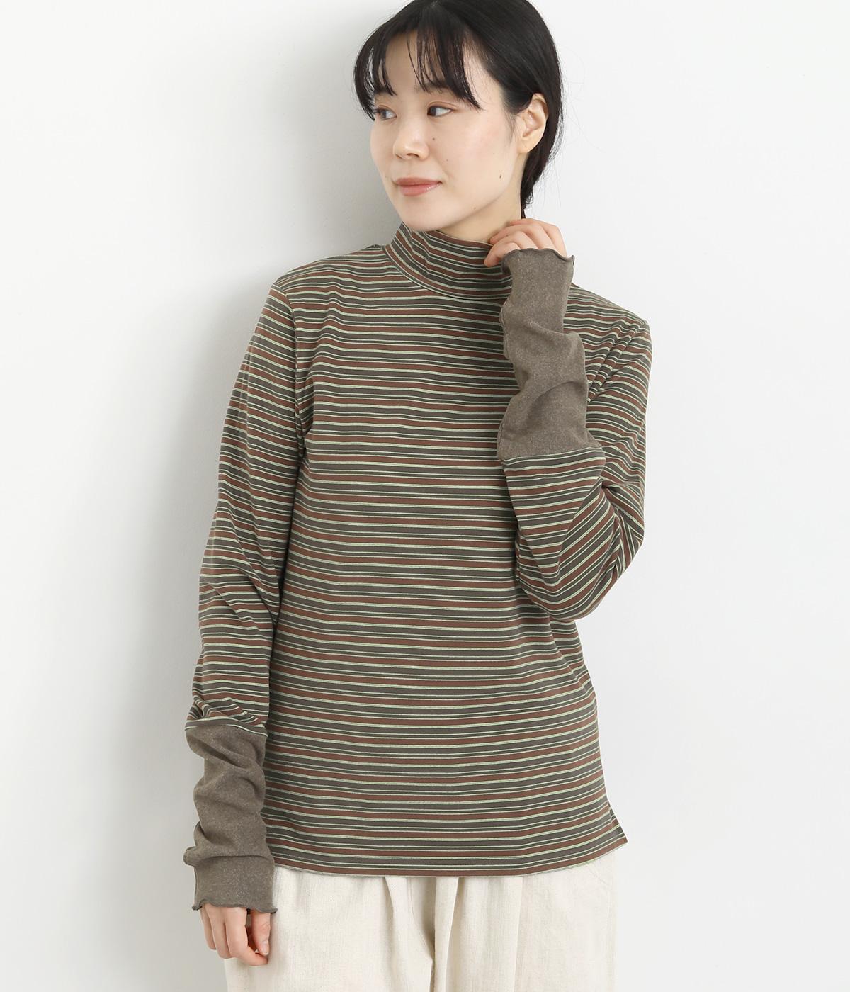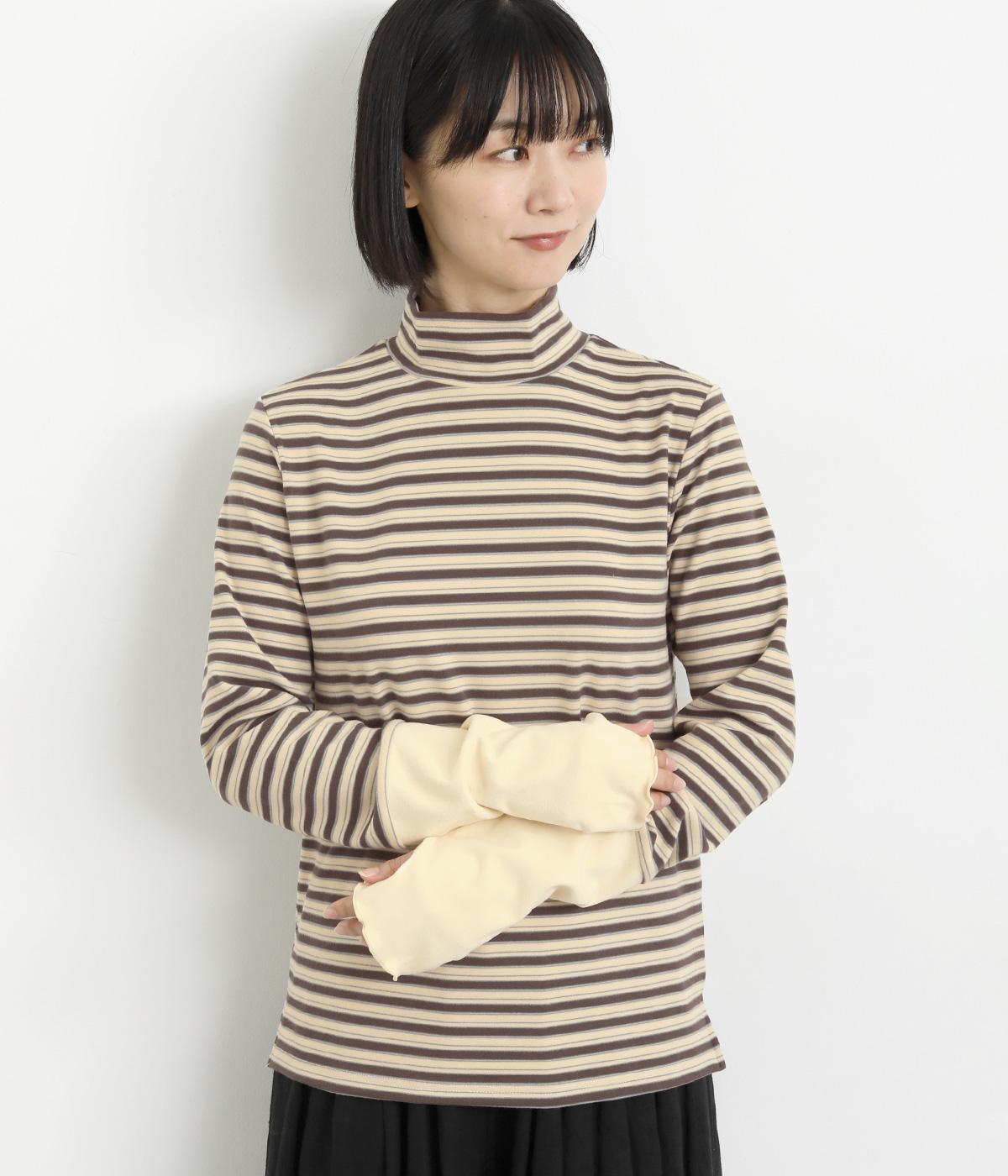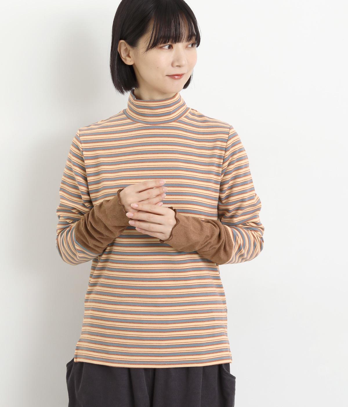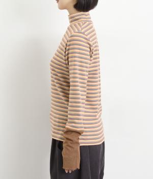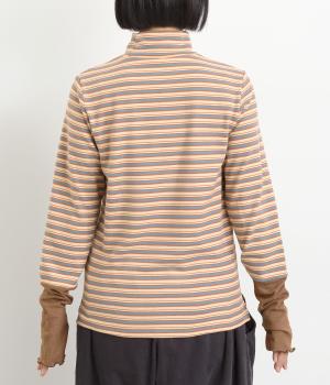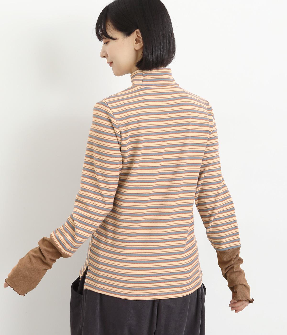 アームウォーマーを重ねているような、袖のデザインが特徴的なプルオーバー。カジュアルスタイルに映えるマルチボーダー柄で、首元も手先もあたためてくれるので防寒アイテムとしても活躍。袖口はメロウ始末でかわいらしいニュアンスに。