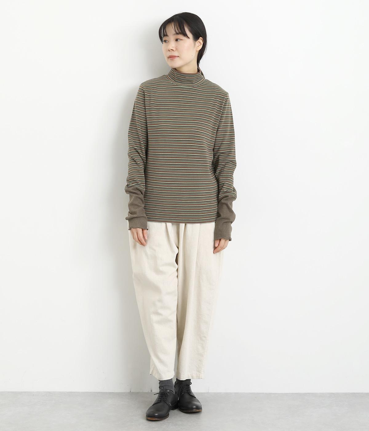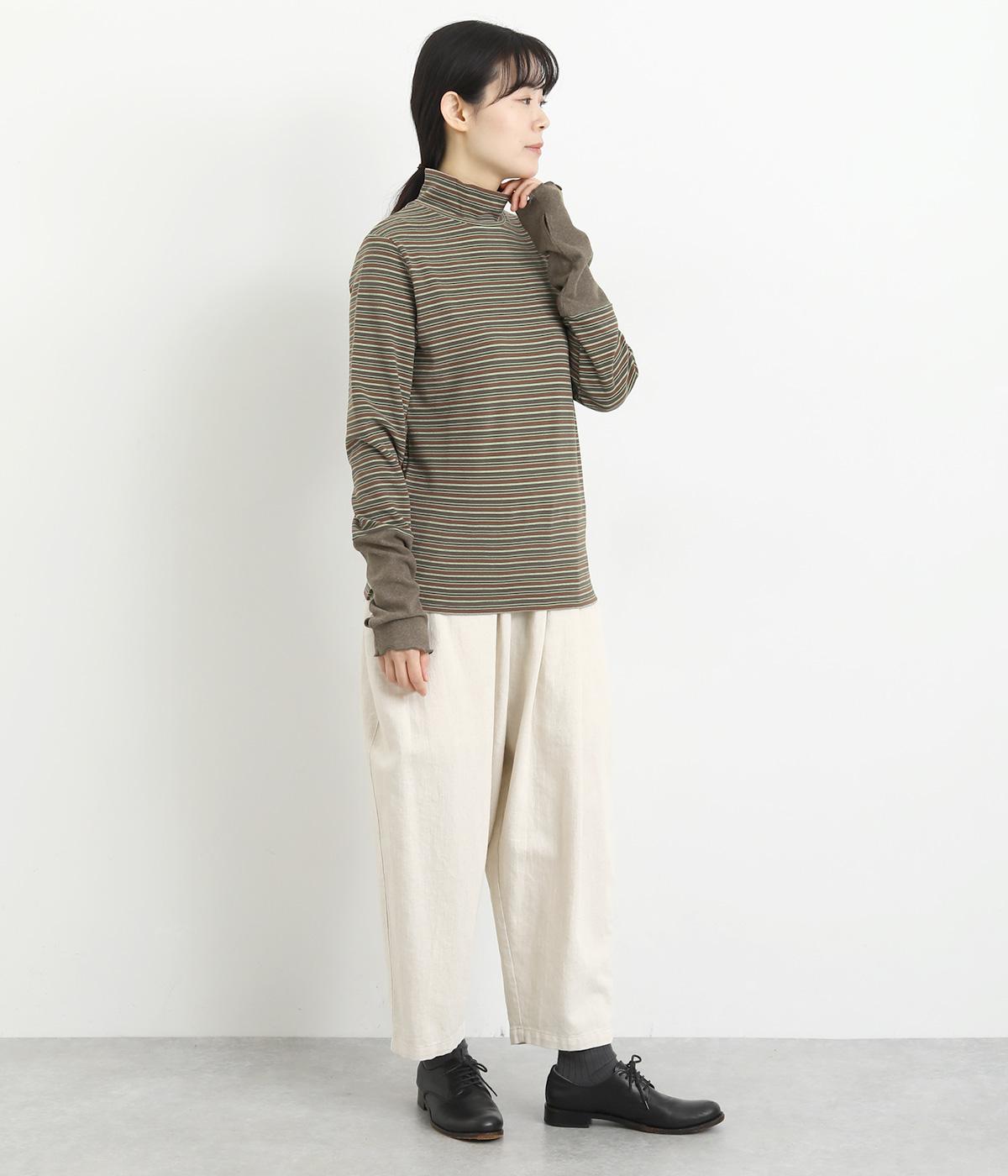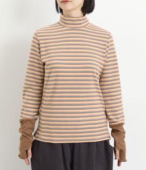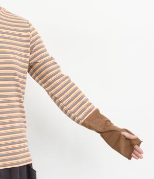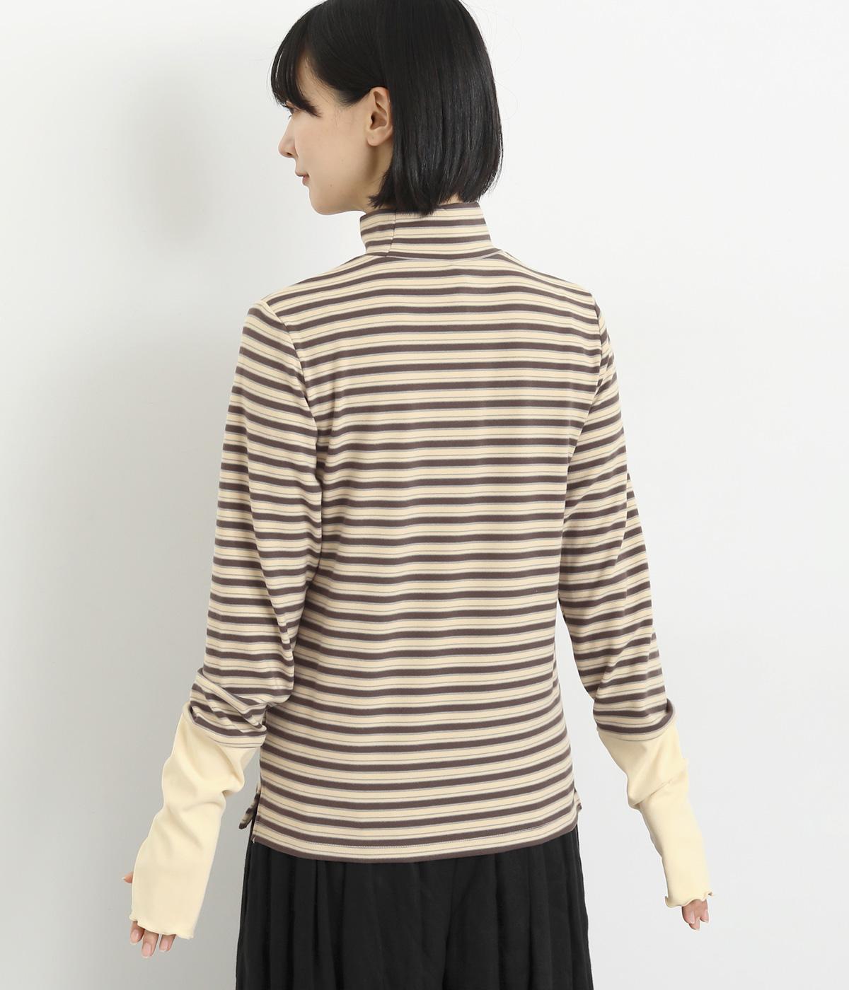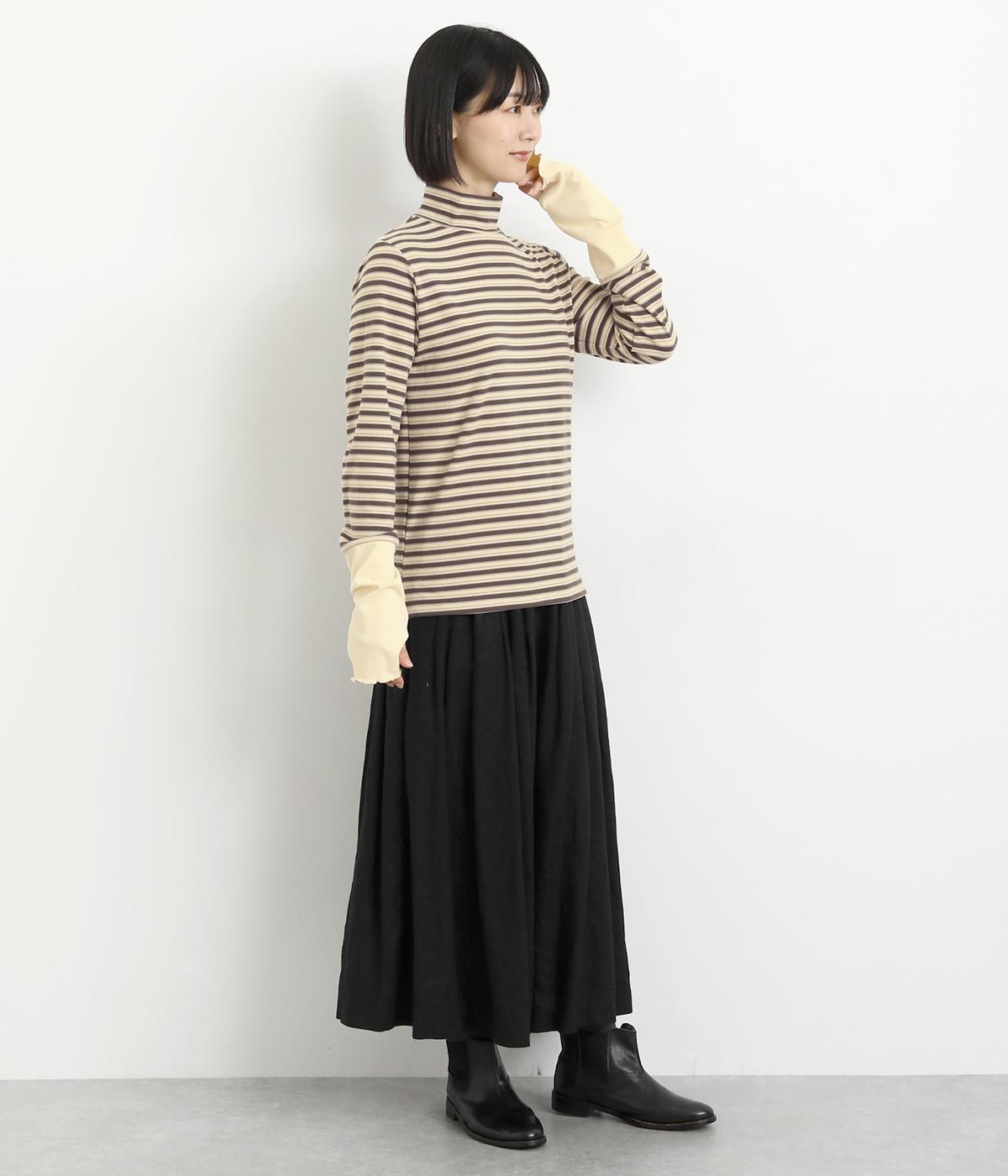 アームウォーマーを重ねているような、袖のデザインが特徴的なプルオーバー。カジュアルスタイルに映えるマルチボーダー柄で、首元も手先もあたためてくれるので防寒アイテムとしても活躍。袖口はメロウ始末でかわいらしいニュアンスに。