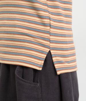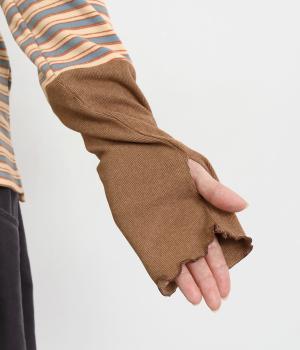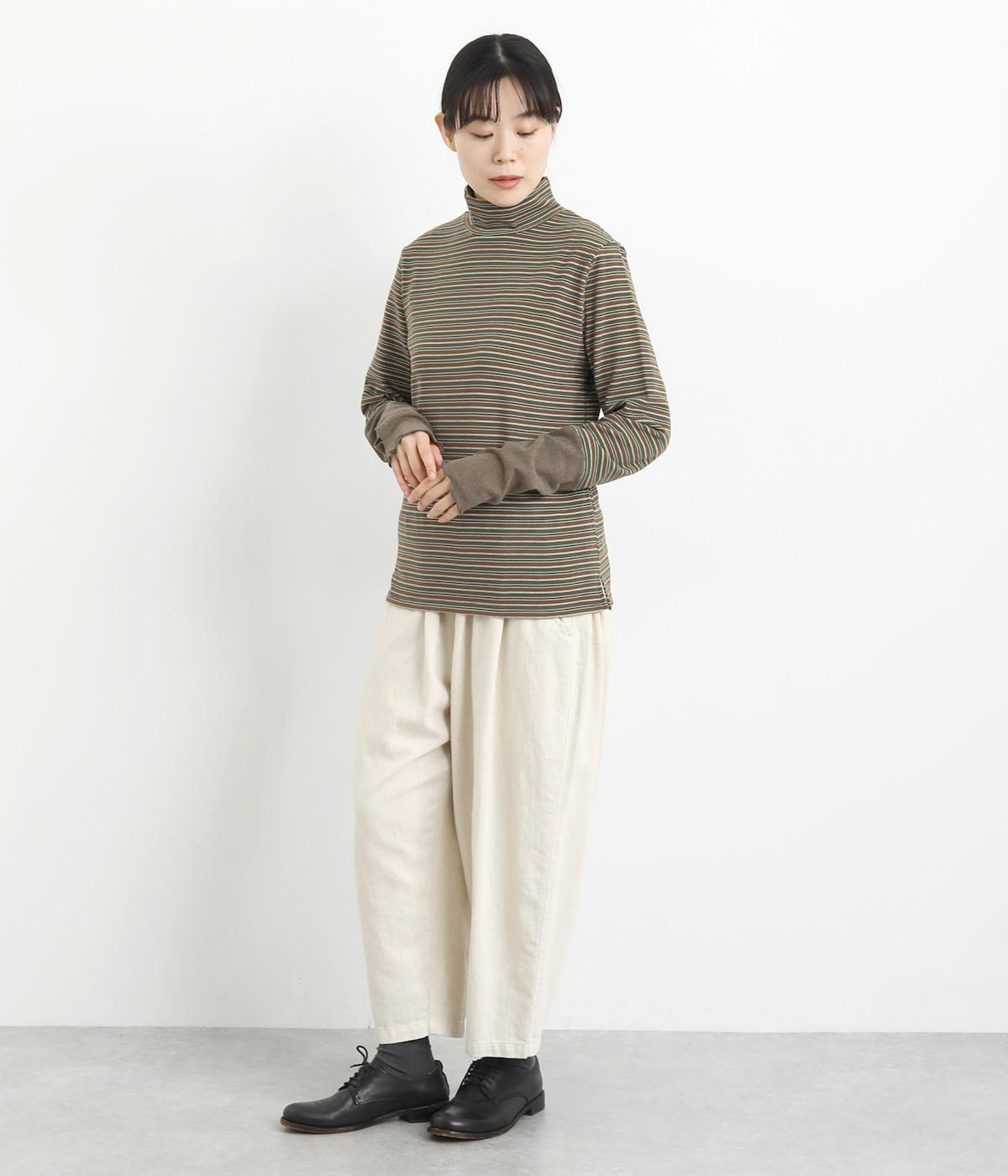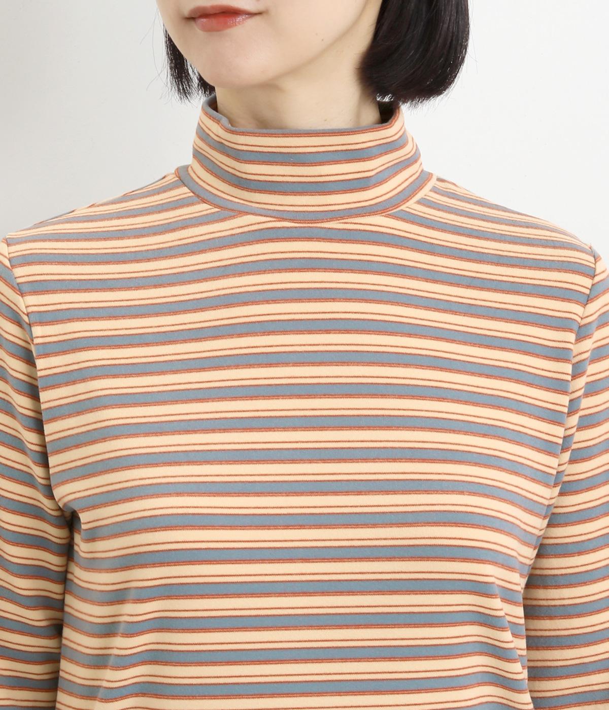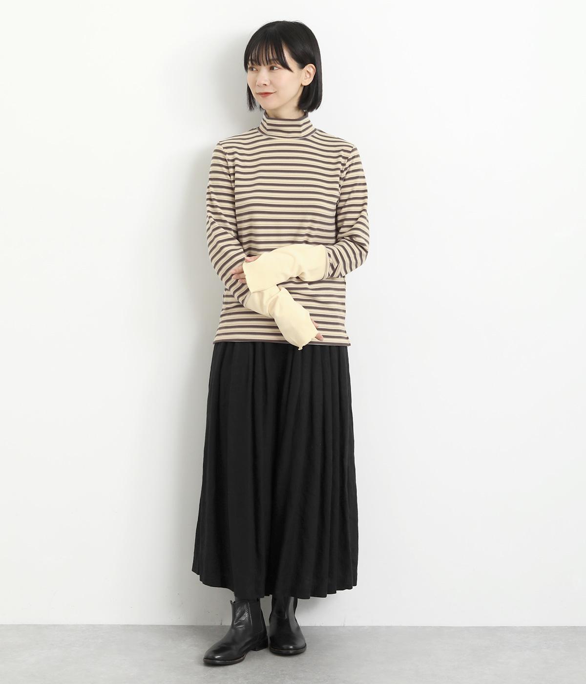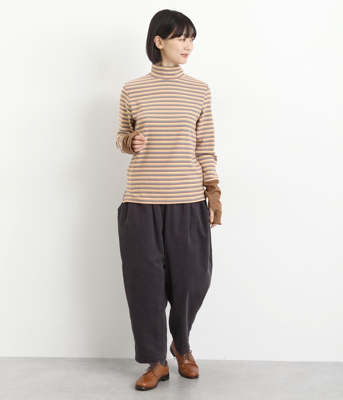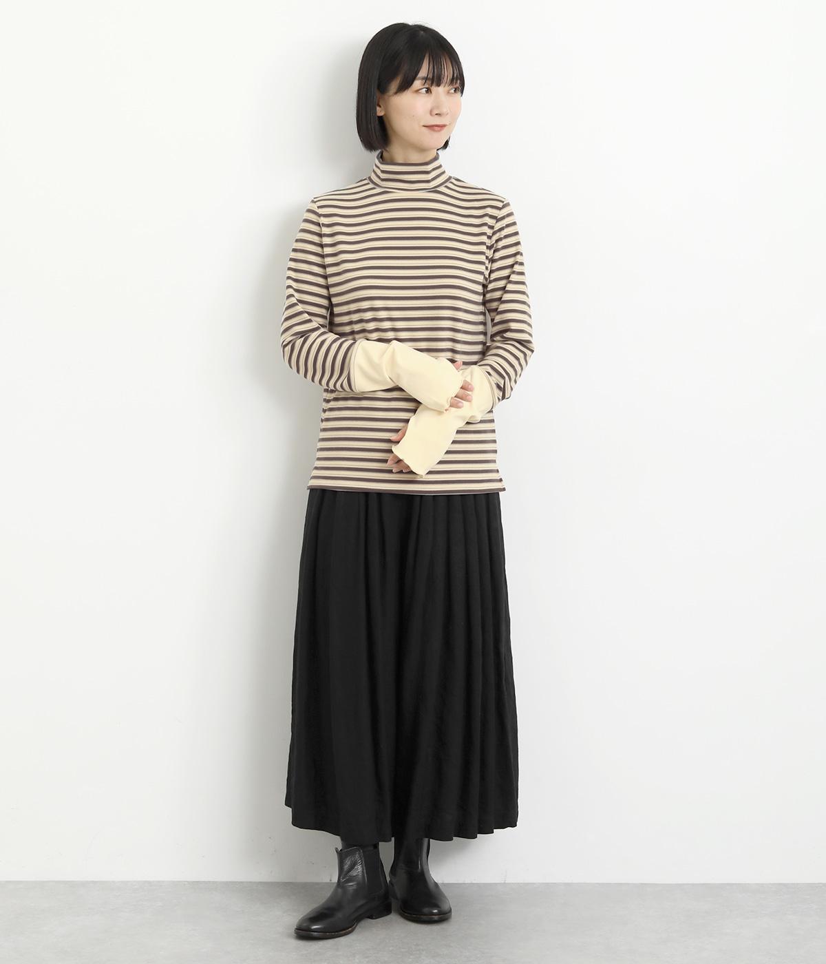 アームウォーマーを重ねているような、袖のデザインが特徴的なプルオーバー。カジュアルスタイルに映えるマルチボーダー柄で、首元も手先もあたためてくれるので防寒アイテムとしても活躍。袖口はメロウ始末でかわいらしいニュアンスに。