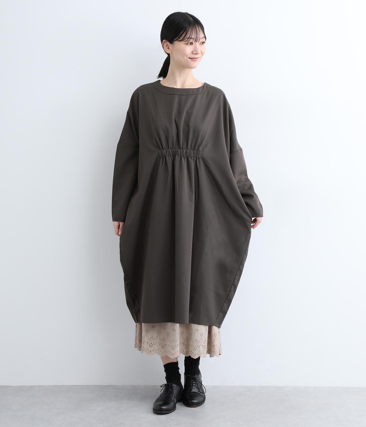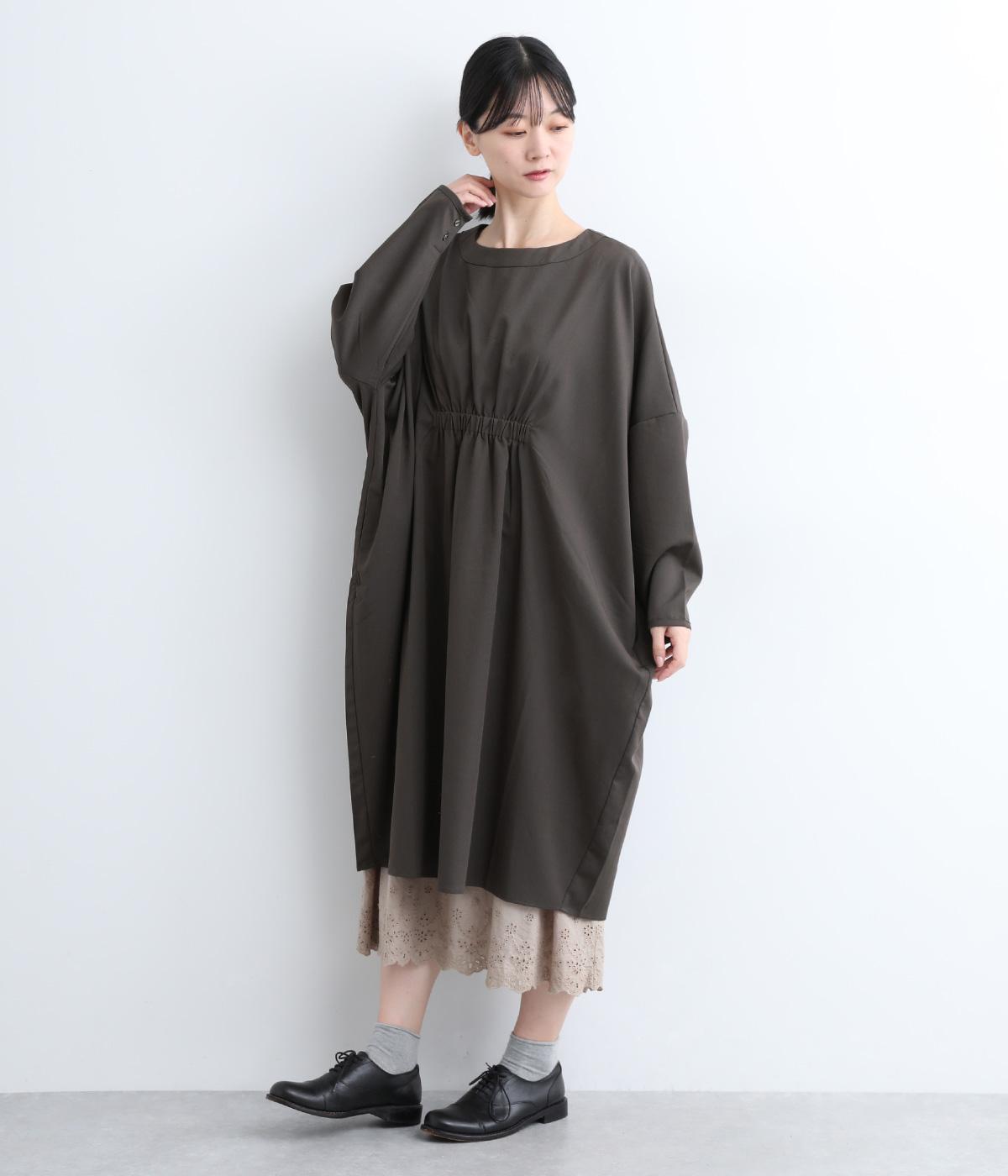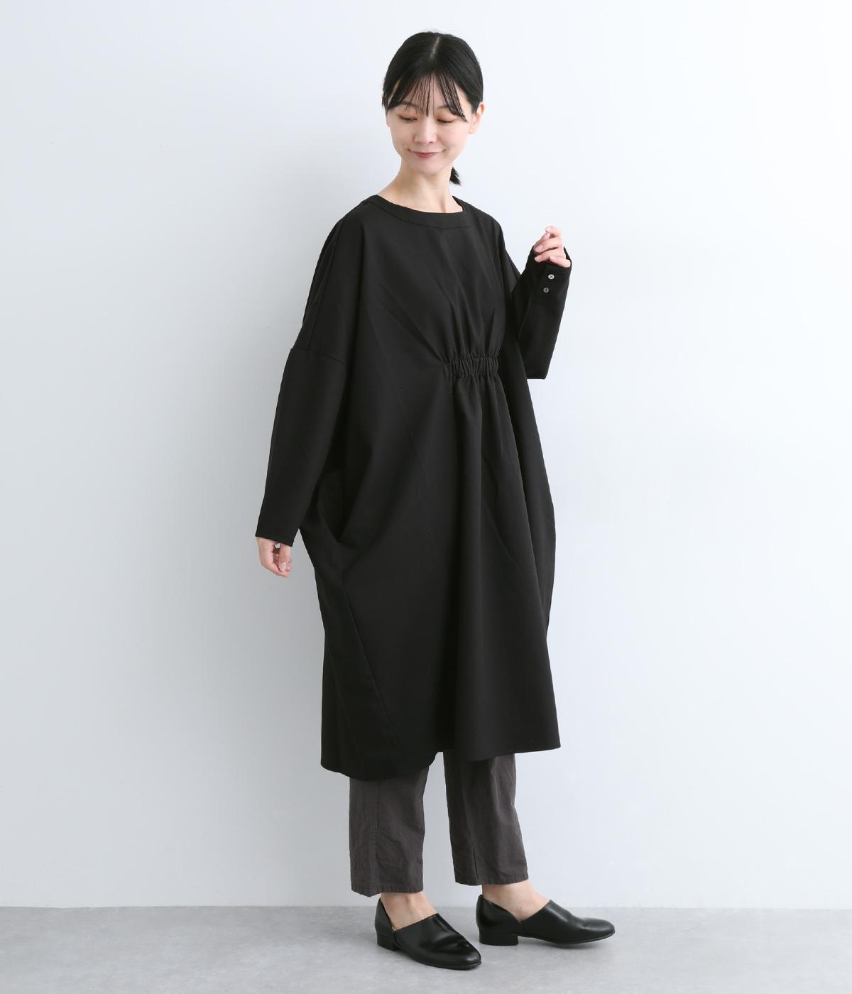ウエストにギャザーディテールを取り入れたきれいめなワンピースです。体のシルエットを拾いにくいゆるやかなコクーンシルエットが着心地よく、ボトム合わせがたのしめる着丈に。袖口のボタンをあけてラフに折り返し、適度に抜け感を持たせるのもおすすめ。