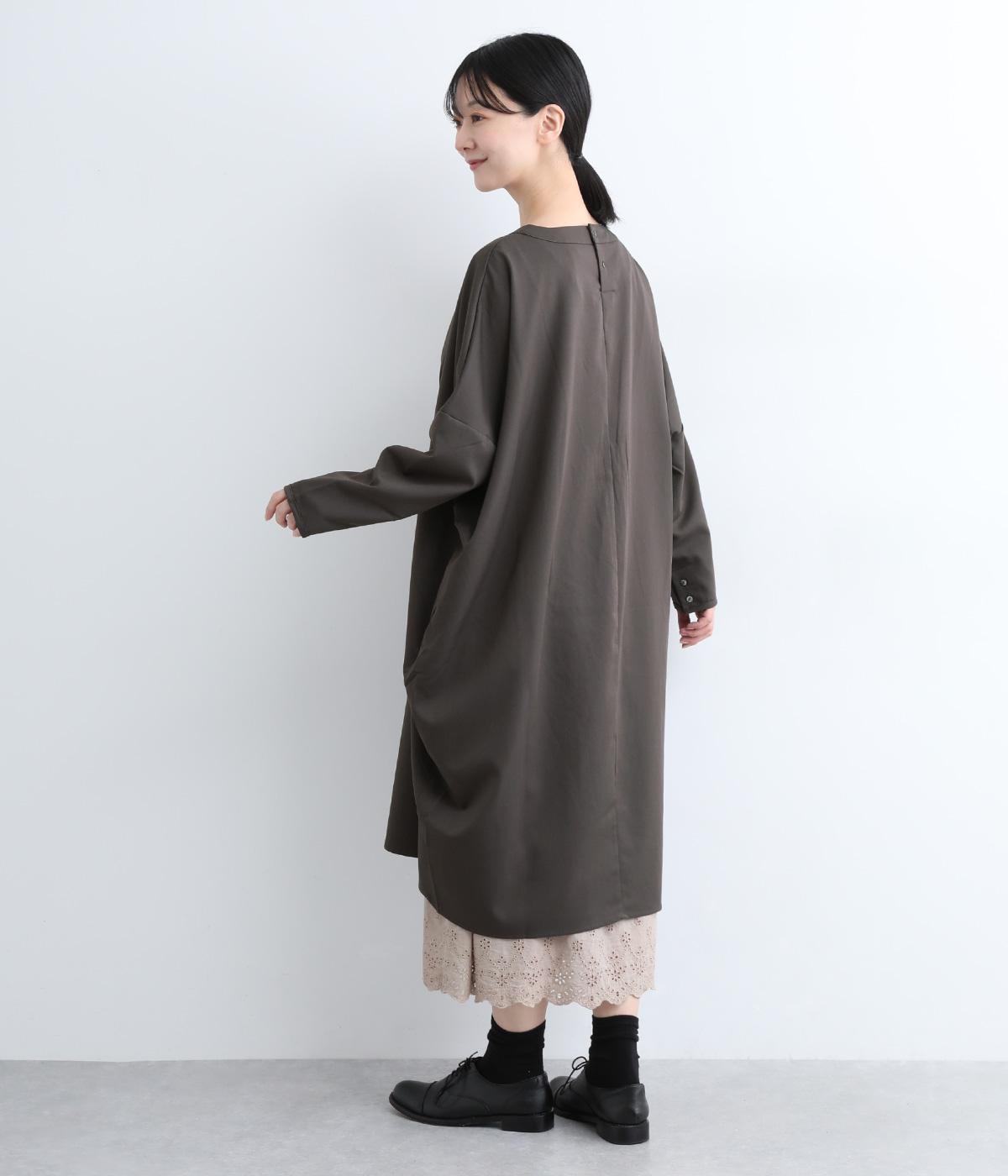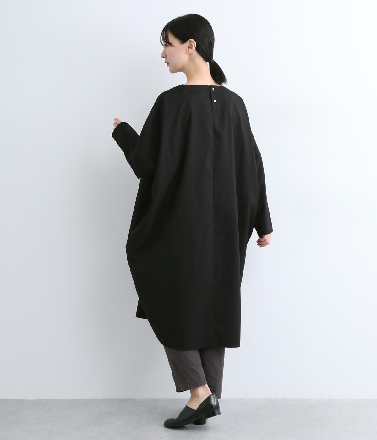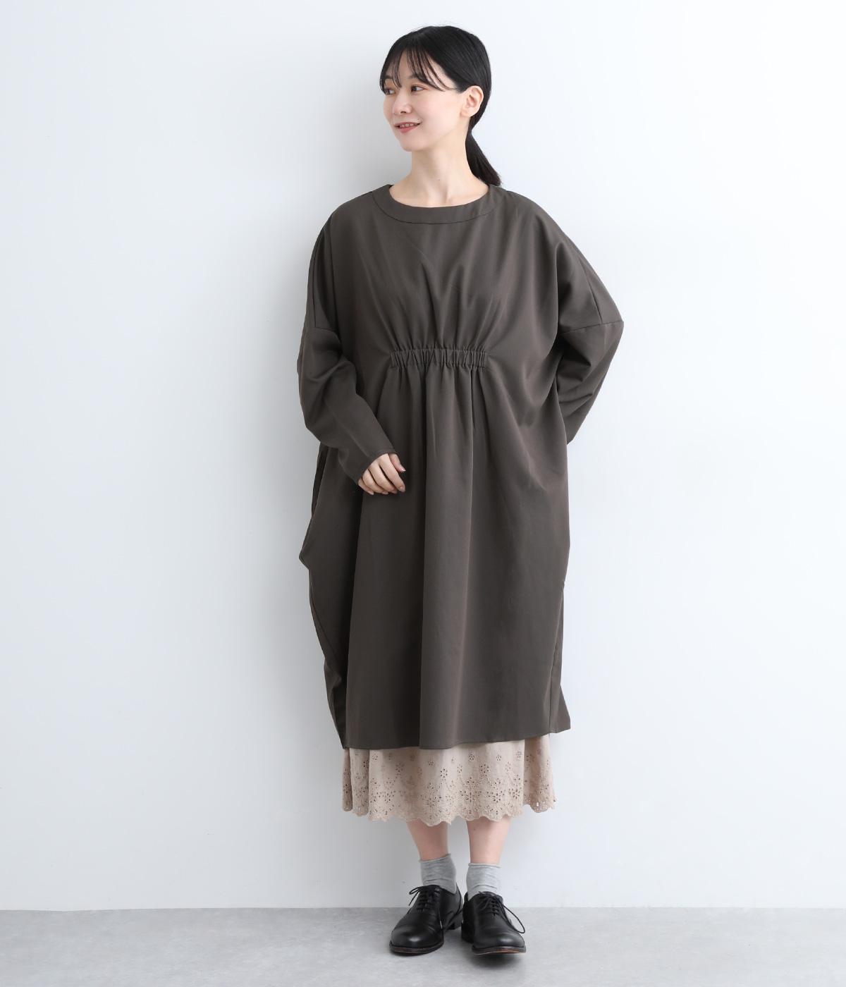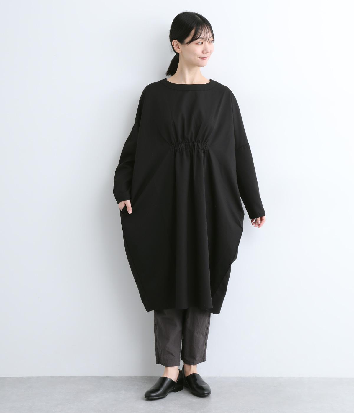 ウエストにギャザーディテールを取り入れたきれいめなワンピースです。体のシルエットを拾いにくいゆるやかなコクーンシルエットが着心地よく、ボトム合わせがたのしめる着丈に。袖口のボタンをあけてラフに折り返し、適度に抜け感を持たせるのもおすすめ。