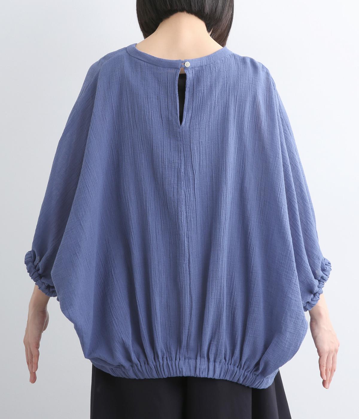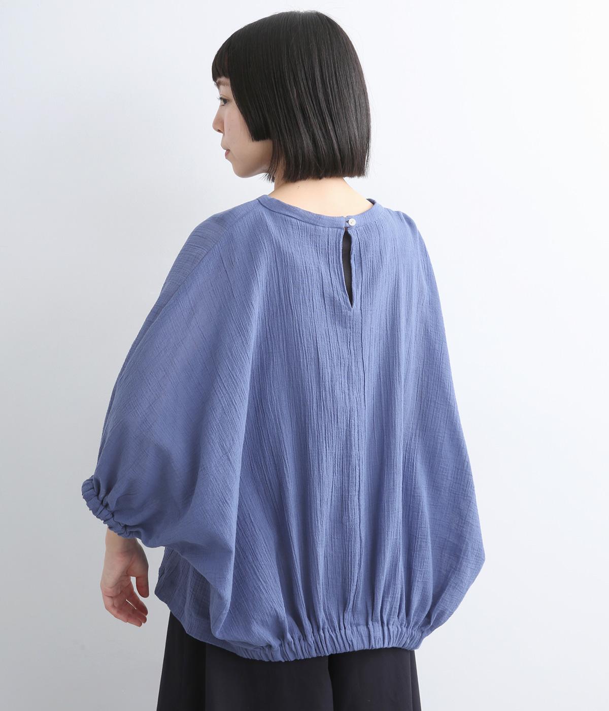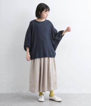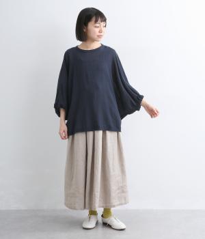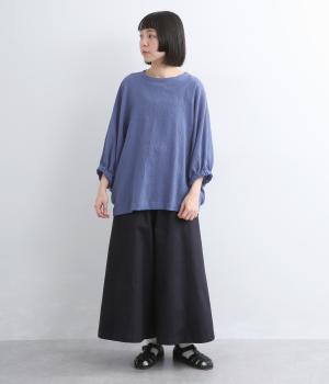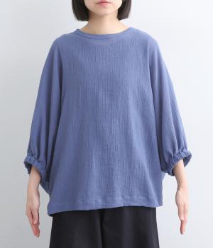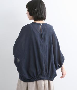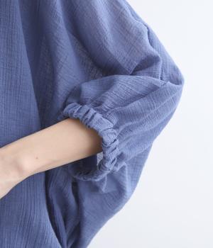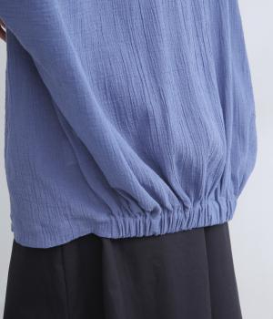 表情豊かな素材感を活かし、ゆったりシンプルなブラウスを仕立てました。肩から腕、裾に向けてゆるやかなラインを描くドルマンスリーブが特徴的で、肌にまとわりつきにくく風通しもいいので快適に着用できます。袖口はゴムを入れてきゅっとメリハリを。