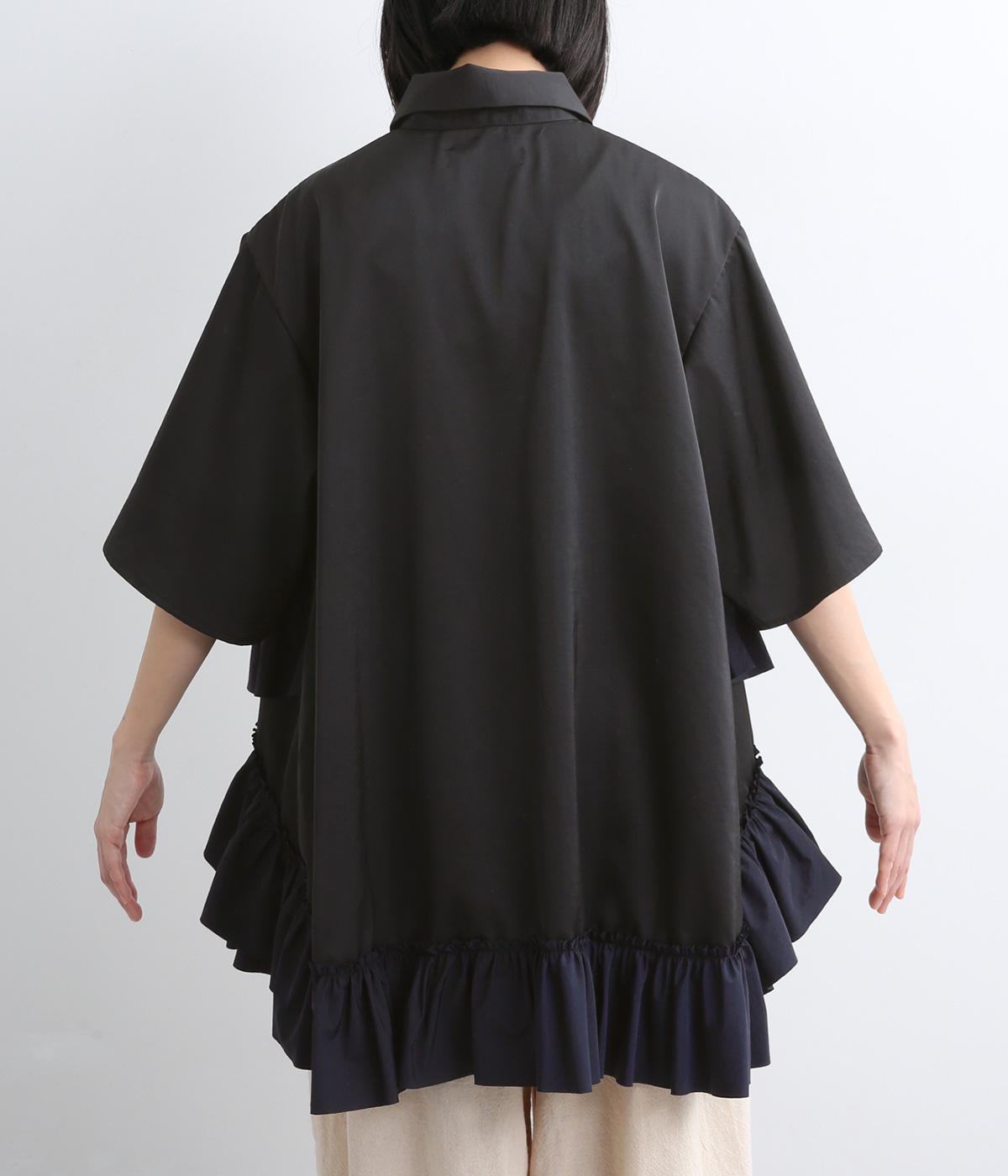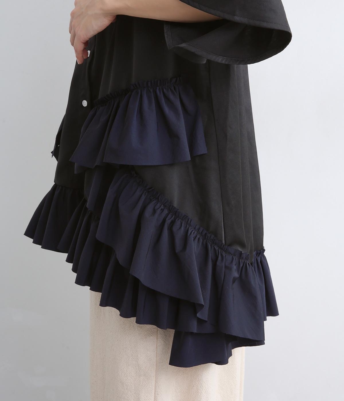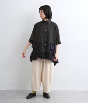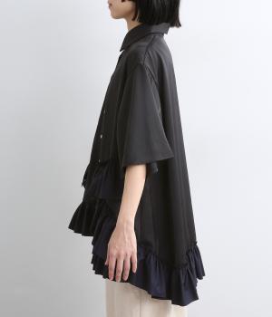 メンズライクなオーバーシャツの裾にフリルをたっぷりとあしらって、華やかなドレスシャツにアップデート。カラーや素材によって甘さをおさえることで、シックな装いがたのしめます。前あきで羽織りにもなり、着丈は前後差をつけて横姿もきれい見え。