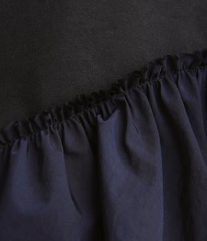 さらりとしたすべりのいい肌触りに光沢感が特徴的なポリエステルを使用。フリルにはシャリ感のあるナイロンを配し、全体的に軽さのある仕上がりです。