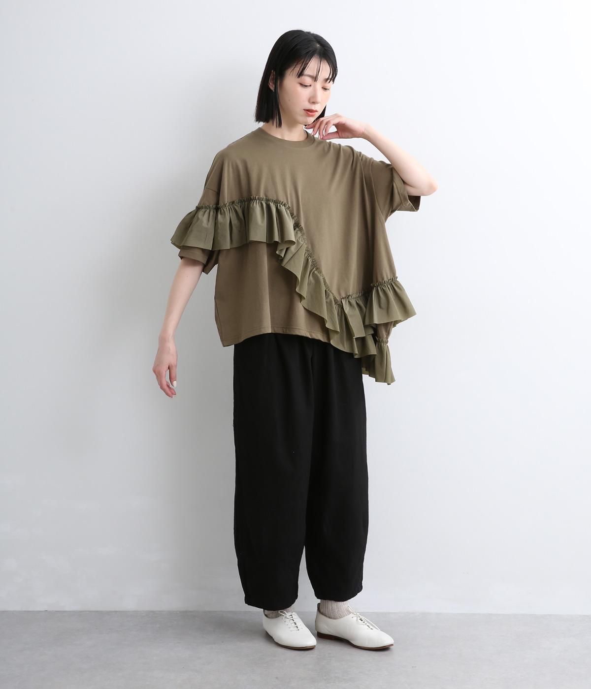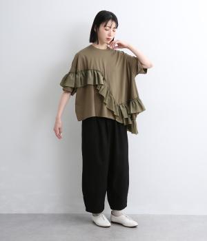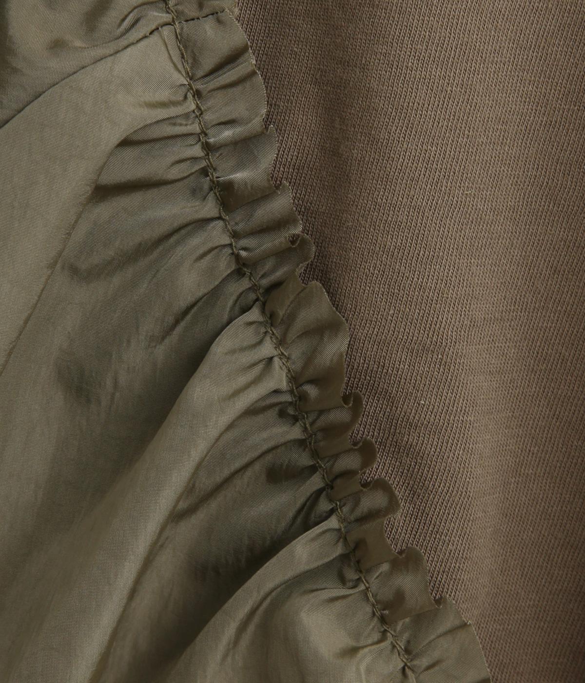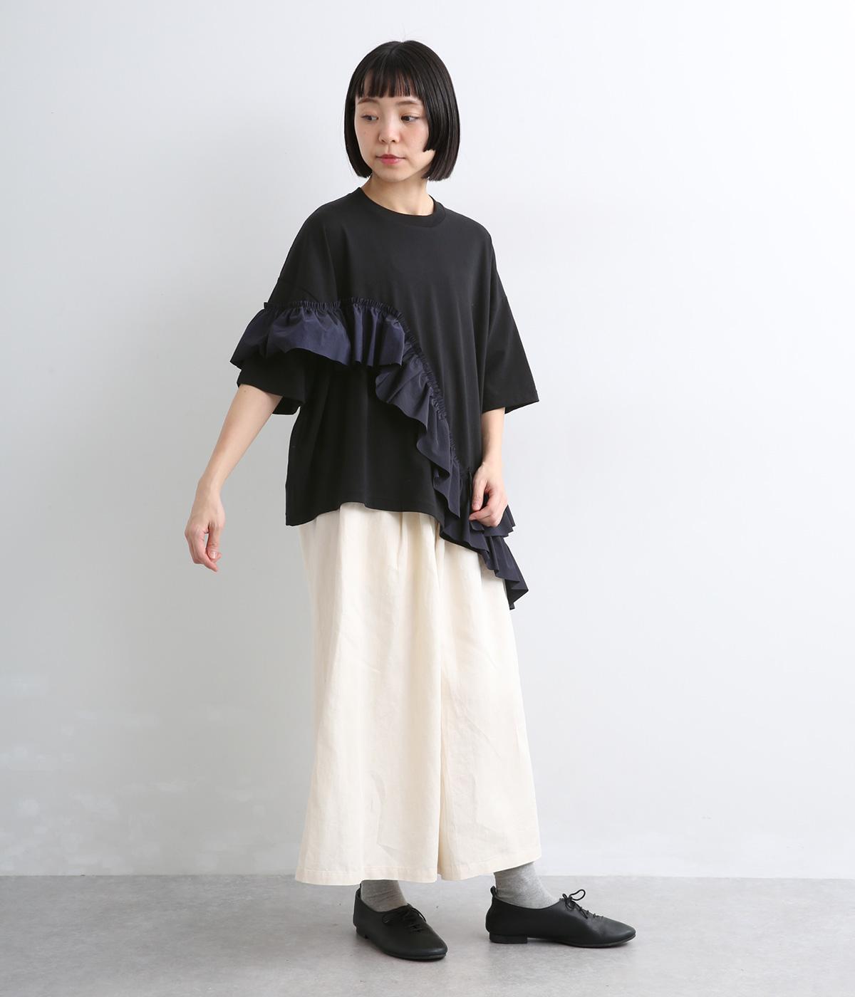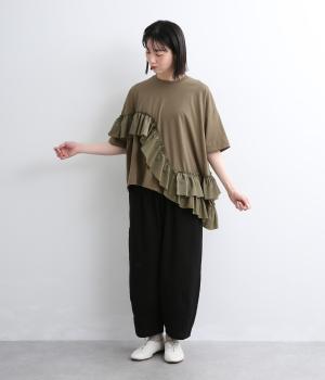 やわらかく肌触り抜群なコットン天竺をベースに使用しています。フリル部分にはシャリ感と光沢が特徴的なナイロンを配した異素材仕立てに。