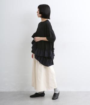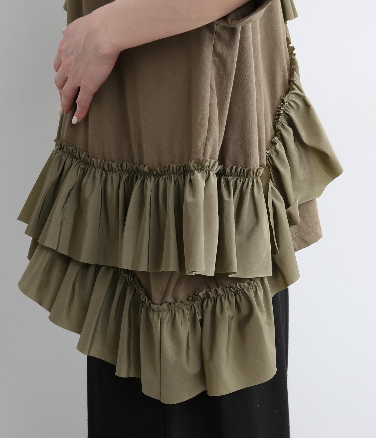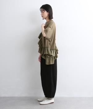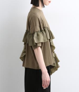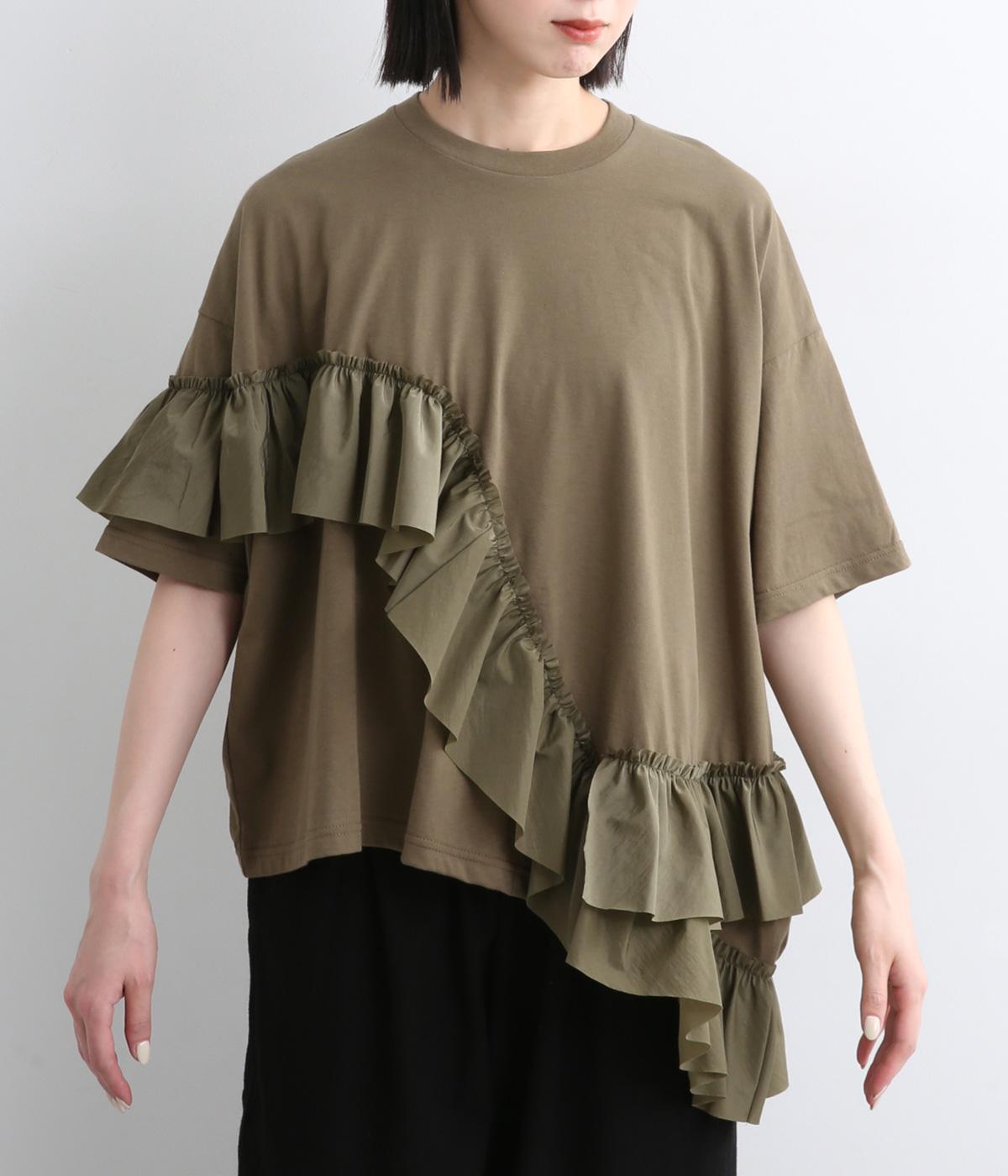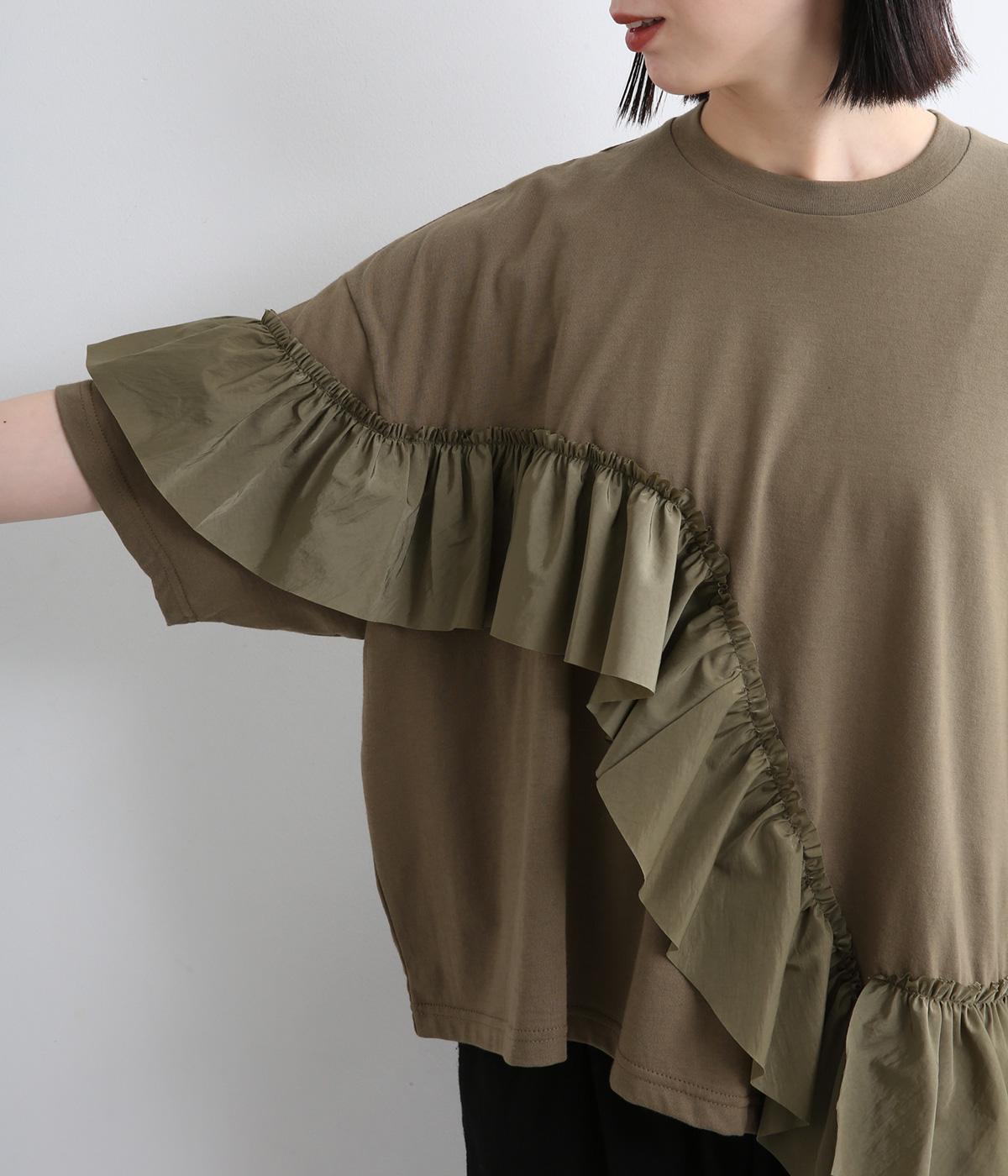 やわらかく肌触り抜群なコットン天竺をベースに使用しています。フリル部分にはシャリ感と光沢が特徴的なナイロンを配した異素材仕立てに。