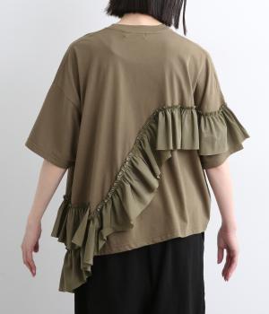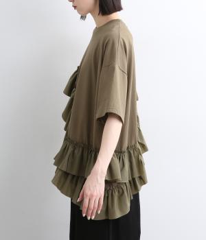 リラックスムードなワイドTシャツにフリルを大胆にあしらって華やかなアイテムにアップデート。ラインに動きをつけてより着映え力を高め、シンプルなボトムを合わせたいつものTシャツスタイルも一気にお洒落見え。