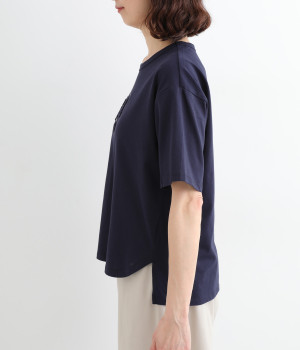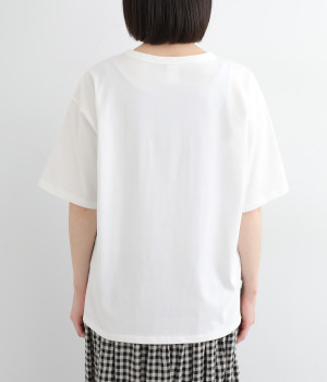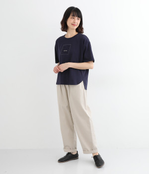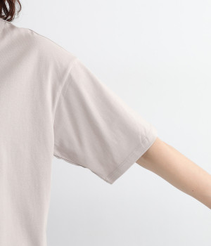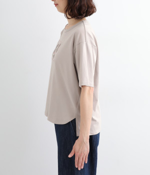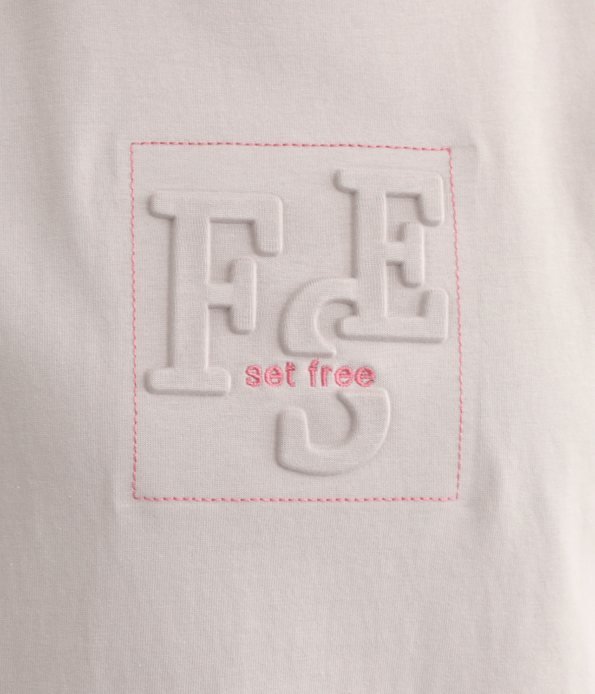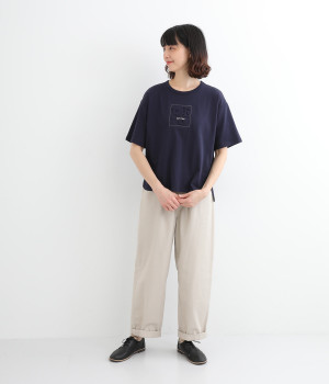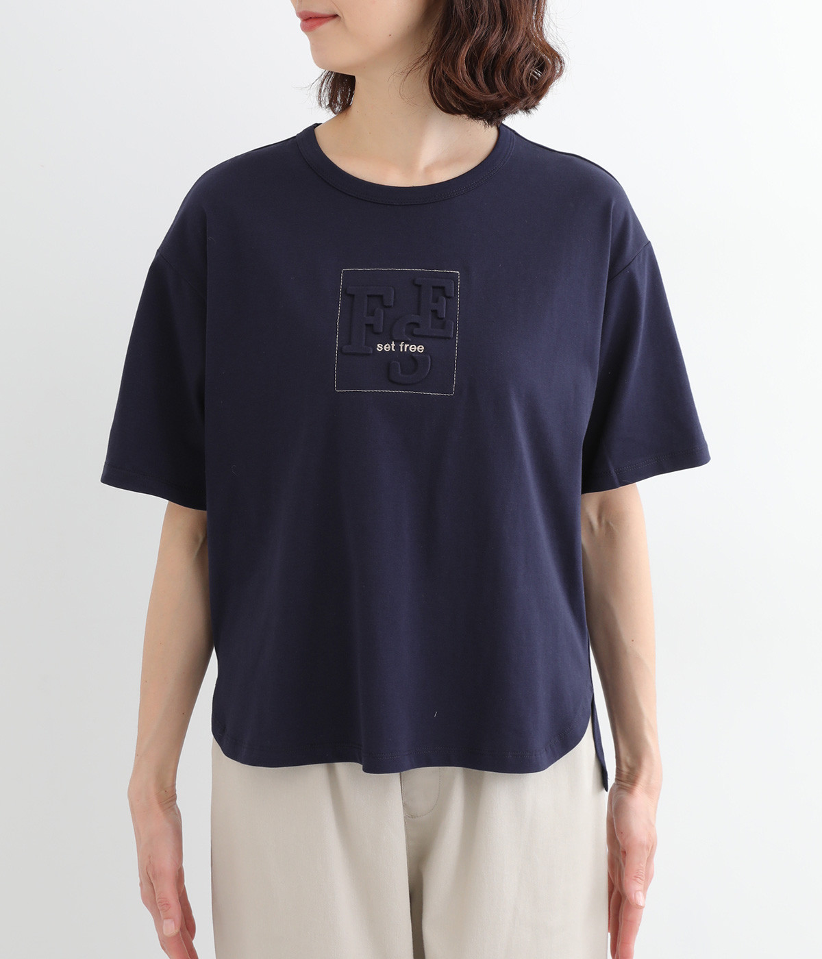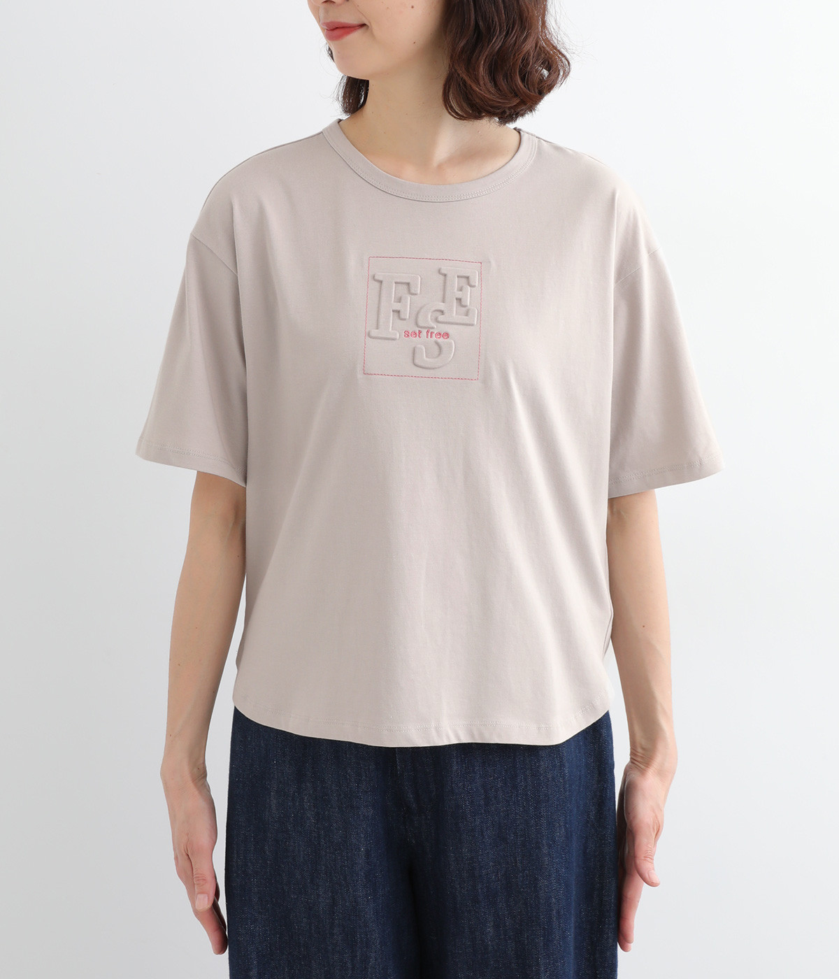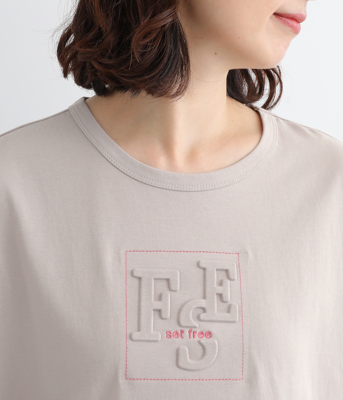 エンボス加工によって立体的なロゴに仕立て、そこに刺しゅうを施したTシャツです。前後差をつけた裾が、装いに変化を与えるポイントに。シンプルながらもスタイリングの主役にもなる一枚です。