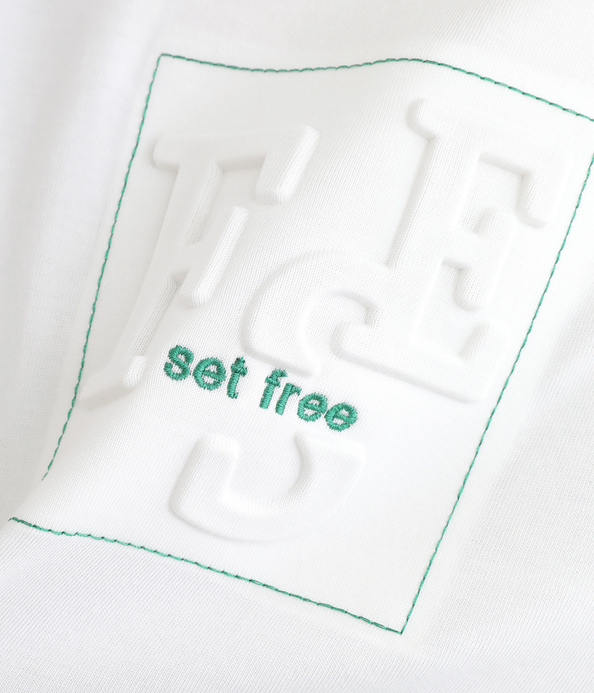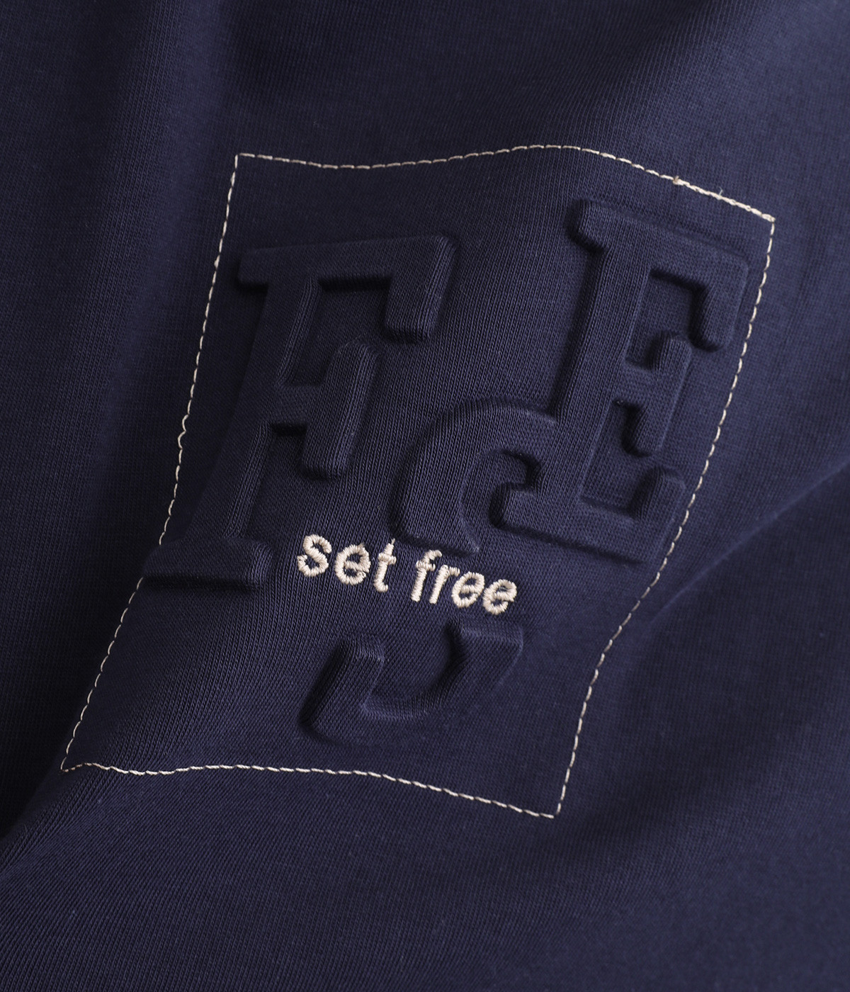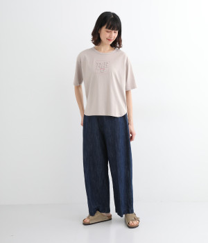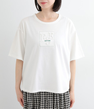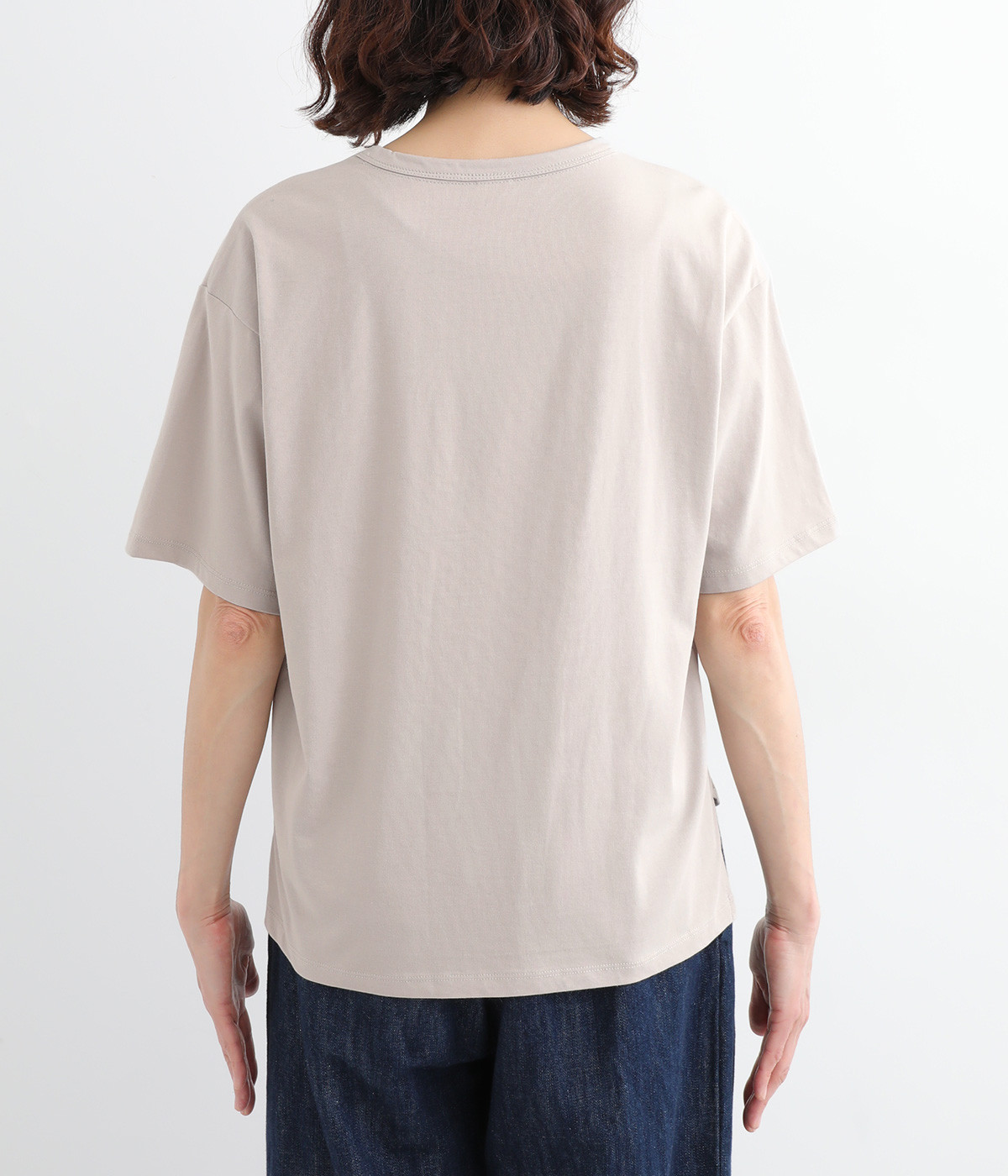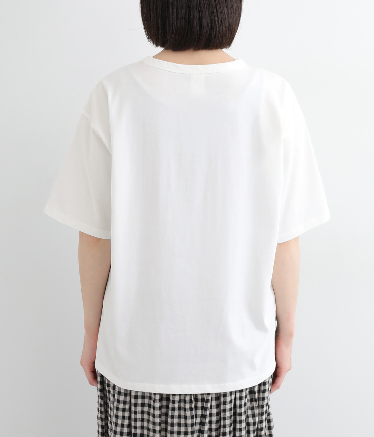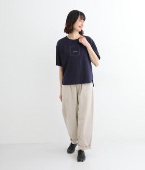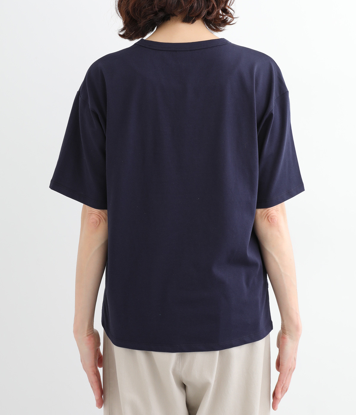 エンボス加工によって立体的なロゴに仕立て、そこに刺しゅうを施したTシャツです。前後差をつけた裾が、装いに変化を与えるポイントに。シンプルながらもスタイリングの主役にもなる一枚です。
