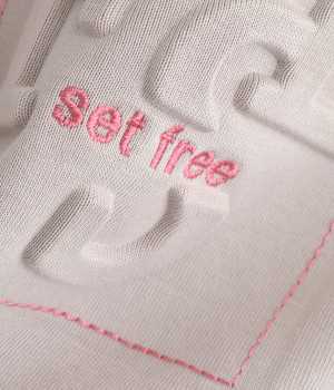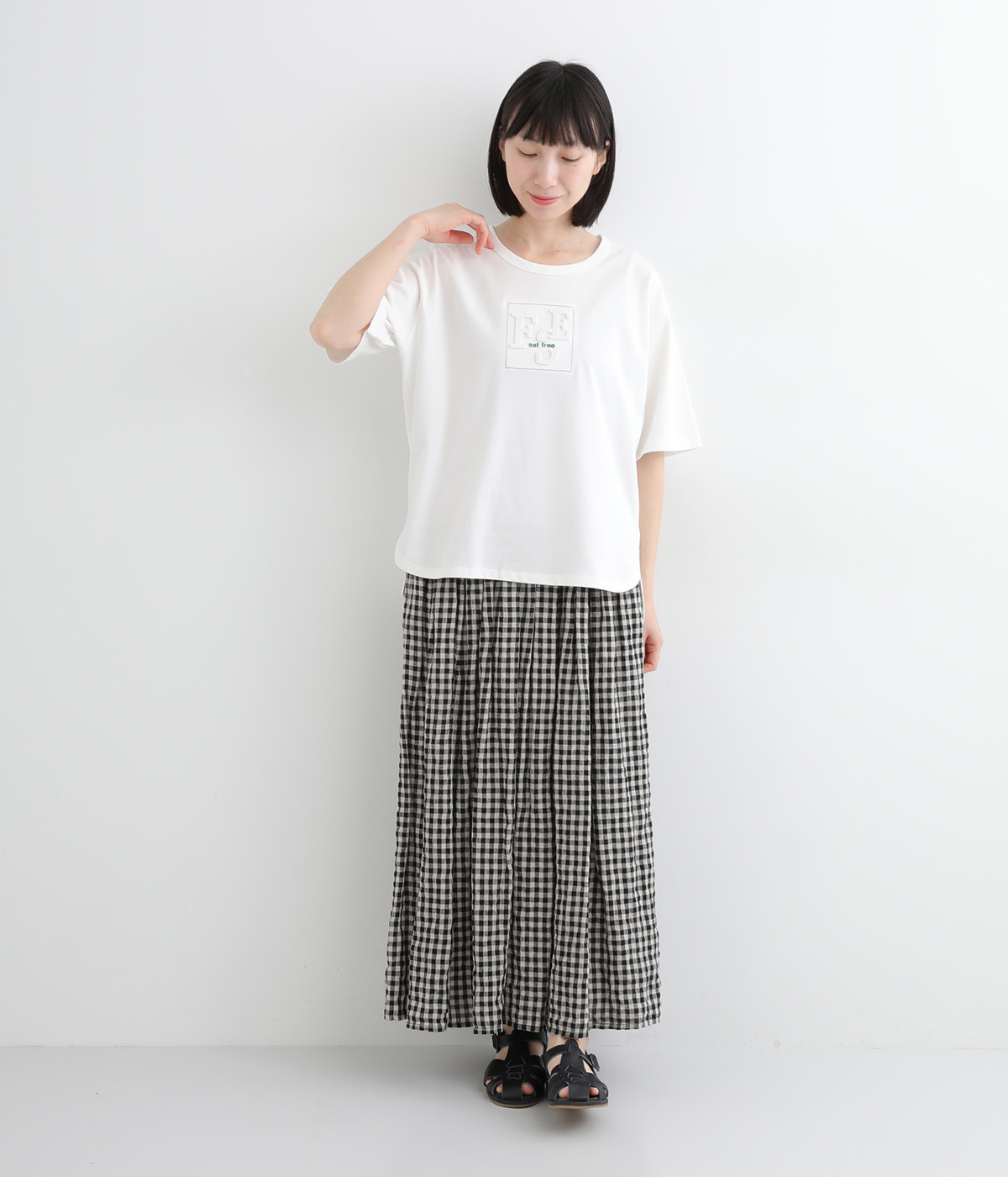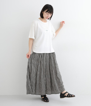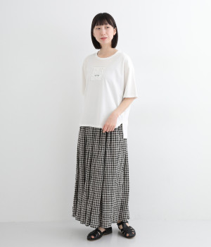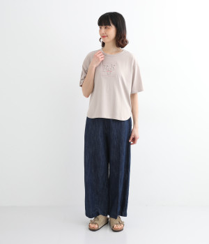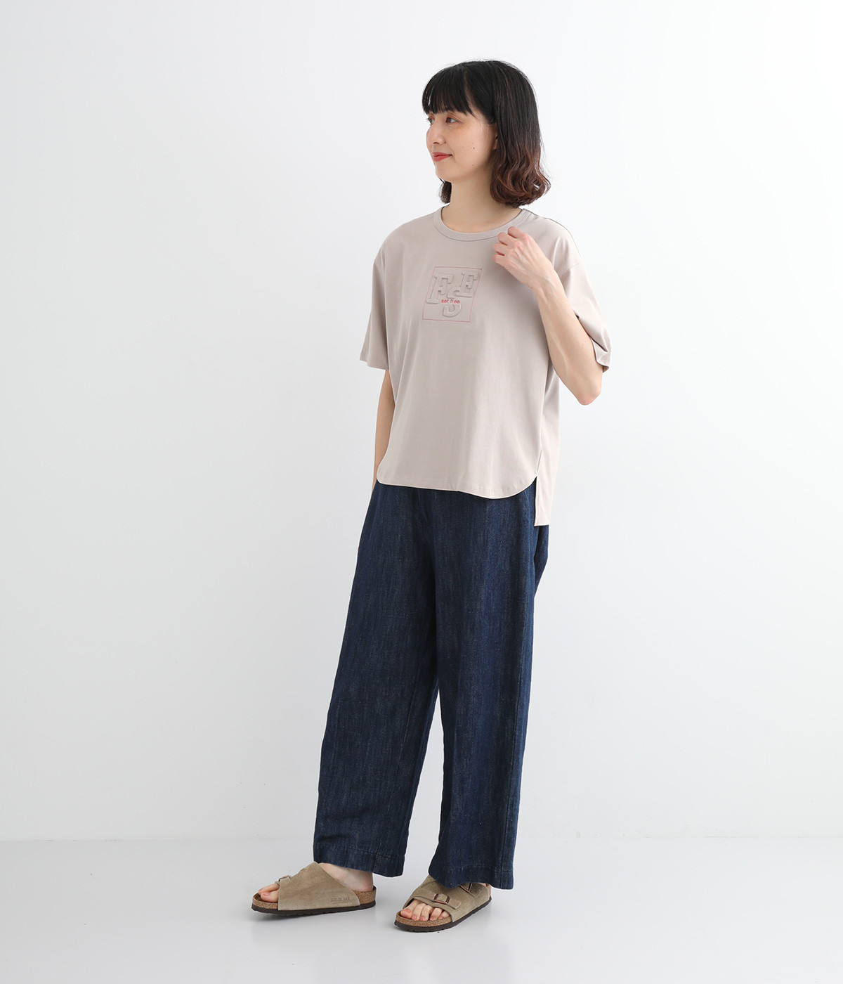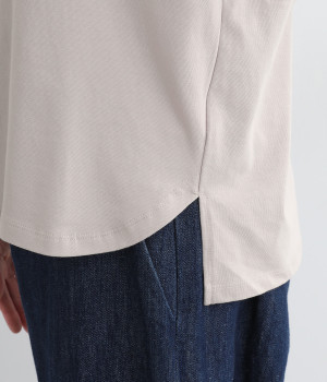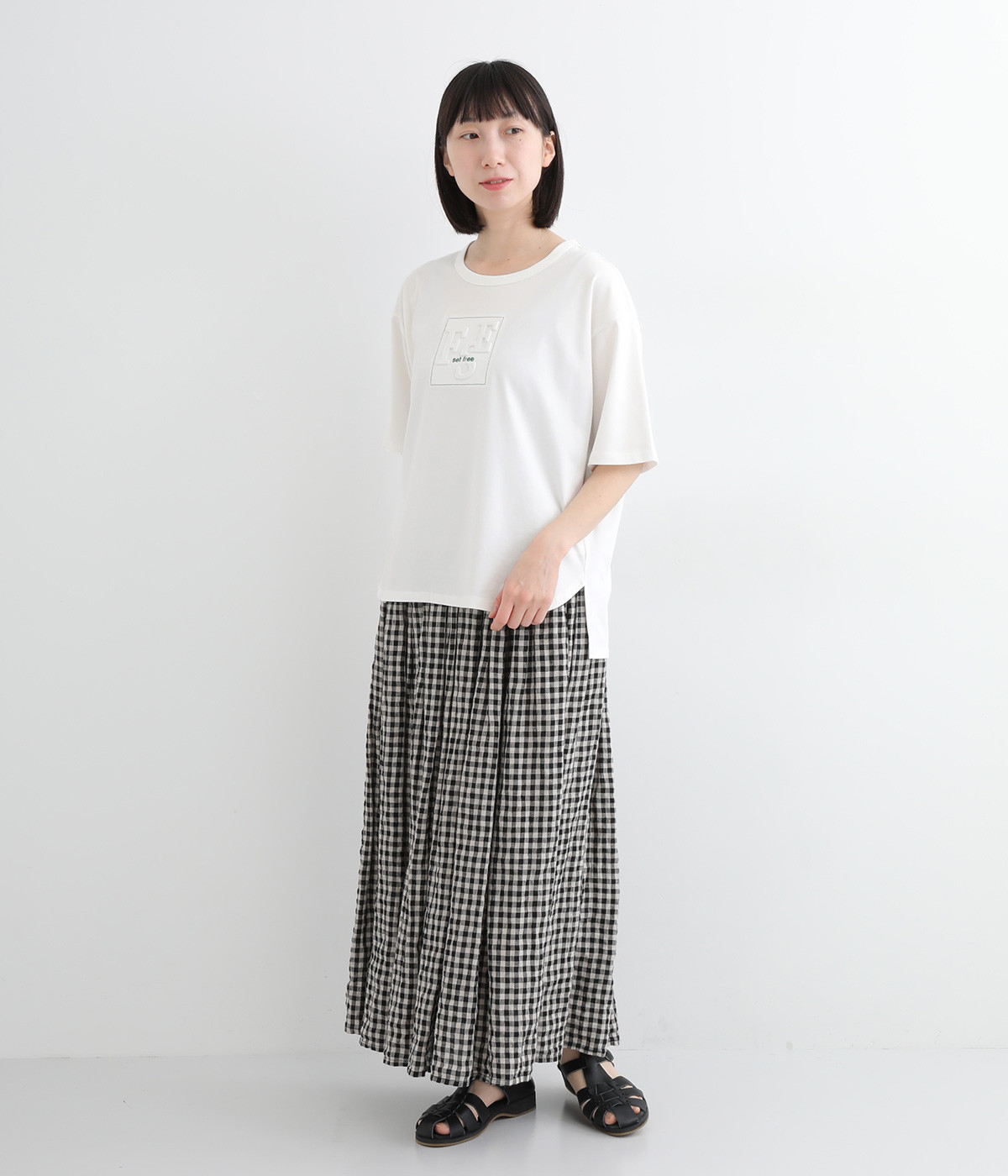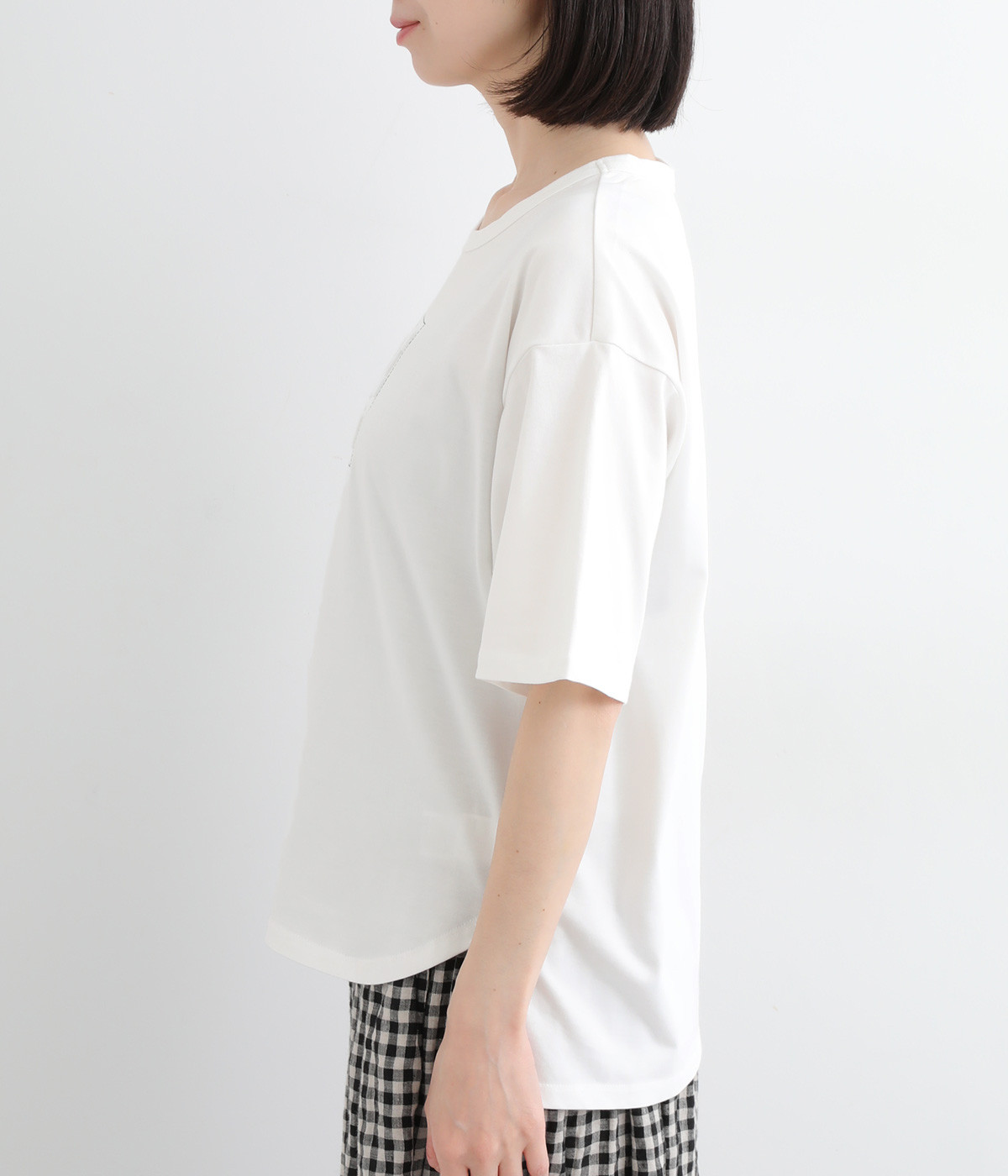 エンボス加工によって立体的なロゴに仕立て、そこに刺しゅうを施したTシャツです。前後差をつけた裾が、装いに変化を与えるポイントに。シンプルながらもスタイリングの主役にもなる一枚です。
