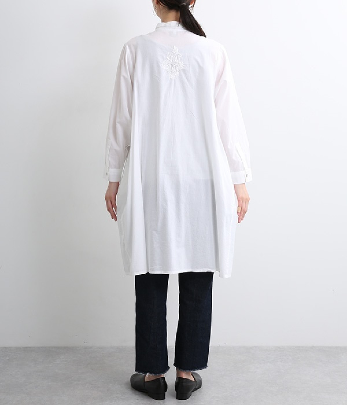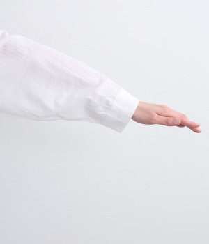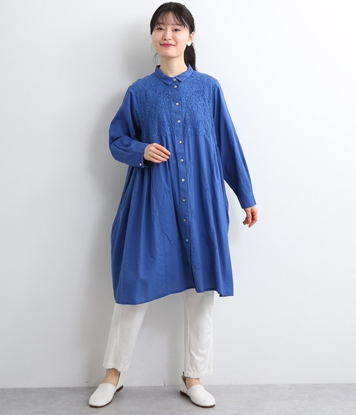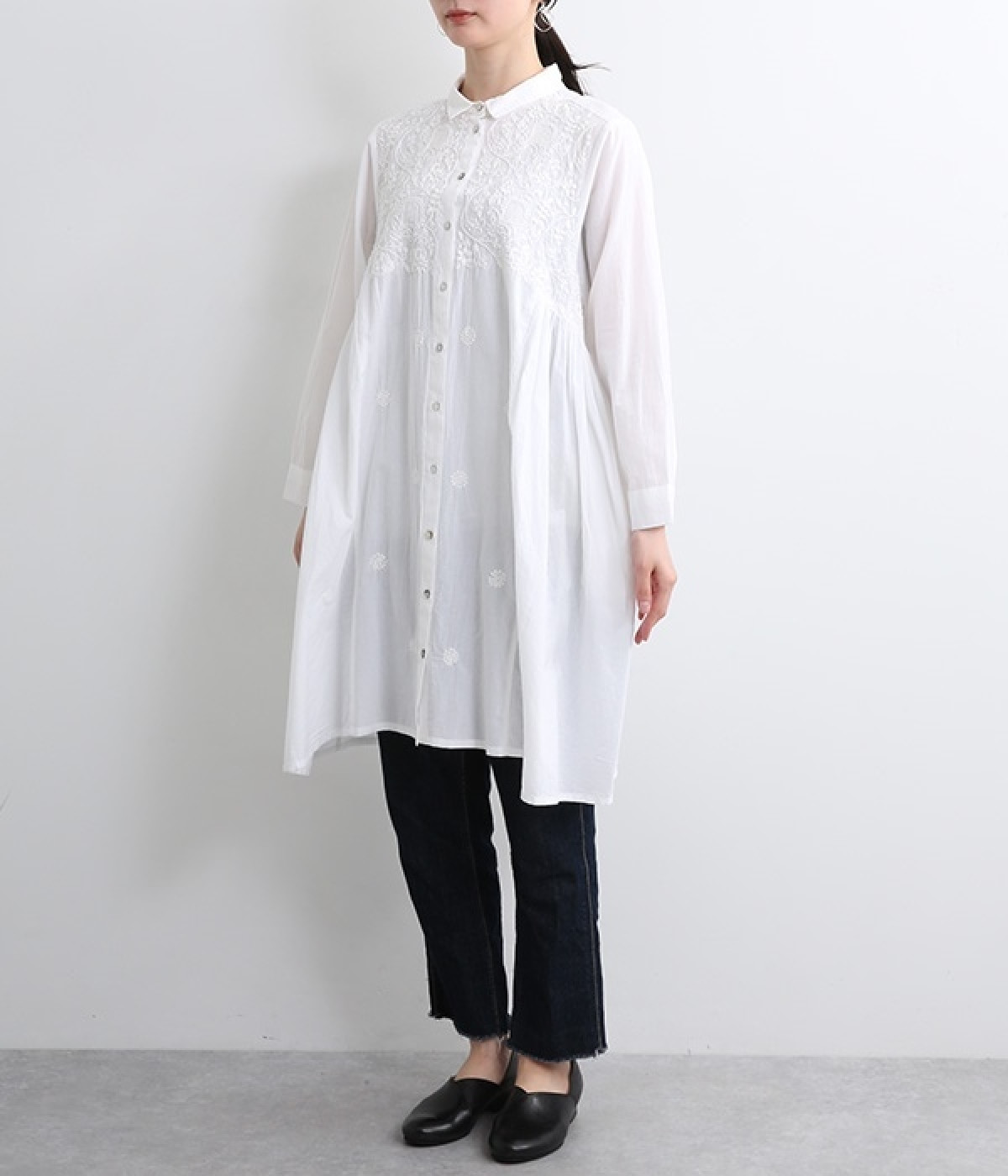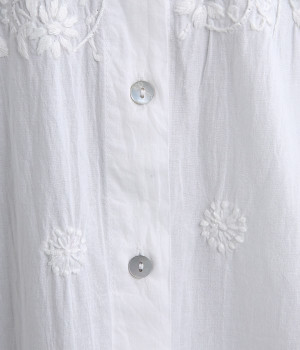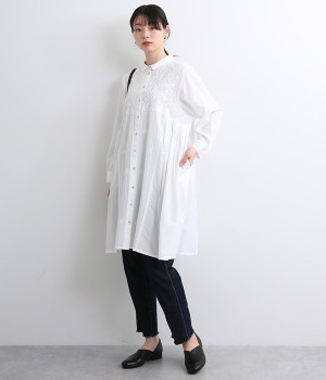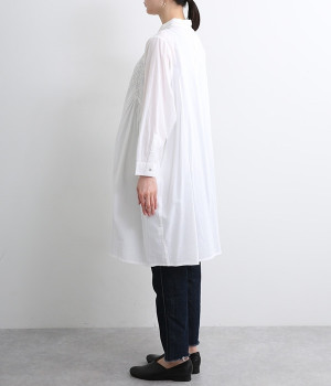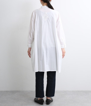 ひと針ひと針丁寧にほどこされた美しい刺繍は、インドのウッタルプラデーシュ州にあるラクノウという町の伝統的な手仕事によるもの。主張しすぎないコンパクトなシャツ襟がかわいらしく、清楚な雰囲気を醸し出すシャツチュニックです。両サイドにたっぷりと寄せたギャザーがやわらかなシルエットを描き、空気を通すような軽やかさを演出。膝丈ほどのレングスはボトム合わせにバランス良くマッチします。