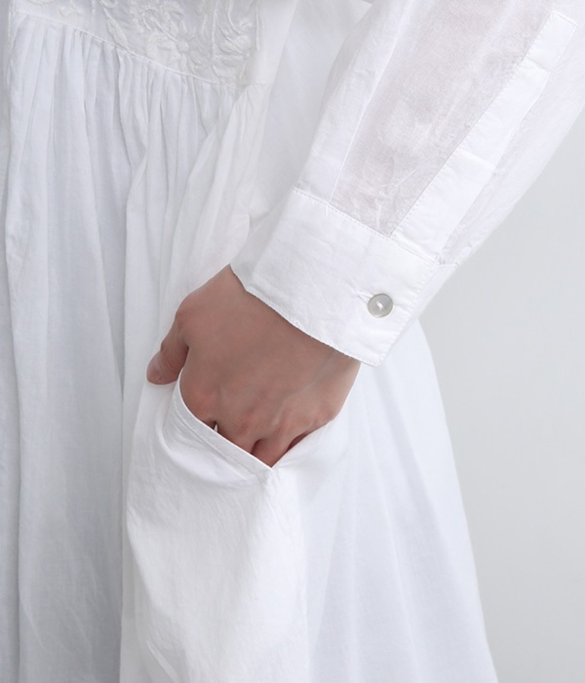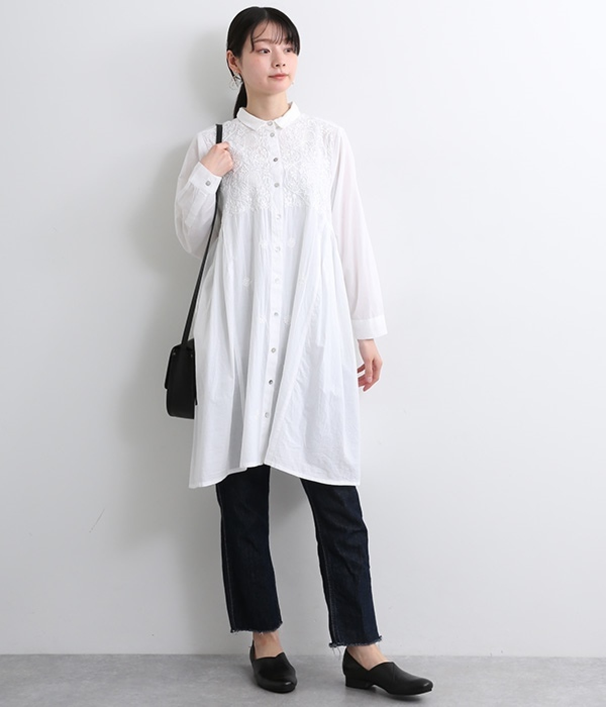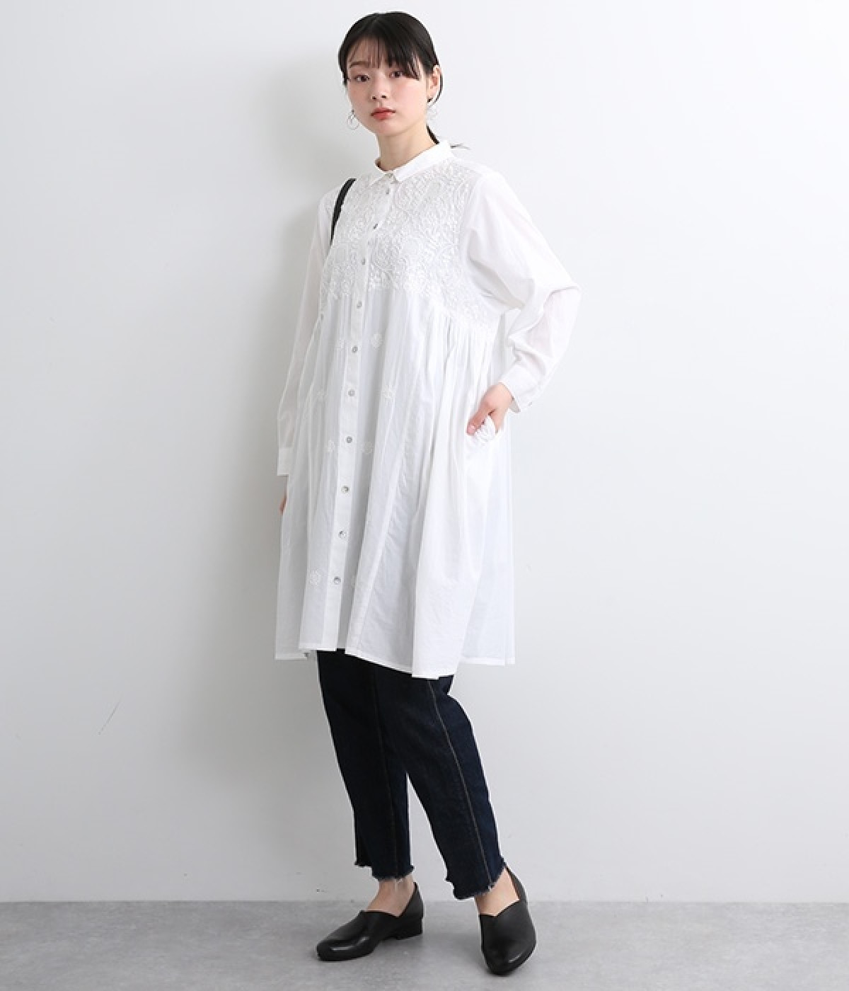 ひと針ひと針丁寧にほどこされた美しい刺繍は、インドのウッタルプラデーシュ州にあるラクノウという町の伝統的な手仕事によるもの。主張しすぎないコンパクトなシャツ襟がかわいらしく、清楚な雰囲気を醸し出すシャツチュニックです。両サイドにたっぷりと寄せたギャザーがやわらかなシルエットを描き、空気を通すような軽やかさを演出。膝丈ほどのレングスはボトム合わせにバランス良くマッチします。