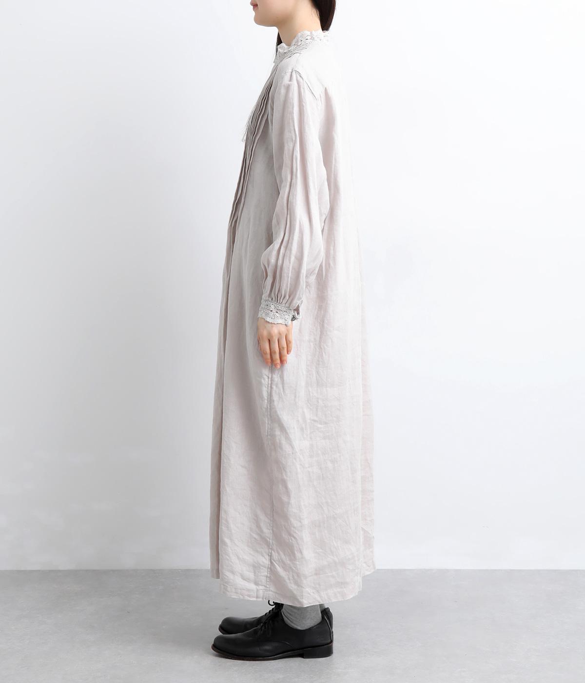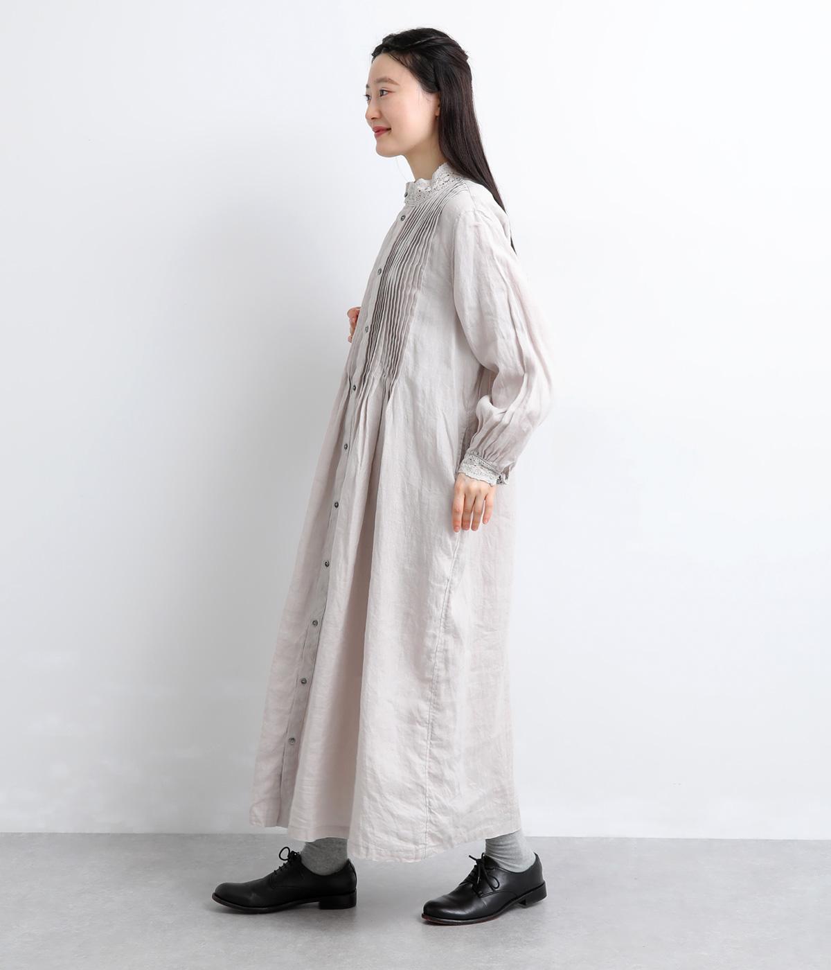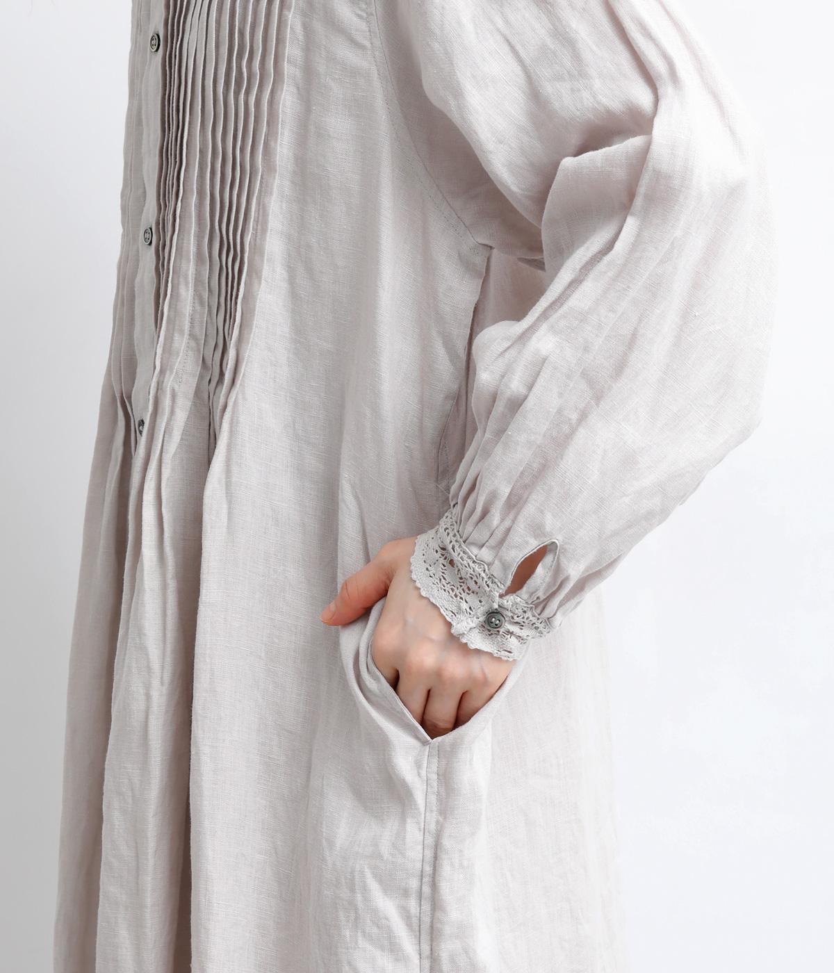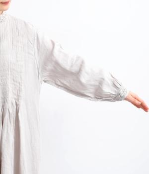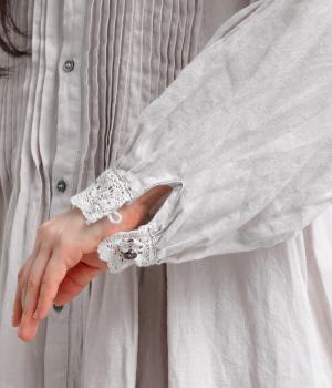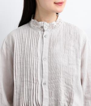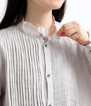 前身頃にたっぷりと施されたピンタックが、クラシカルで奥行きのある表情を演出。スタンドネックにあしらわれた繊細なレースがやわらかな印象を添え、袖口のギャザーとレースが女性らしさを引き立てます。ゆったりとしたシルエットながら、一枚で着映えする上品なデザインです。