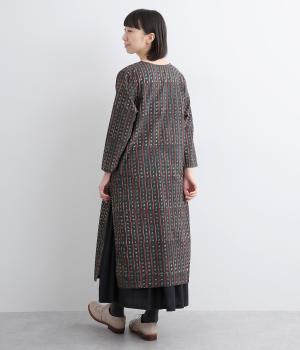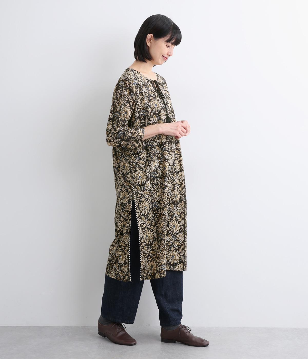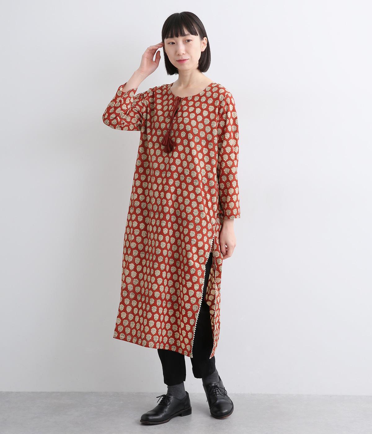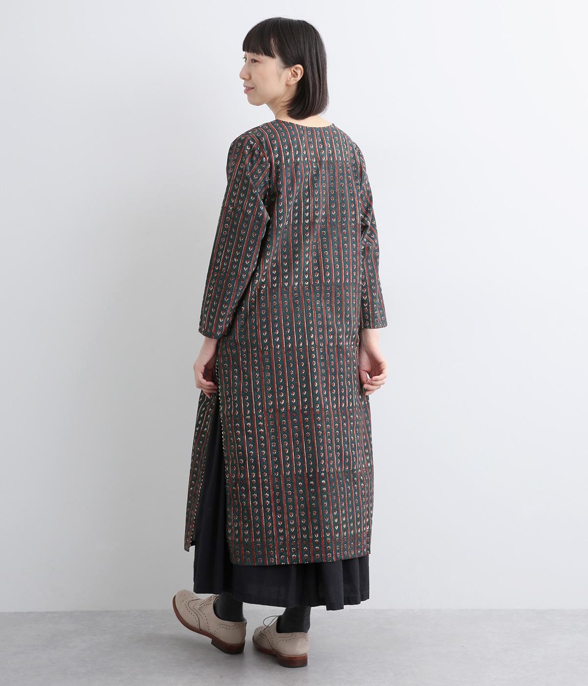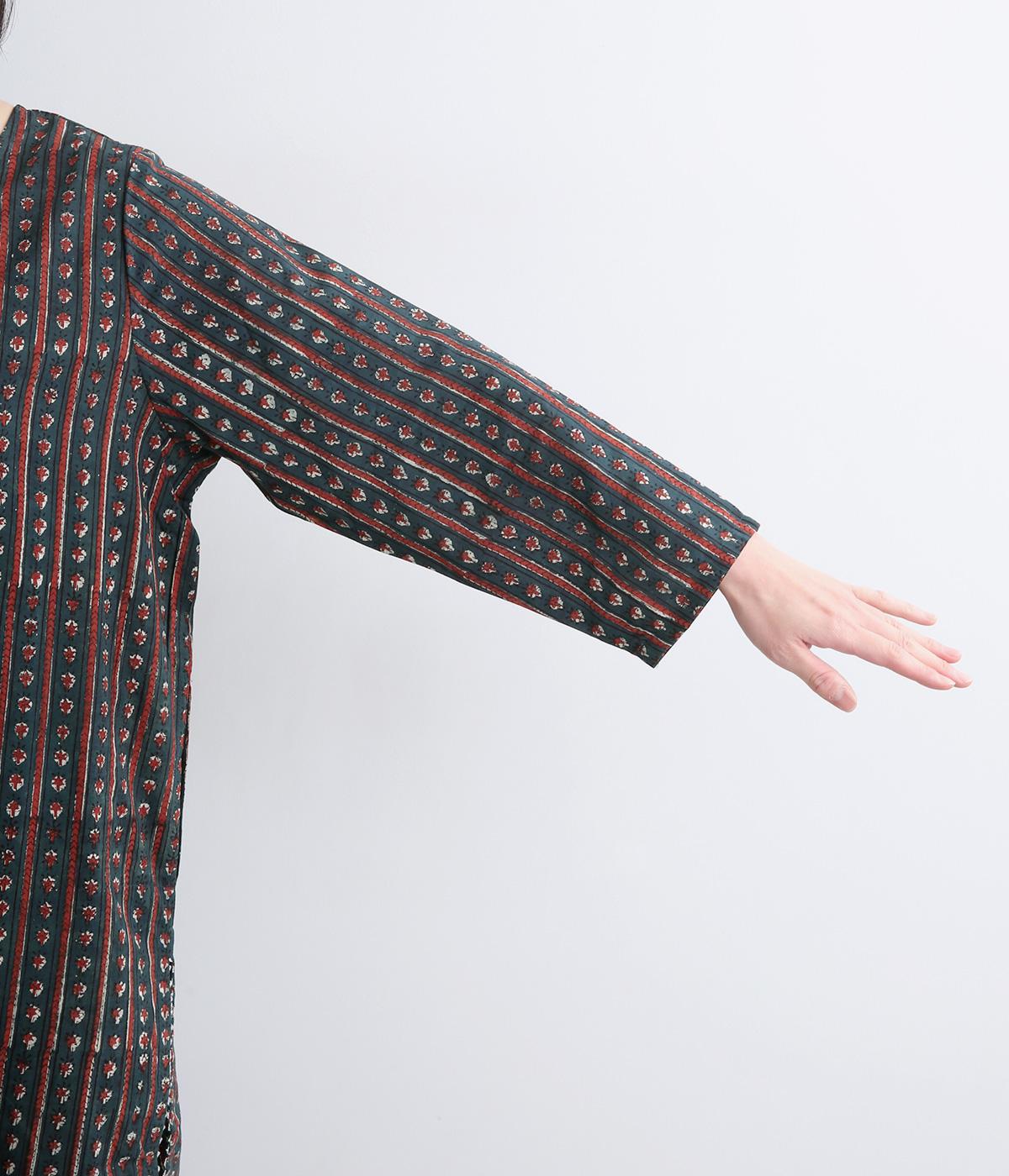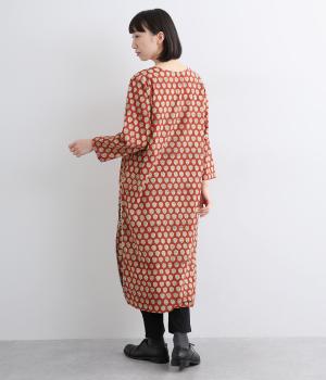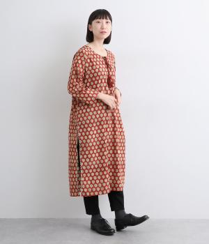 インド伝統の手紡ぎ、手織りのカディ生地で仕立てました。さらっとした肌ざわりのよさが魅力的。プリントは一版一色ずつ押して柄を作っていくインド伝統のブロックプリントを採用しています。
