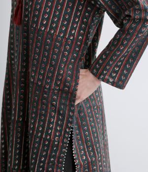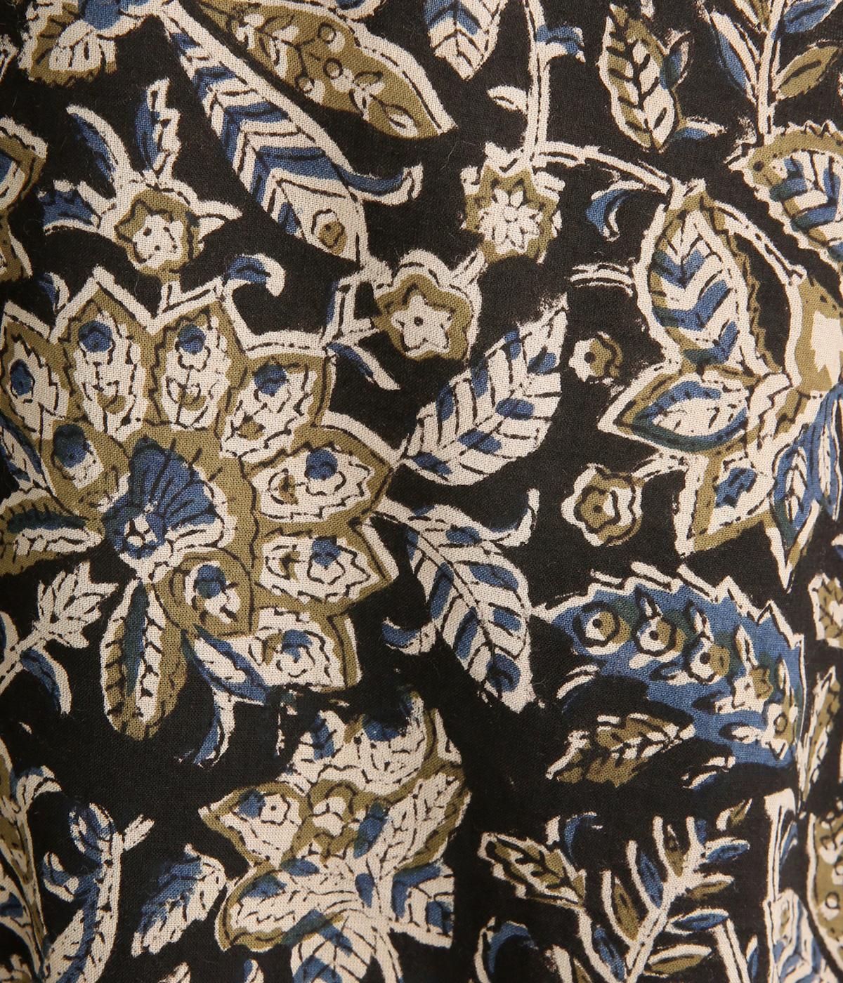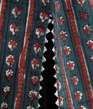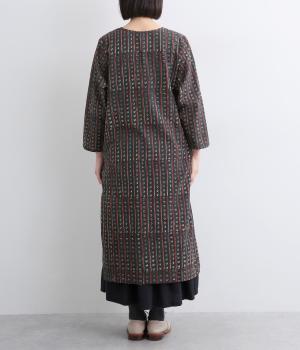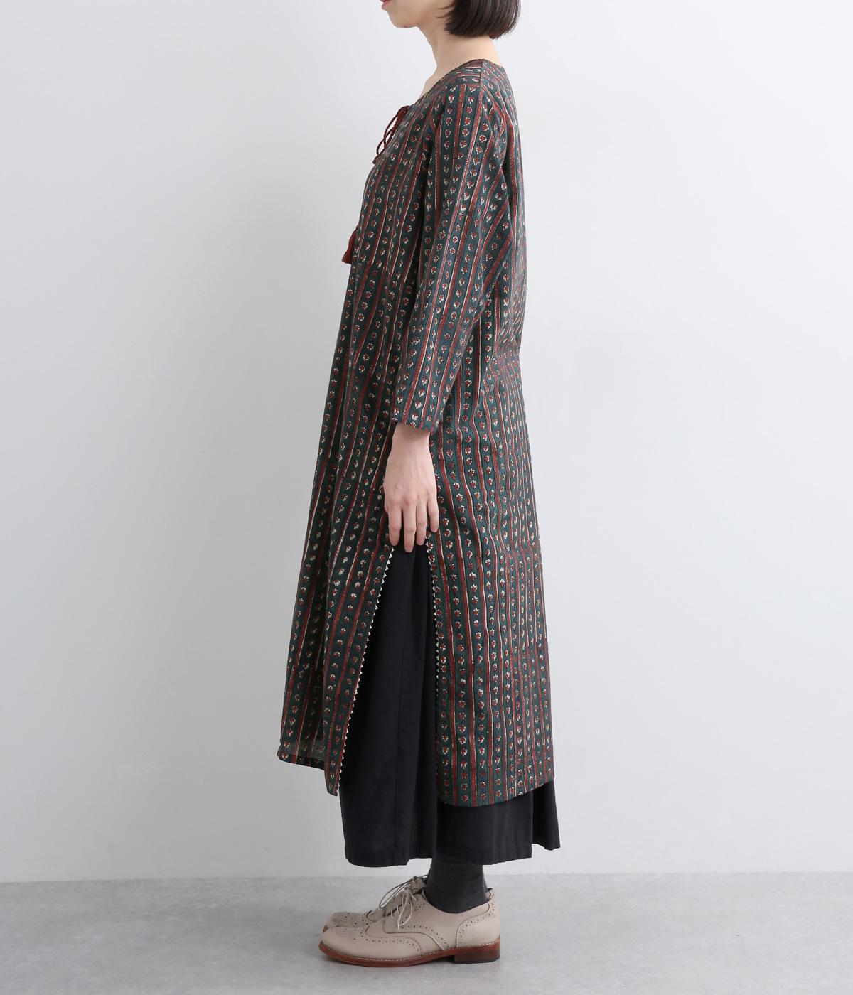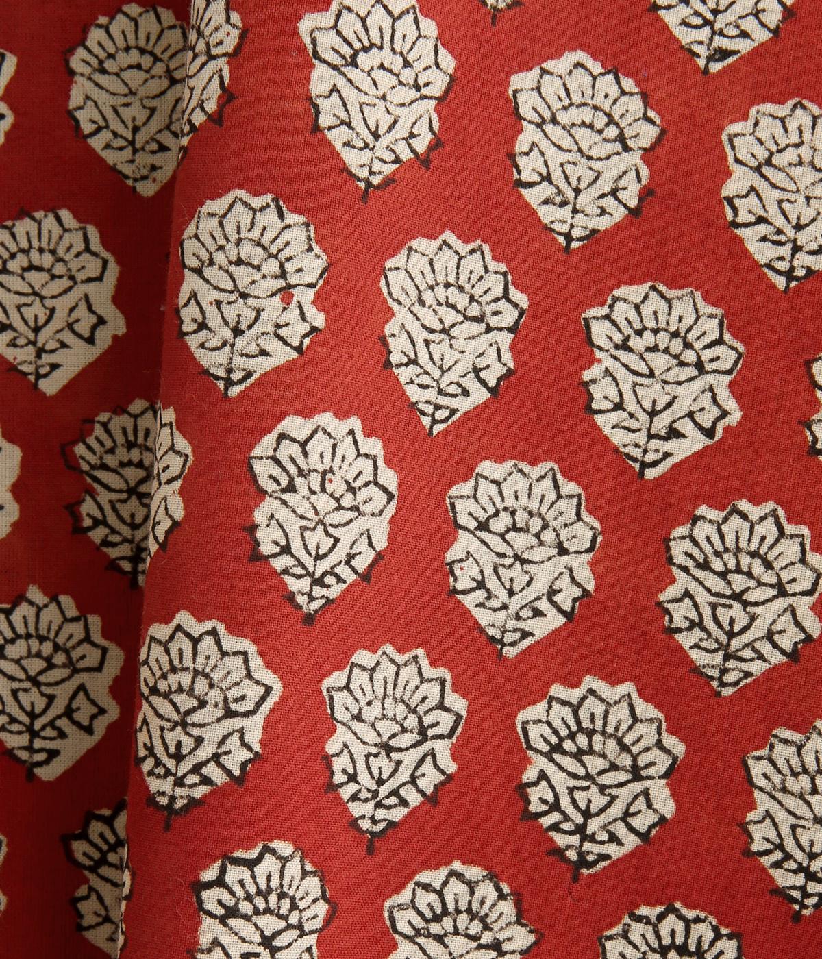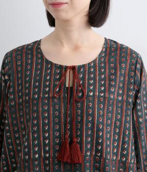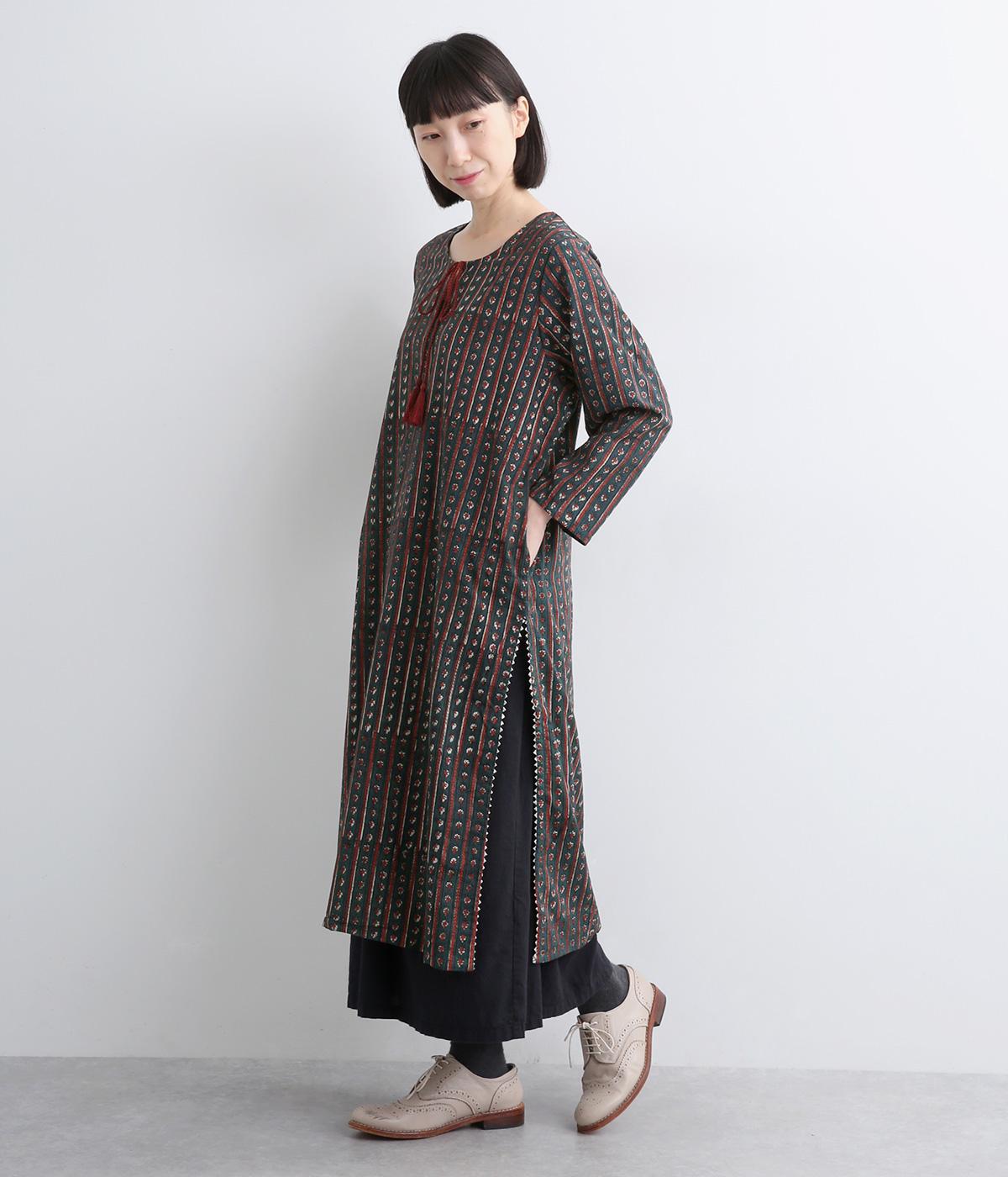 インド伝統の手紡ぎ、手織りのカディ生地で仕立てました。さらっとした肌ざわりのよさが魅力的。プリントは一版一色ずつ押して柄を作っていくインド伝統のブロックプリントを採用しています。