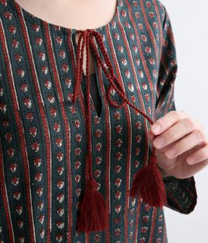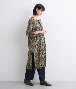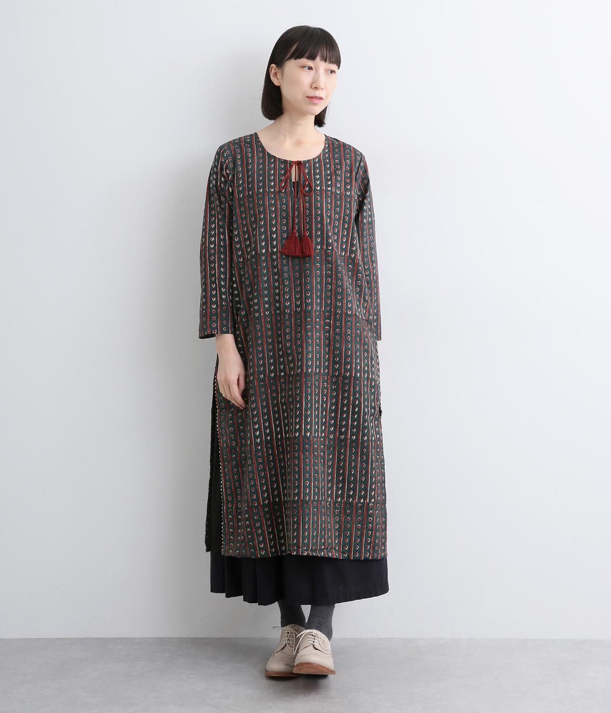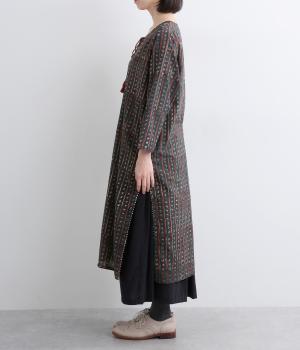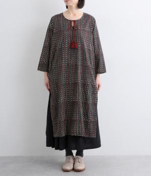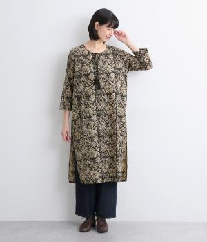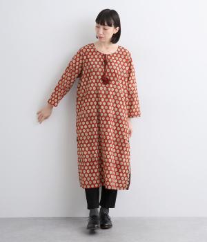 インドのパンジャミドレスをイメージしてつくられたチュニックワンピースです。アクセントになるサイドスリットのシルバーパイピングや、襟ぐりのタッセルがエスニックな魅力を引き立てます。深めにあいた襟ぐりで顔まわりもすっきりと。