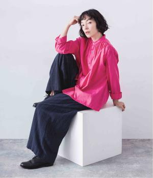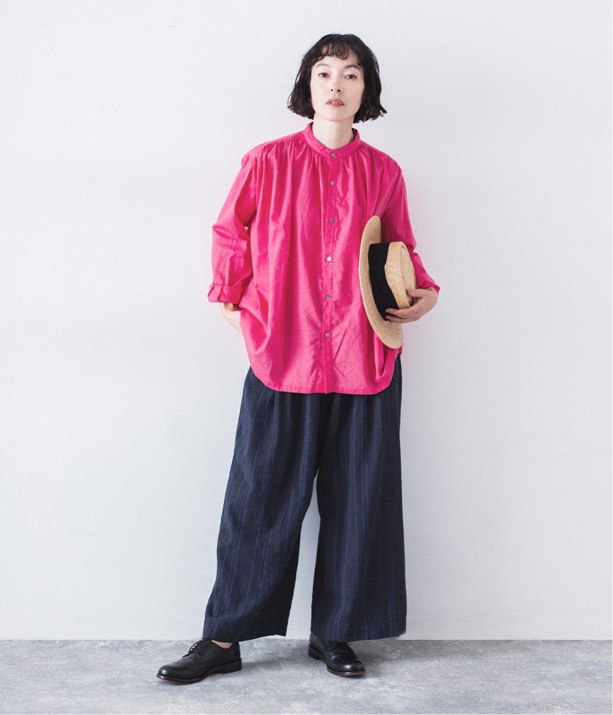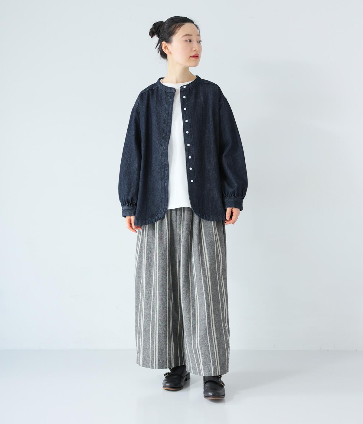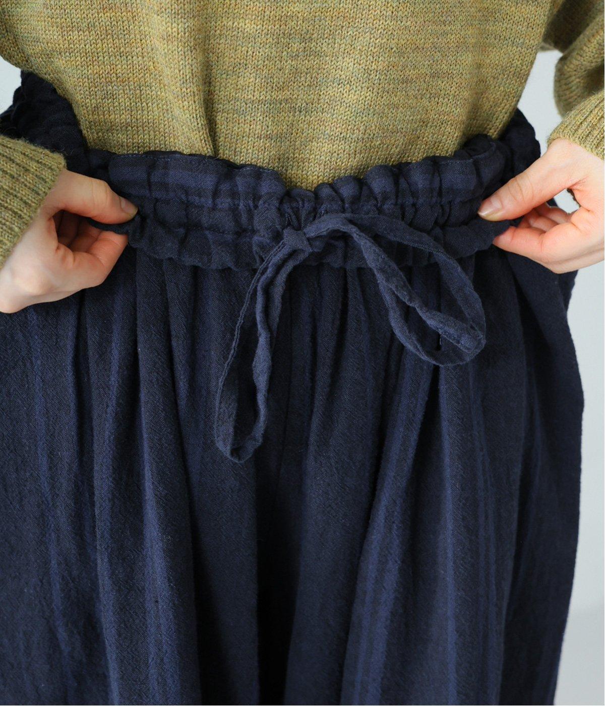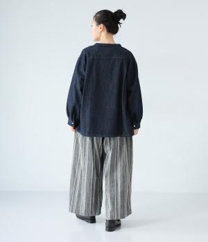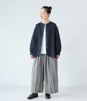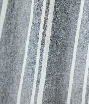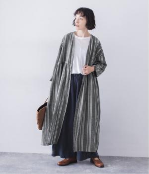 軽くさらりとした肌ざわりのリネンコットン生地を使用しています。自然なシボとシャリ感のあるナチュラルな風合いが魅力。落ち着いた配色のストライプ柄をあしらいました。綿素材のさらりとした裏地つきです。