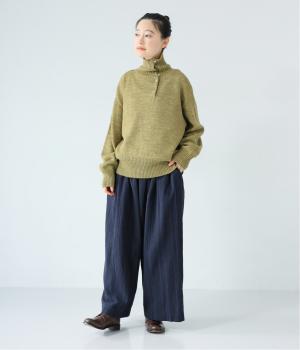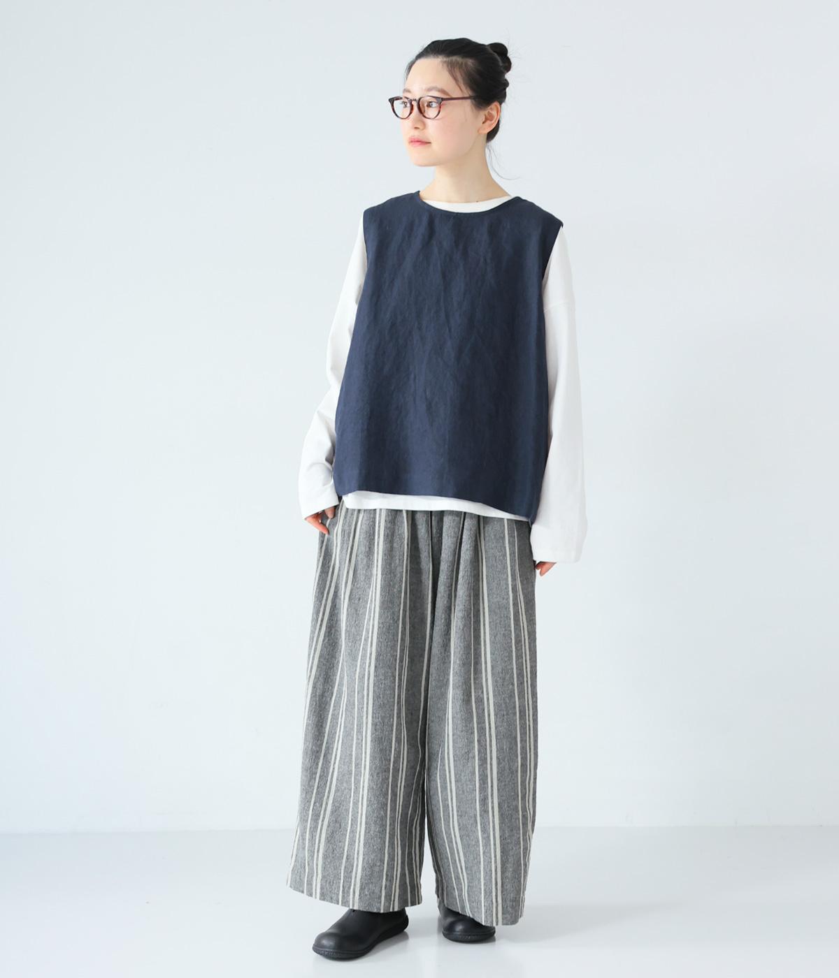 ゆとりのあるサイズ感で、リラックスして過ごしたいシーンにもぴったりな綿麻パンツ。ランダムストライプ柄と生地のナチュラルな風合いが大人らしい印象です。総ゴム仕様のウエストには、フィット感をアップする内紐をプラスしました。