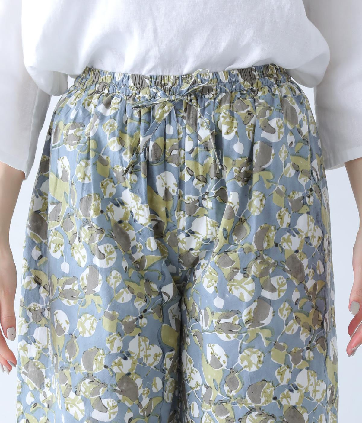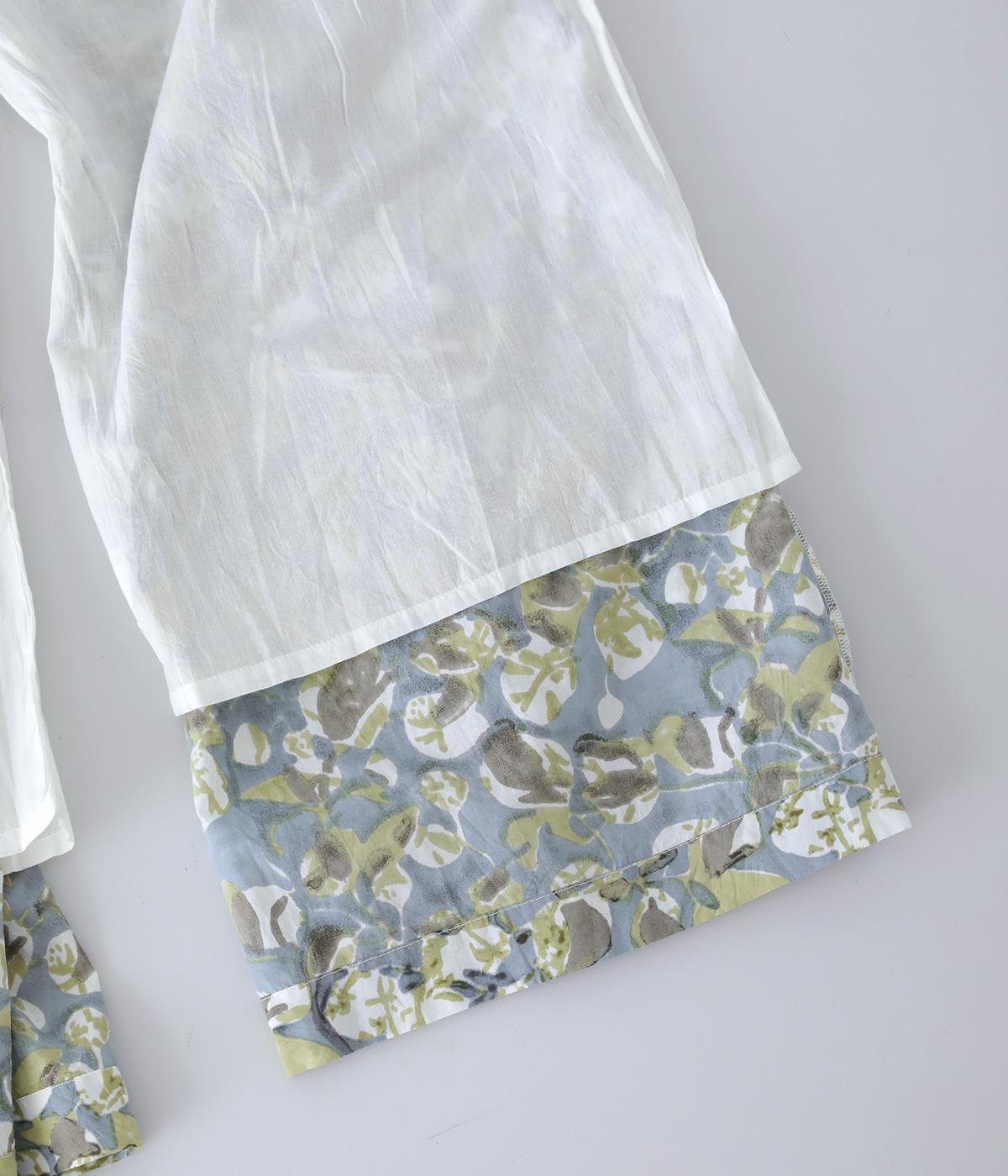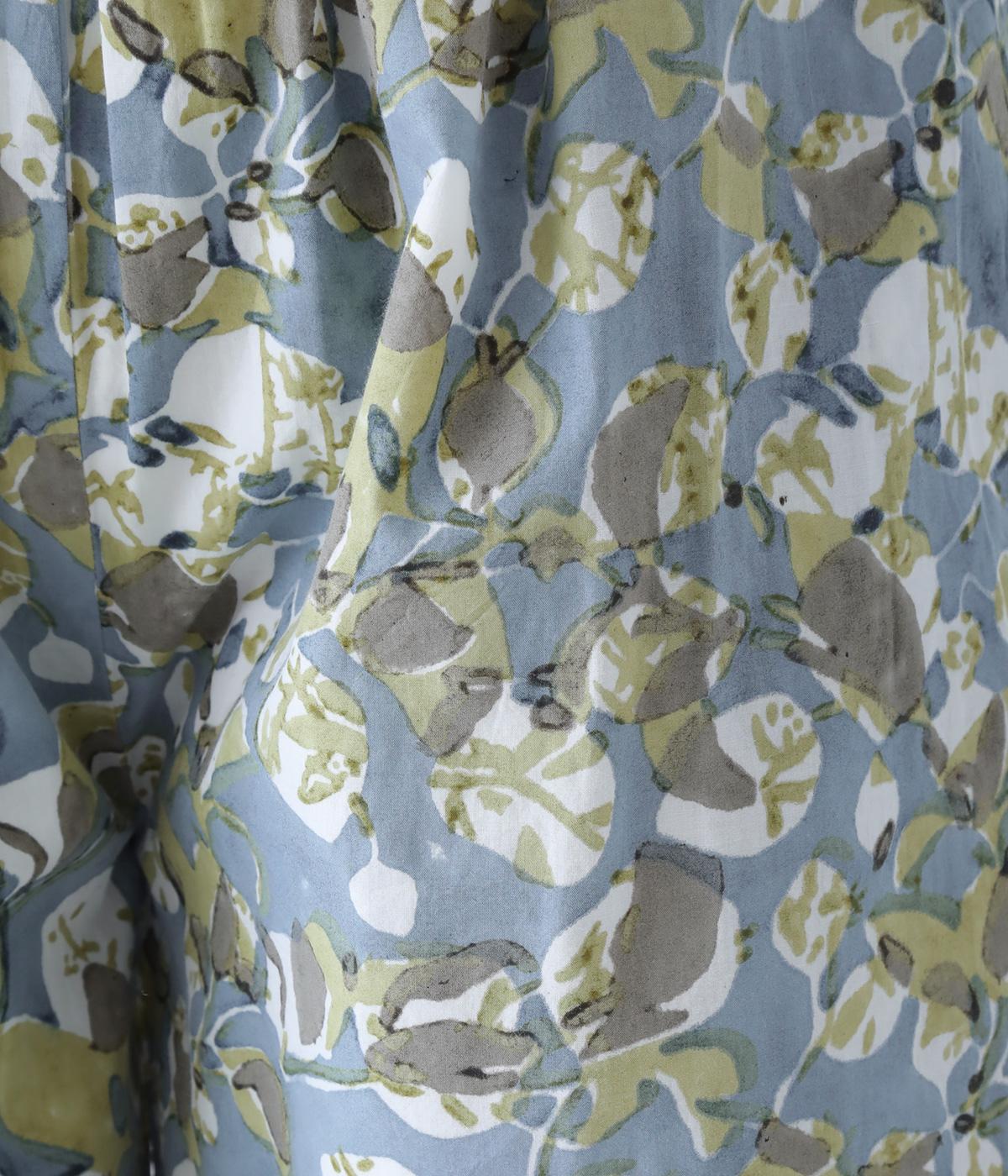 インドの伝統的なブロックプリントを施した、手仕事のぬくもりを感じるデザインです。かすれやにじみのある柄がやわらかな表情を生み、装いに奥行きを添えます。ゆったりとしたシルエットに、生地の落ち感が加わり、広がりすぎず上品な佇まいに。コーディネートの主役として映える一枚です。