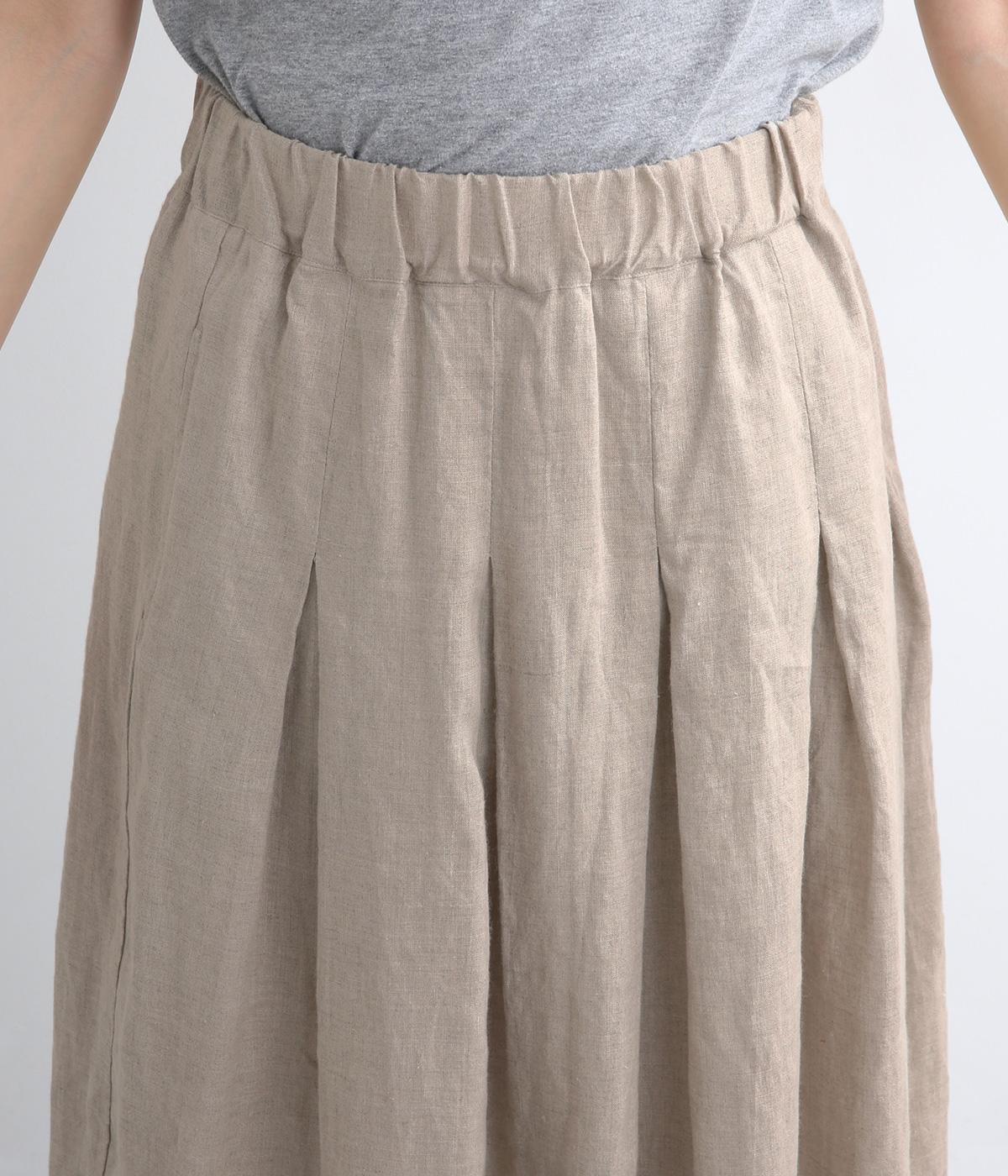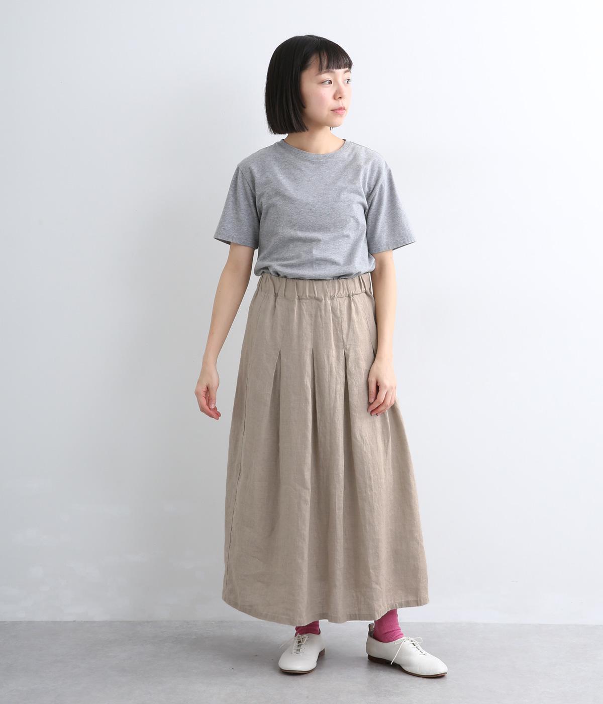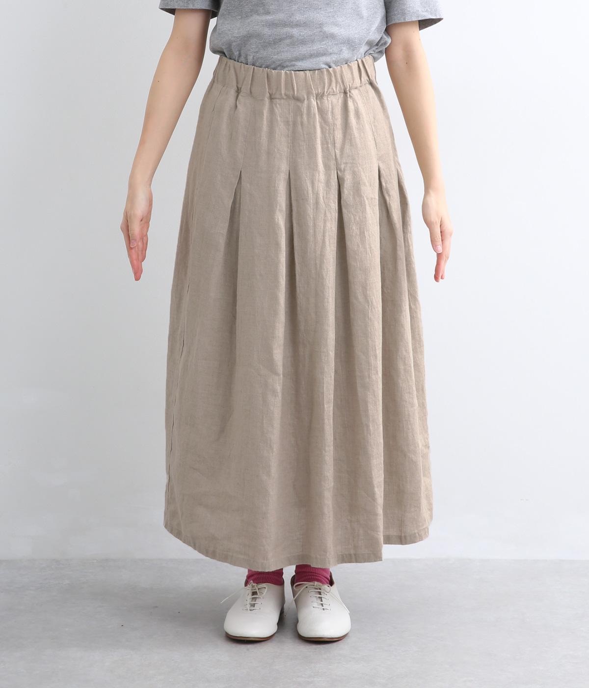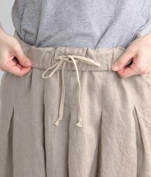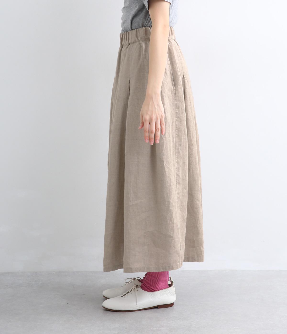 素材感を活かしてシンプルに仕立てたスカート。タックを入れて腰まわりは広がりをおさえ、裾に向かって自然なドレープに。ロング丈で品が良く、ソックス合わせはもちろん、夏場は素足にサンダルもさまになります。ウエストオールゴムに調整紐入りです。