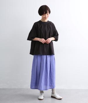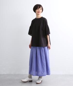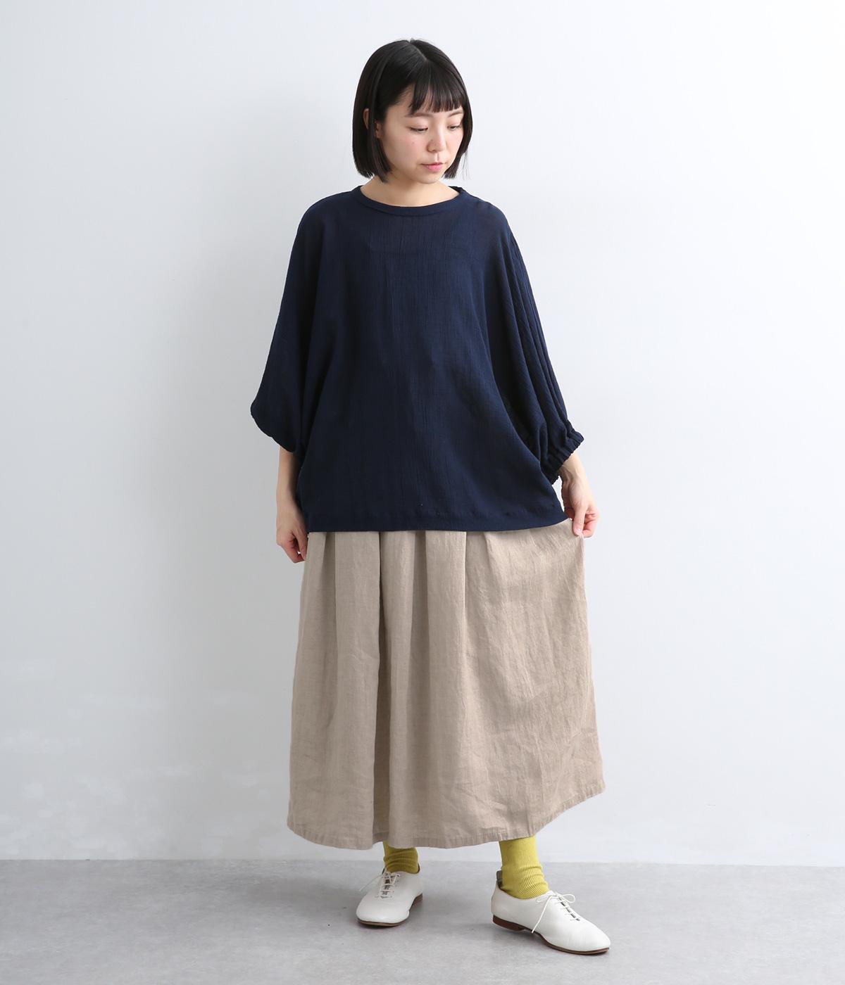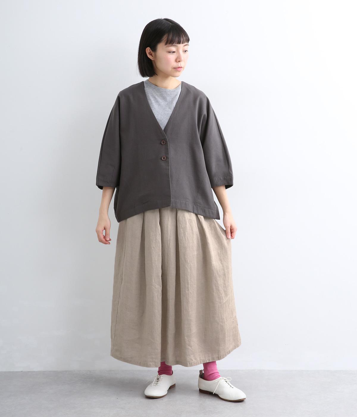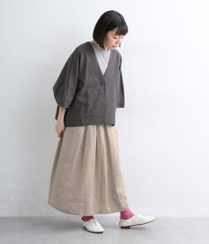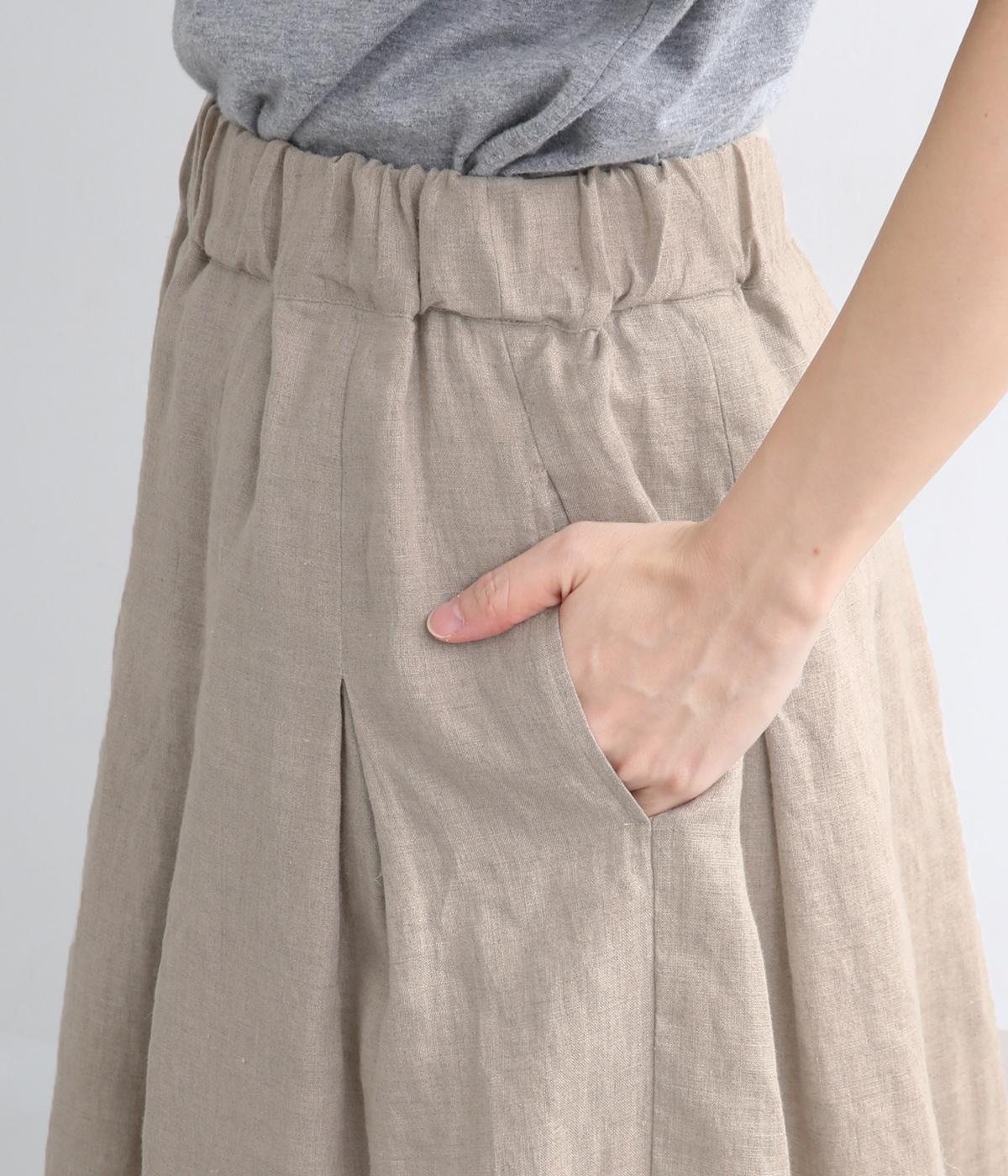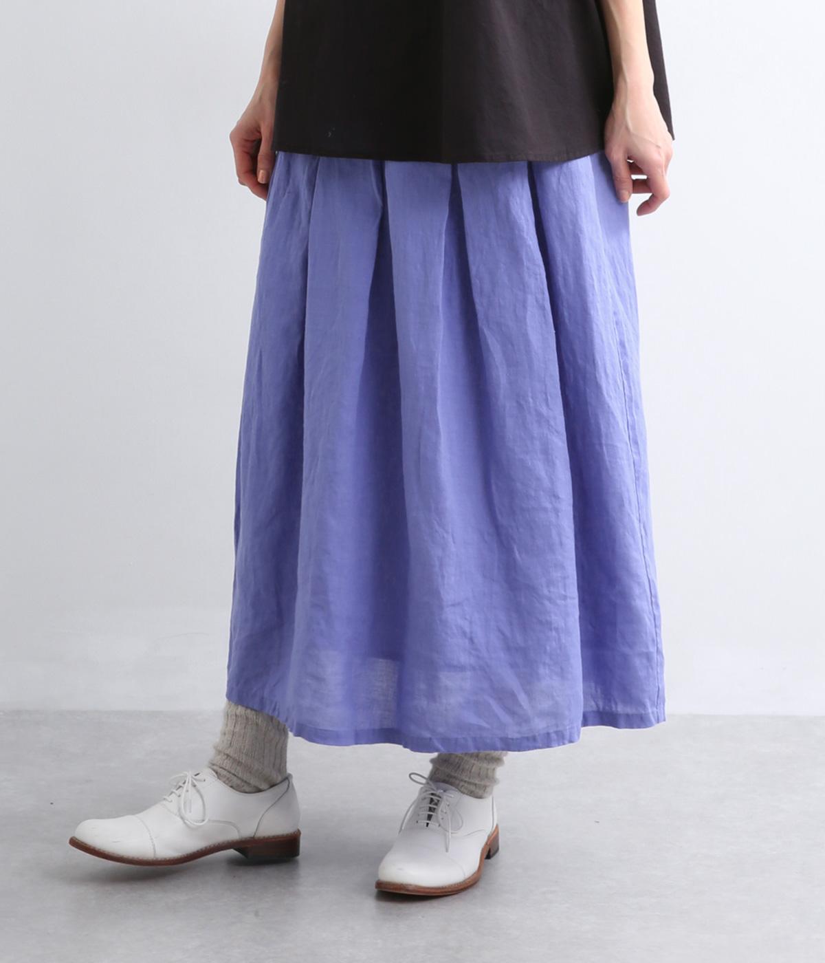 素材感を活かしてシンプルに仕立てたスカート。タックを入れて腰まわりは広がりをおさえ、裾に向かって自然なドレープに。ロング丈で品が良く、ソックス合わせはもちろん、夏場は素足にサンダルもさまになります。ウエストオールゴムに調整紐入りです。