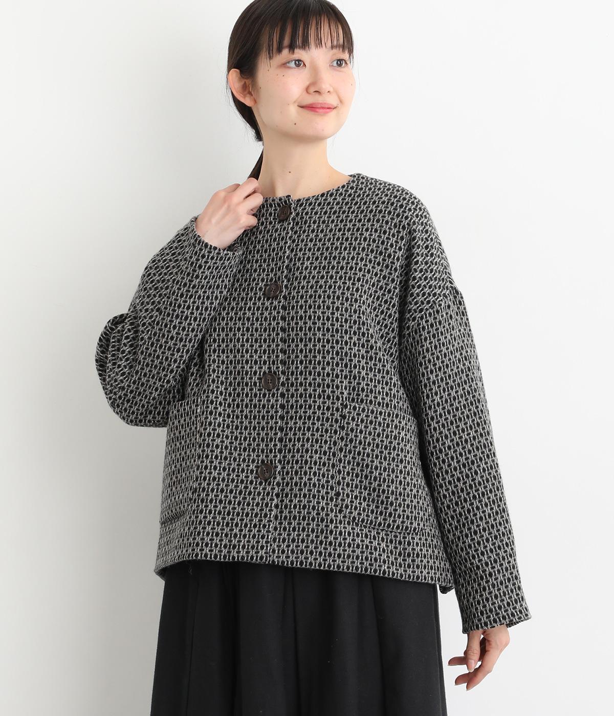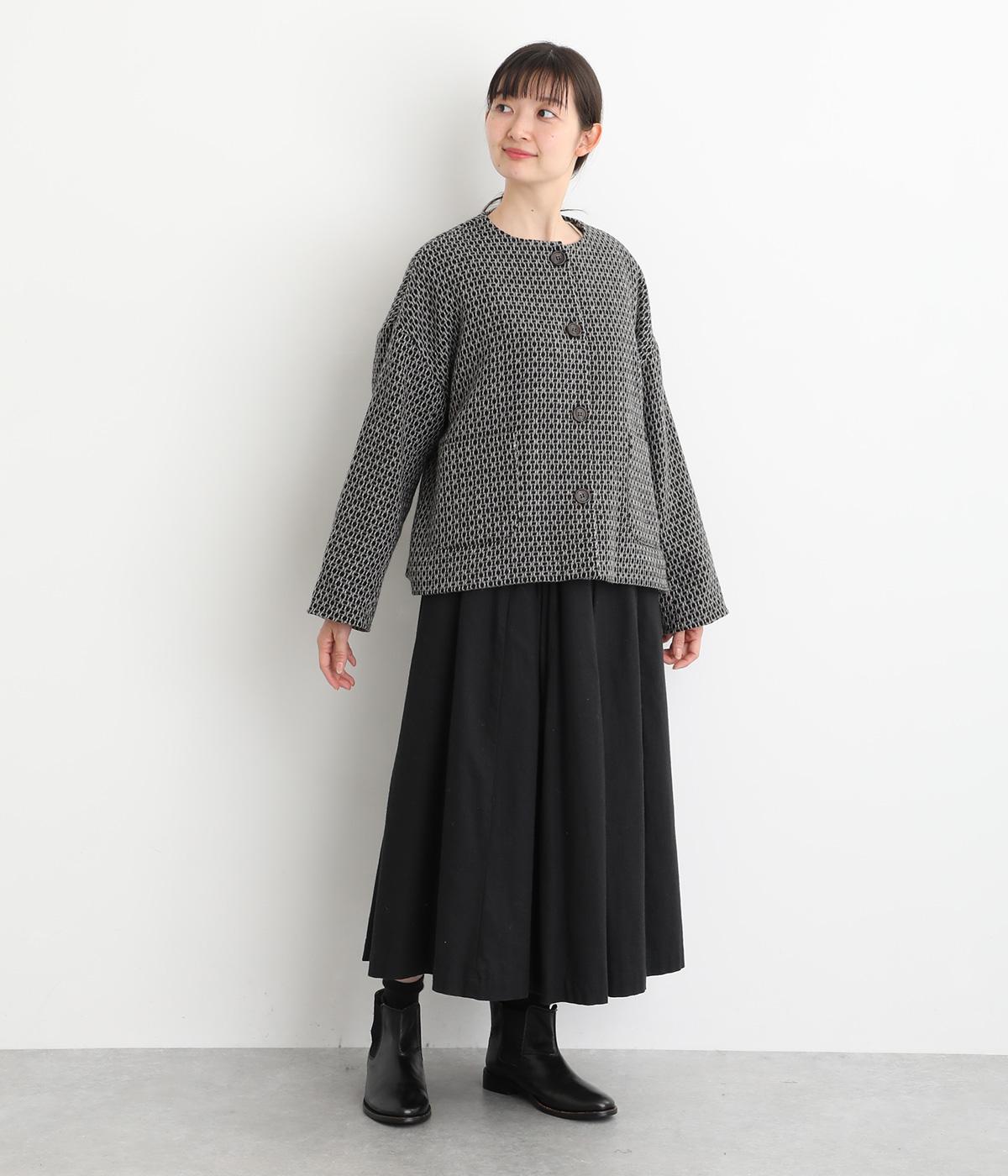 表情のある生地感が映える上品なノーカラージャケット。身幅にゆとりを持たせた分、着丈は短めに設定してバランスをとりました。フロントの大きなボタンとパッチポケットがアクセントに。オンオフ問わず着まわせる便利な一着です。