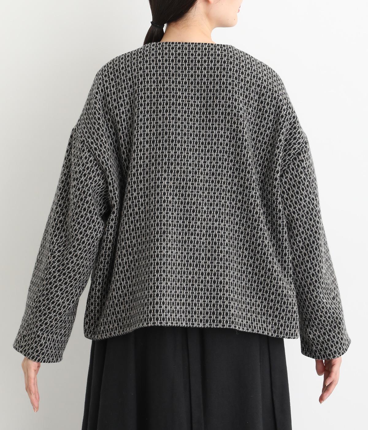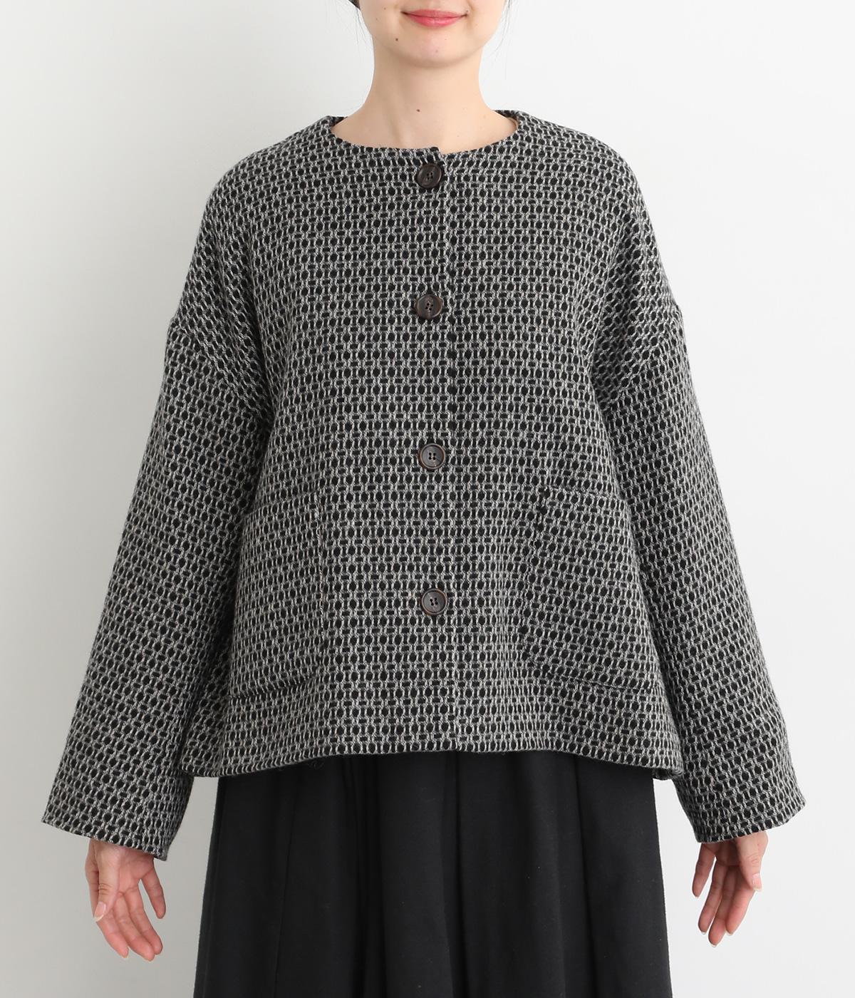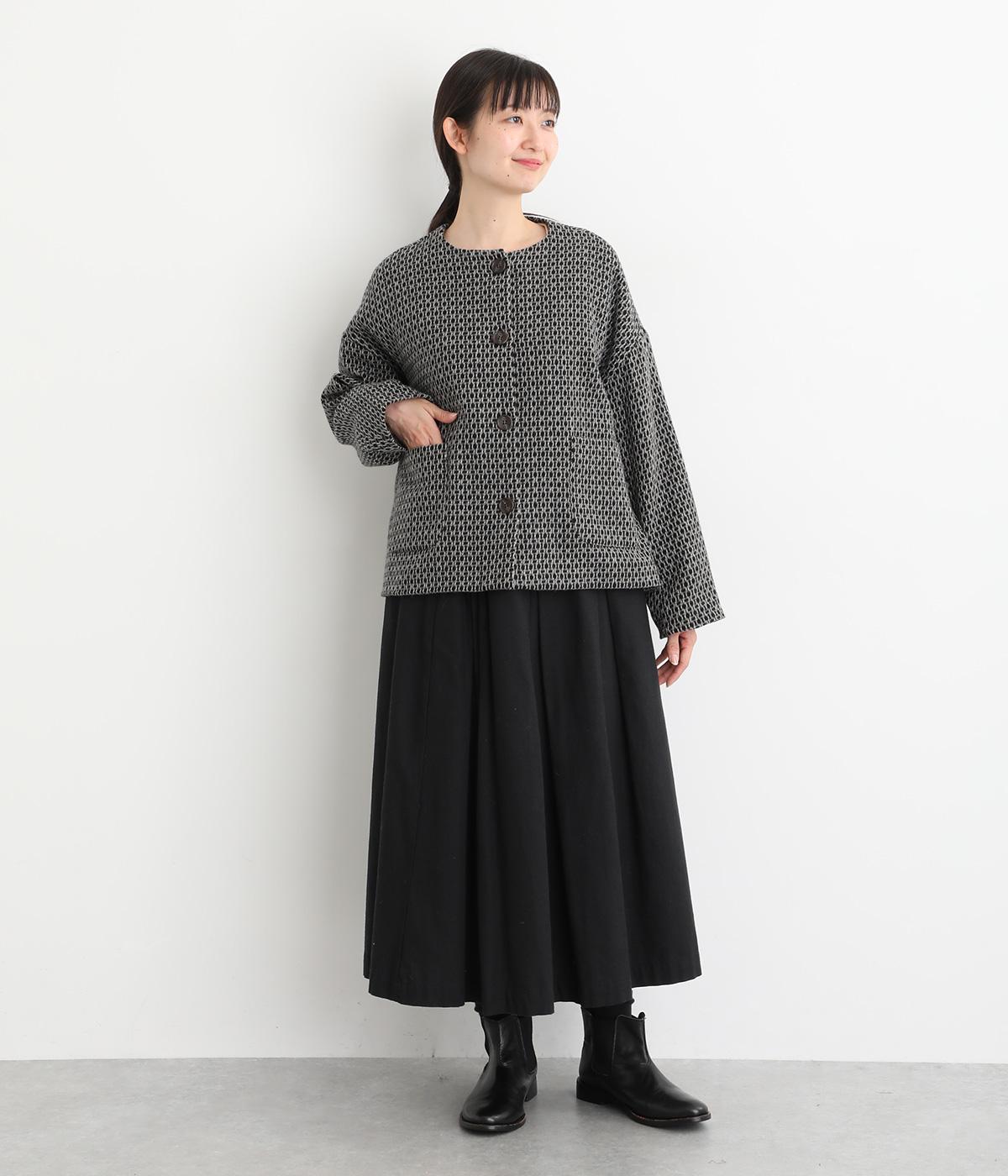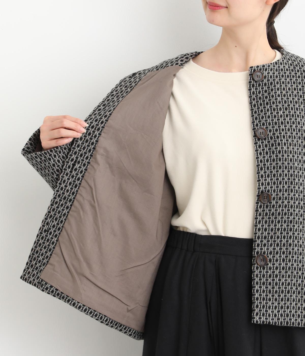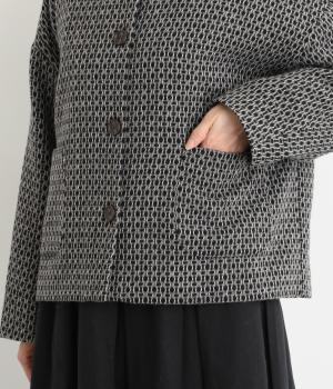 表情のある生地感が映える上品なノーカラージャケット。身幅にゆとりを持たせた分、着丈は短めに設定してバランスをとりました。フロントの大きなボタンとパッチポケットがアクセントに。オンオフ問わず着まわせる便利な一着です。