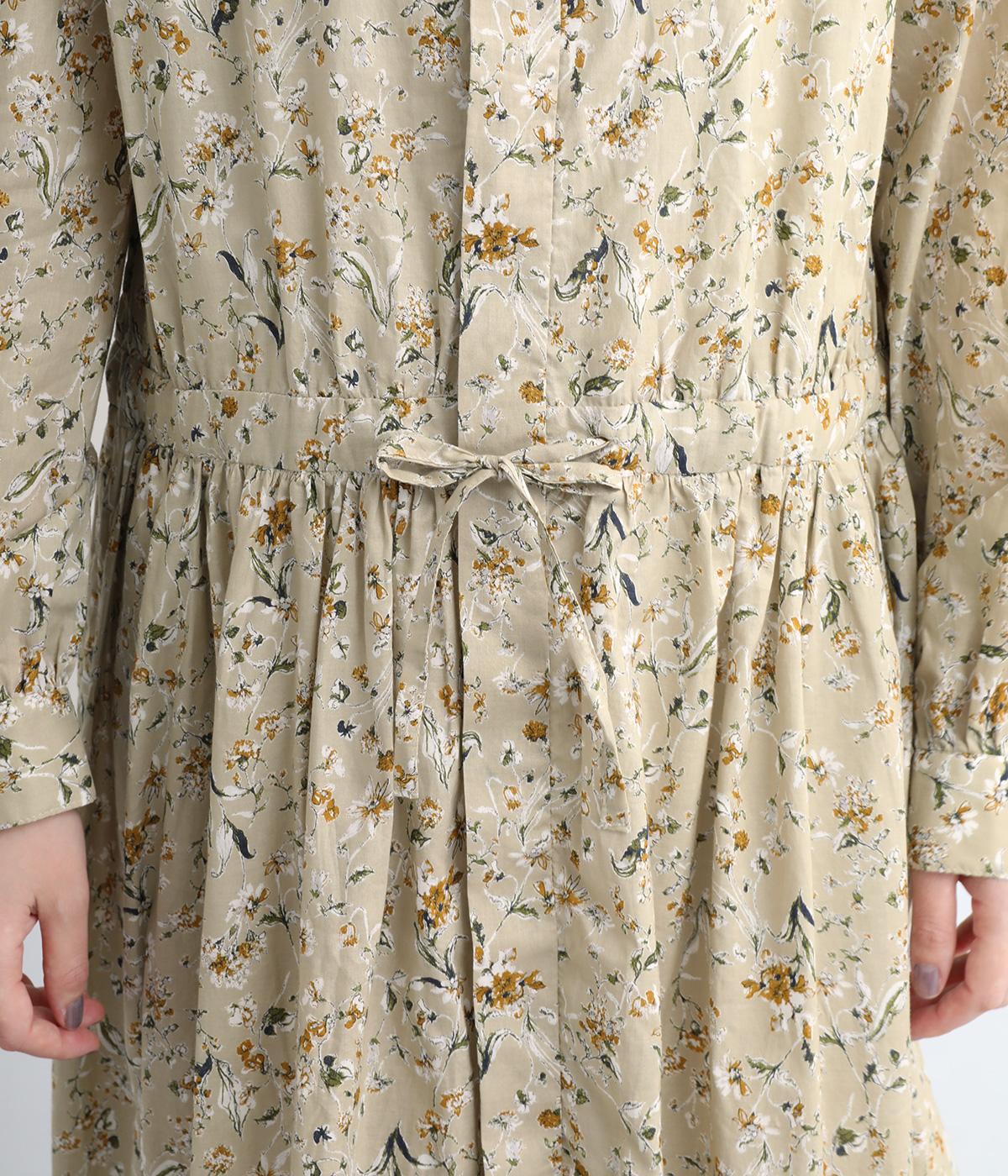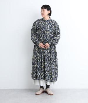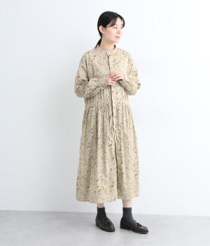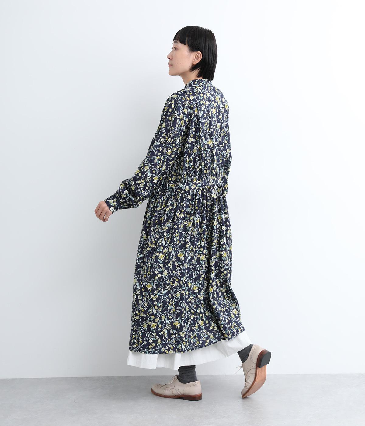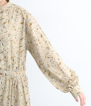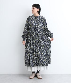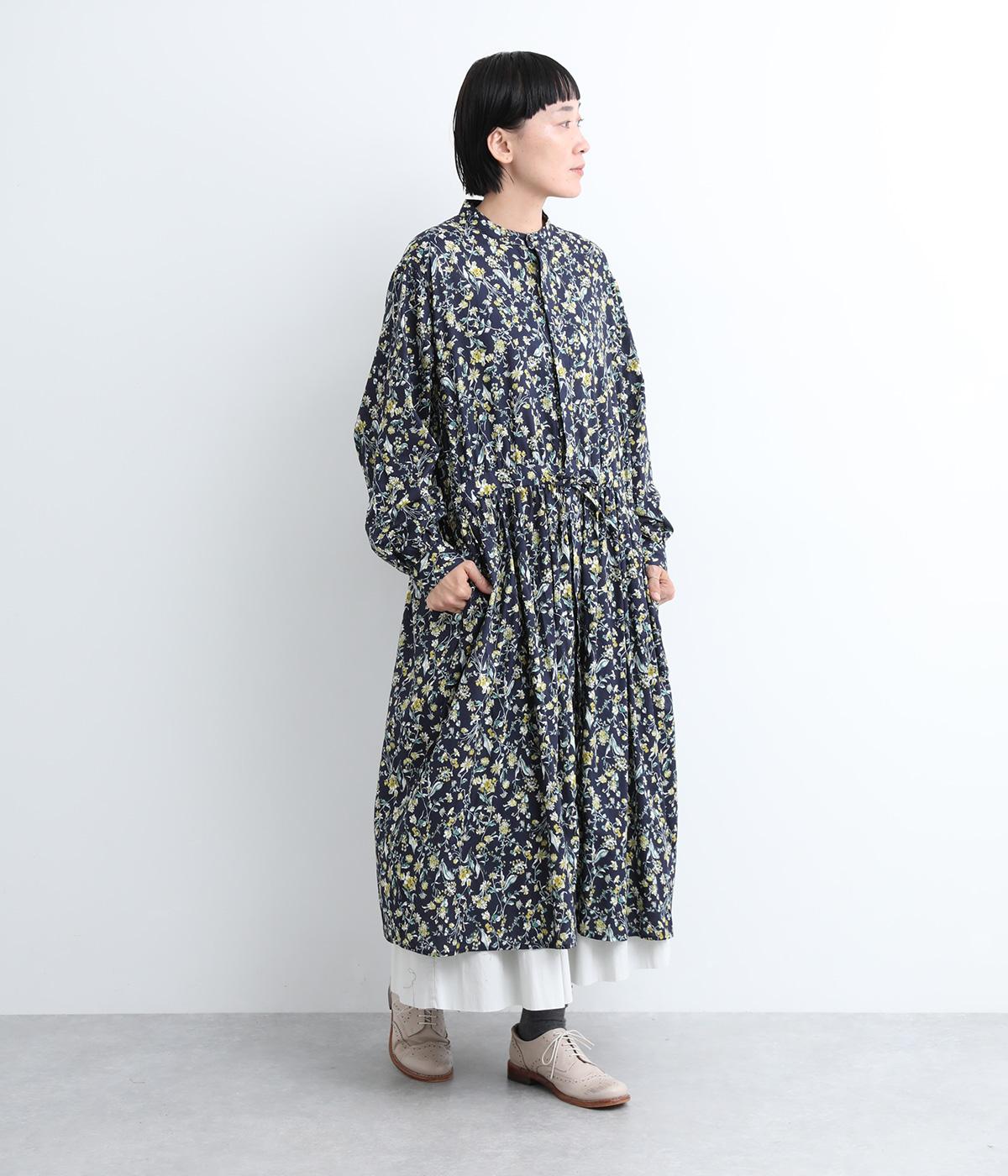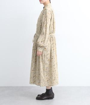 繊細に描かれたフラワープリントが大人の可愛らしさも感じさせる美しい一枚。ウエストにギャザーを寄せてメリハリをつけ、ゆったりと着こなせます。前あきで羽織りにしたり、ウエストリボンを結んだりアレンジも◎。ボタンのセレクトにもこだわりました。