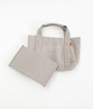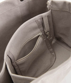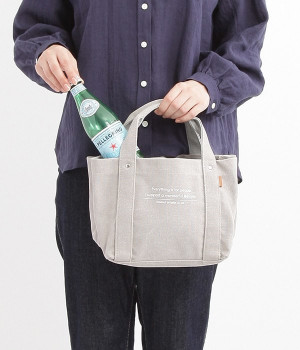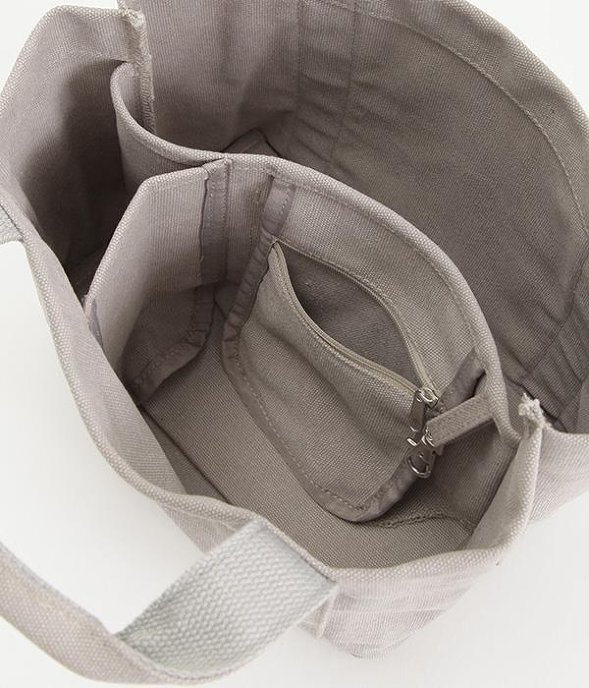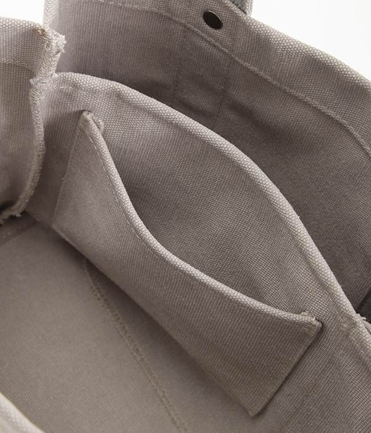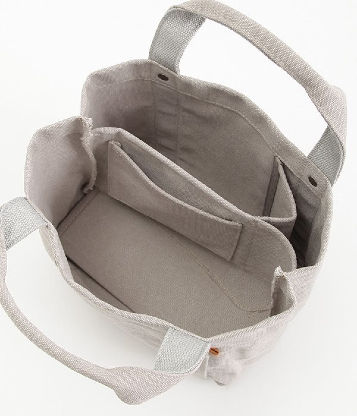 しっかりした帆布生地で仕立てた手提げバッグです。中敷きもついているためとっても丈夫。バッグ内には細かく仕切りがあり、整理整頓のしやすさにこだわっているため、ペットボトルやドリンクボトルも倒れず、すっきりとしまうことができます。内側にはファスナーポケットや鍵などを付けられるフックもつけ、機能性にもこだわりました。