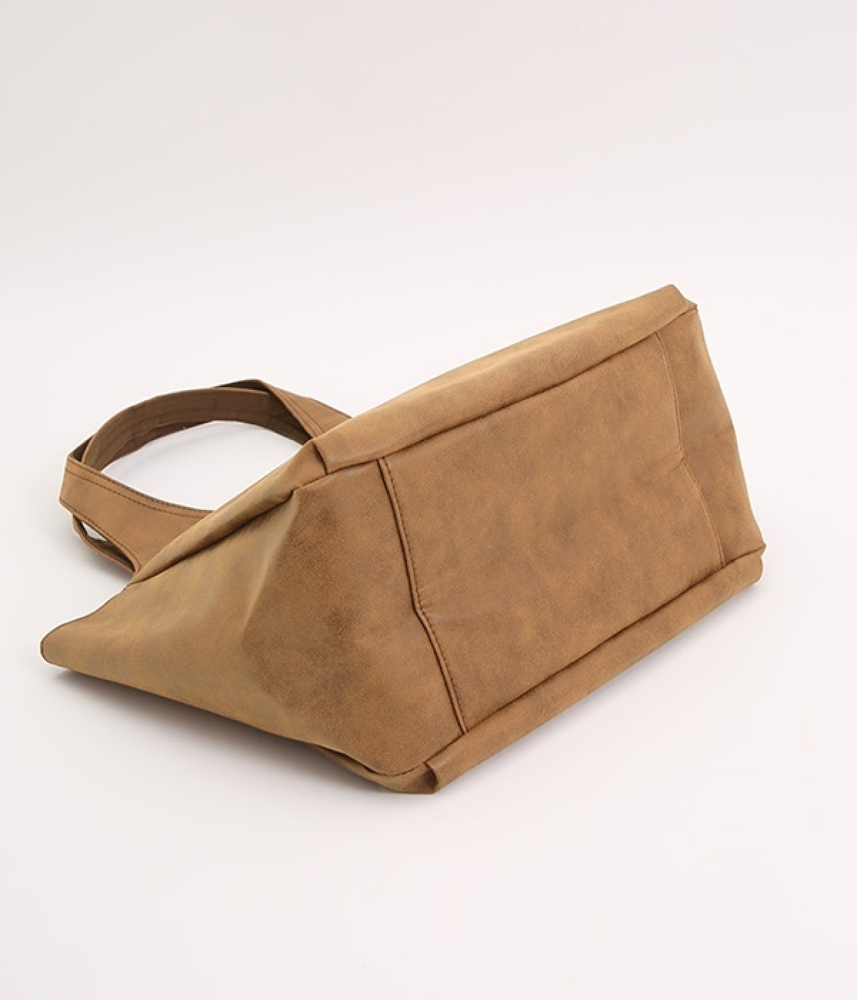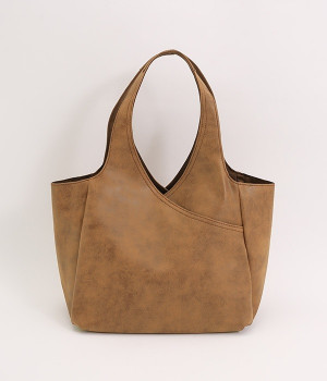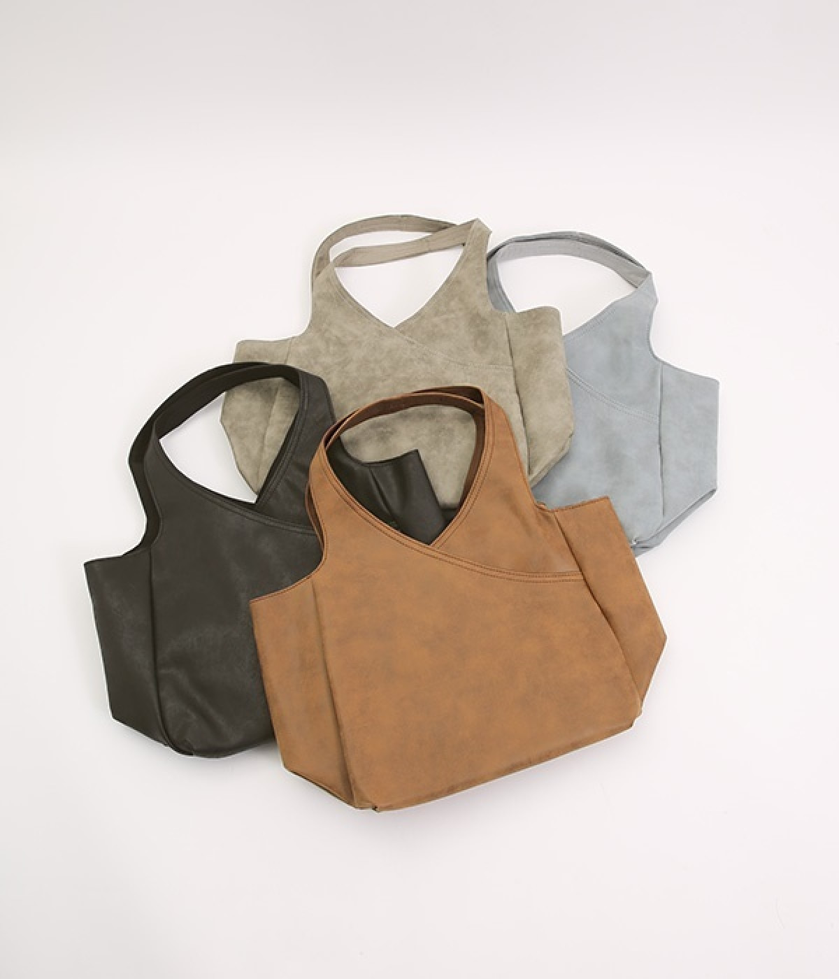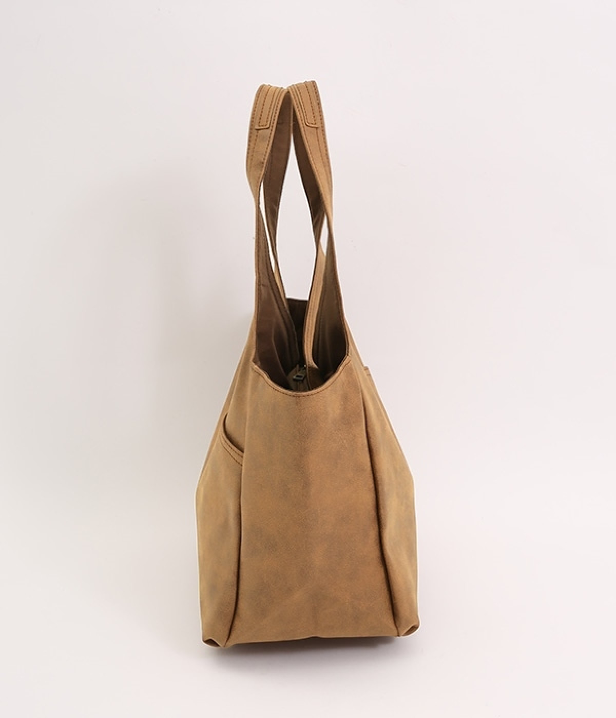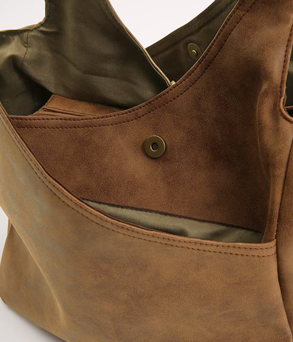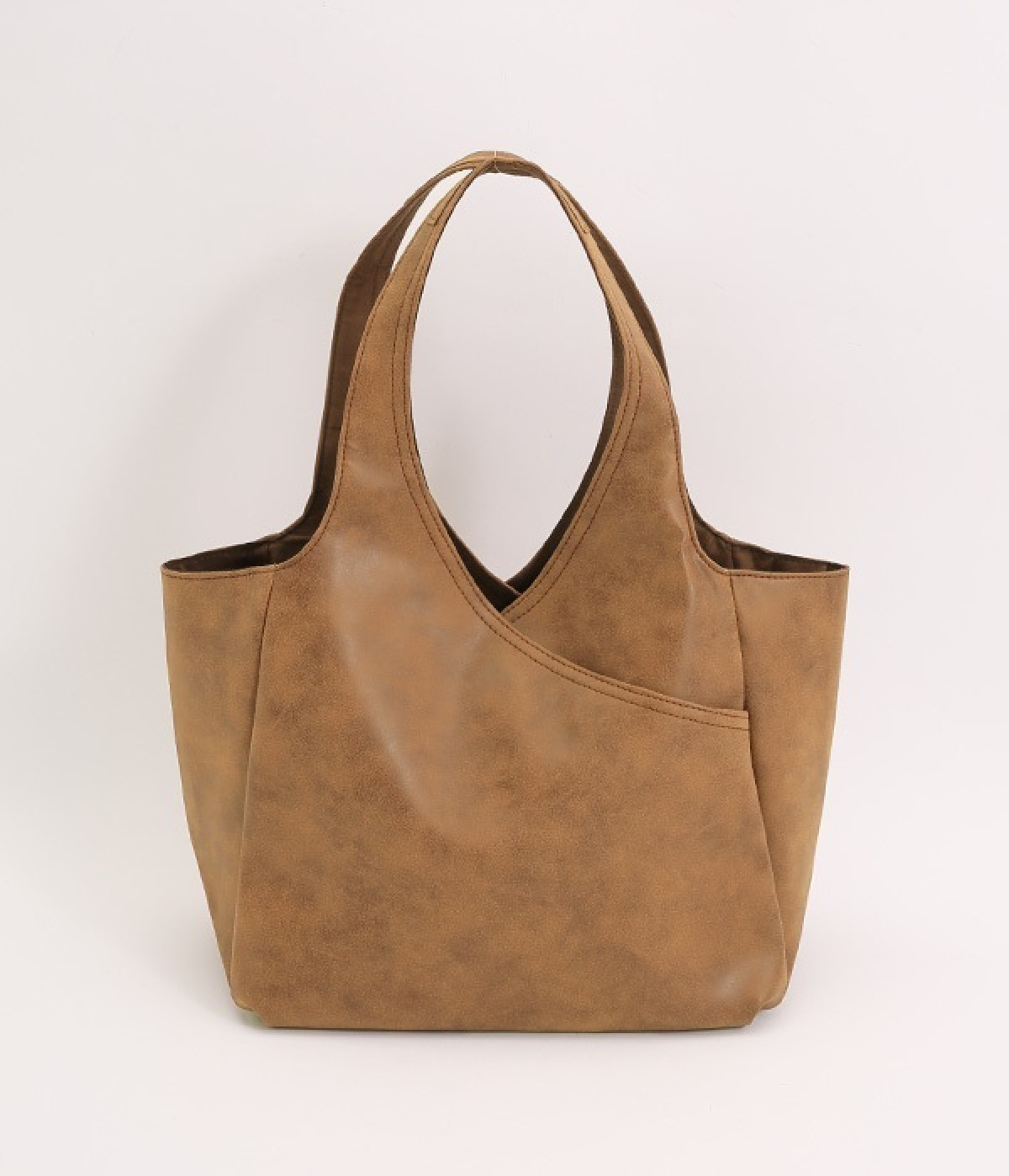 アンティークのような風合いとマットな質感が魅力のトートバッグ。素材は合皮なので軽くて扱いやすく、デイリー使いにぴったりです。持ち手からつながる斜めのカッティングポケットは、デザイン性のみならず利便性も◎。ポケットにはマグネットホック付きなので広がってしまうことがなく、スマートフォンやパスケースなどの収納に便利です。A4の書類やマイボトル、大きめのポーチなども入る大容量で、通勤バッグにもおすすめ。