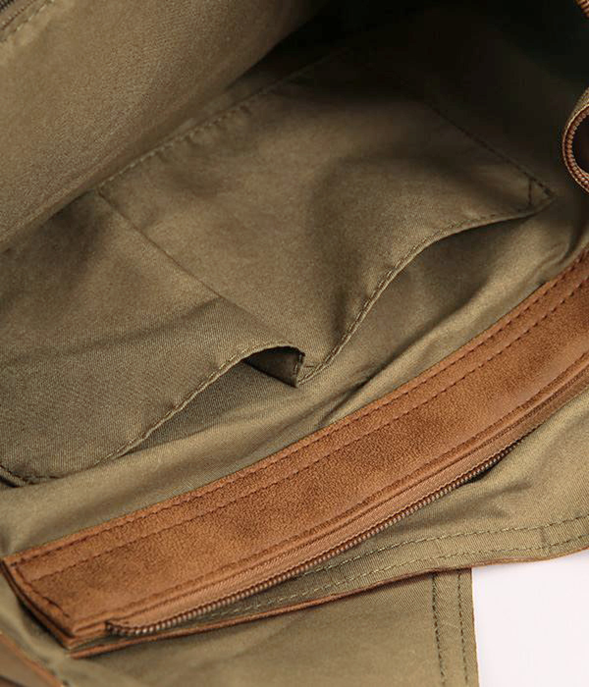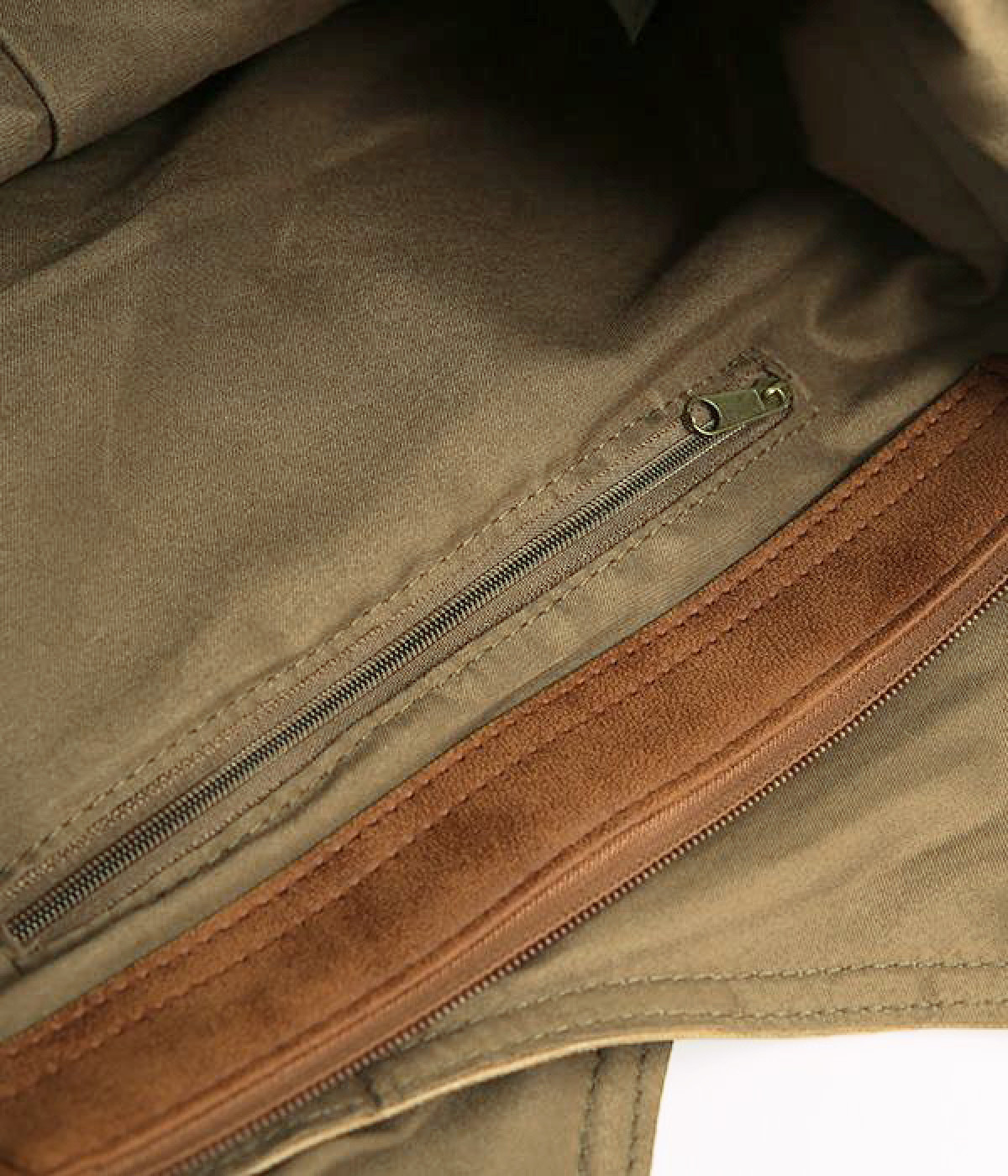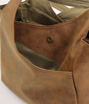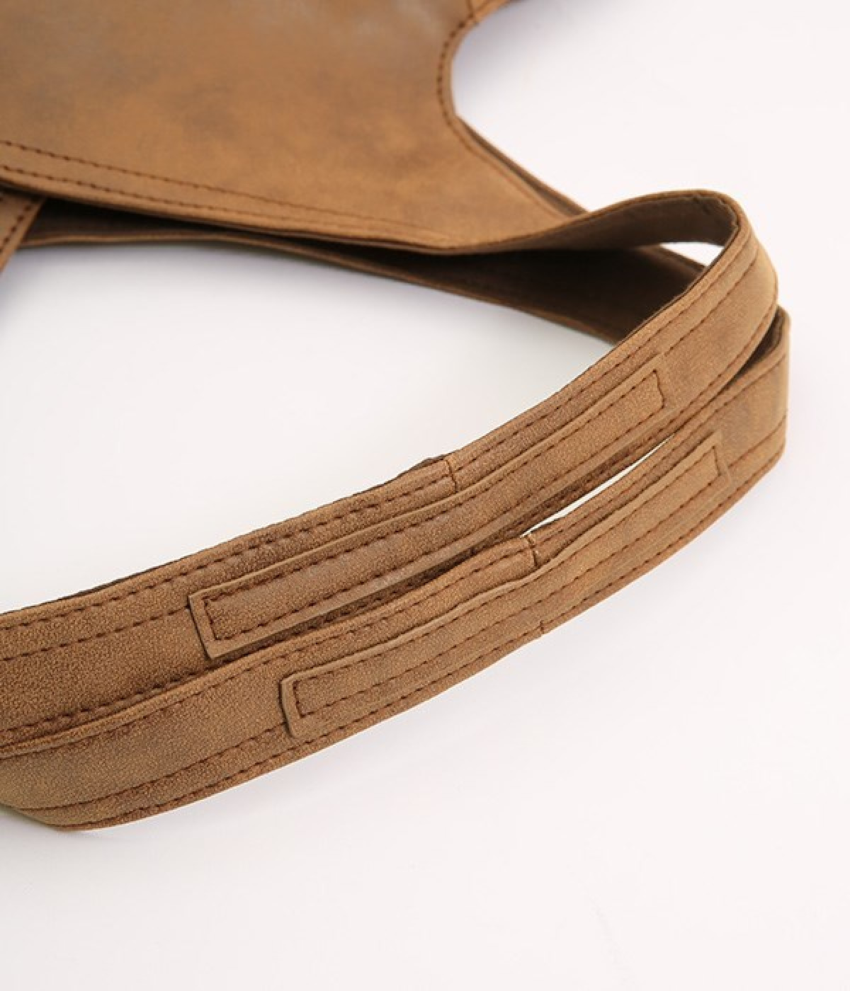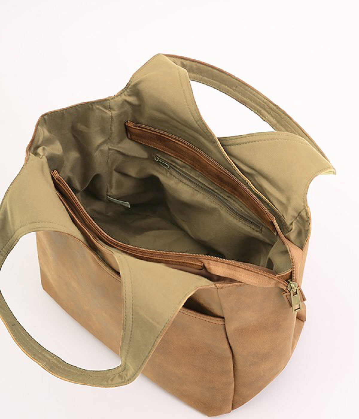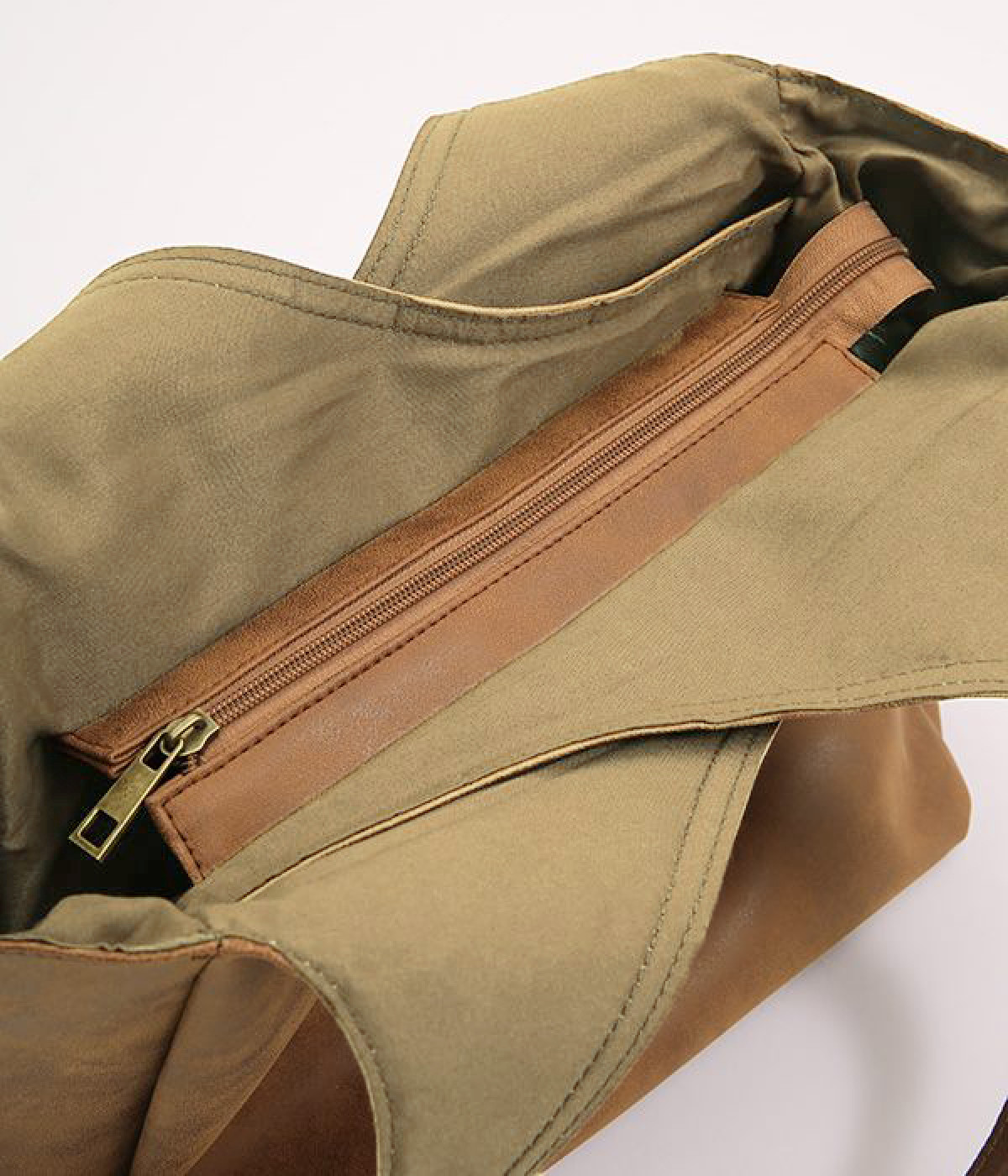 アンティークのような風合いとマットな質感が魅力のトートバッグ。素材は合皮なので軽くて扱いやすく、デイリー使いにぴったりです。持ち手からつながる斜めのカッティングポケットは、デザイン性のみならず利便性も◎。ポケットにはマグネットホック付きなので広がってしまうことがなく、スマートフォンやパスケースなどの収納に便利です。A4の書類やマイボトル、大きめのポーチなども入る大容量で、通勤バッグにもおすすめ。