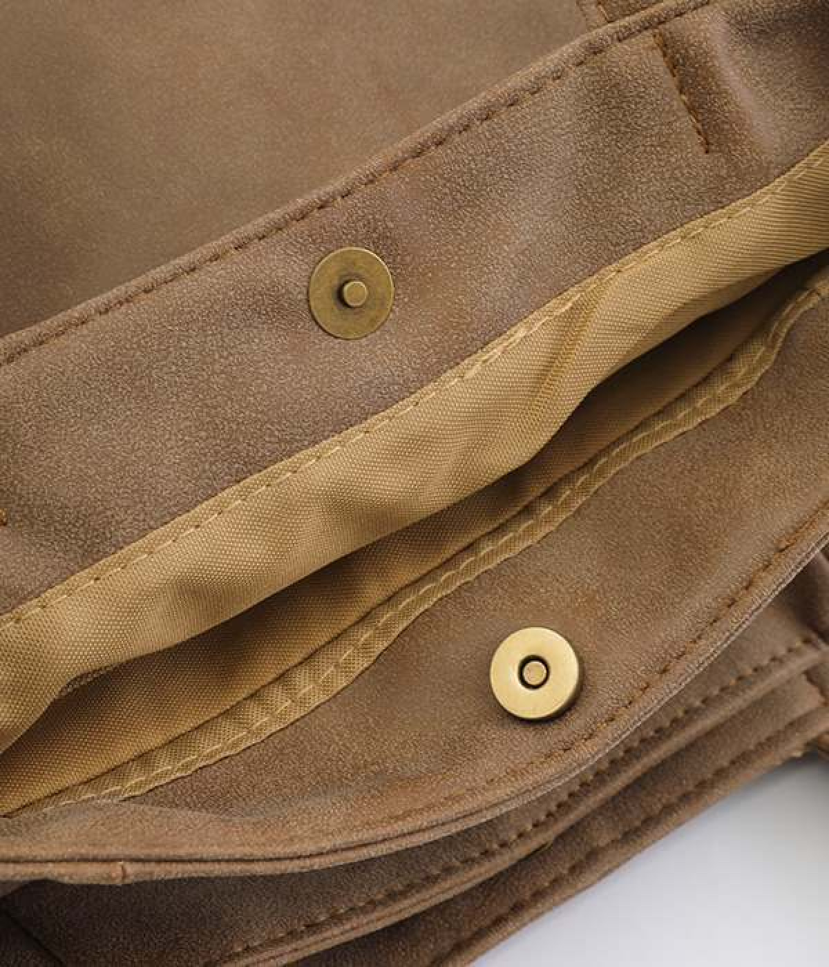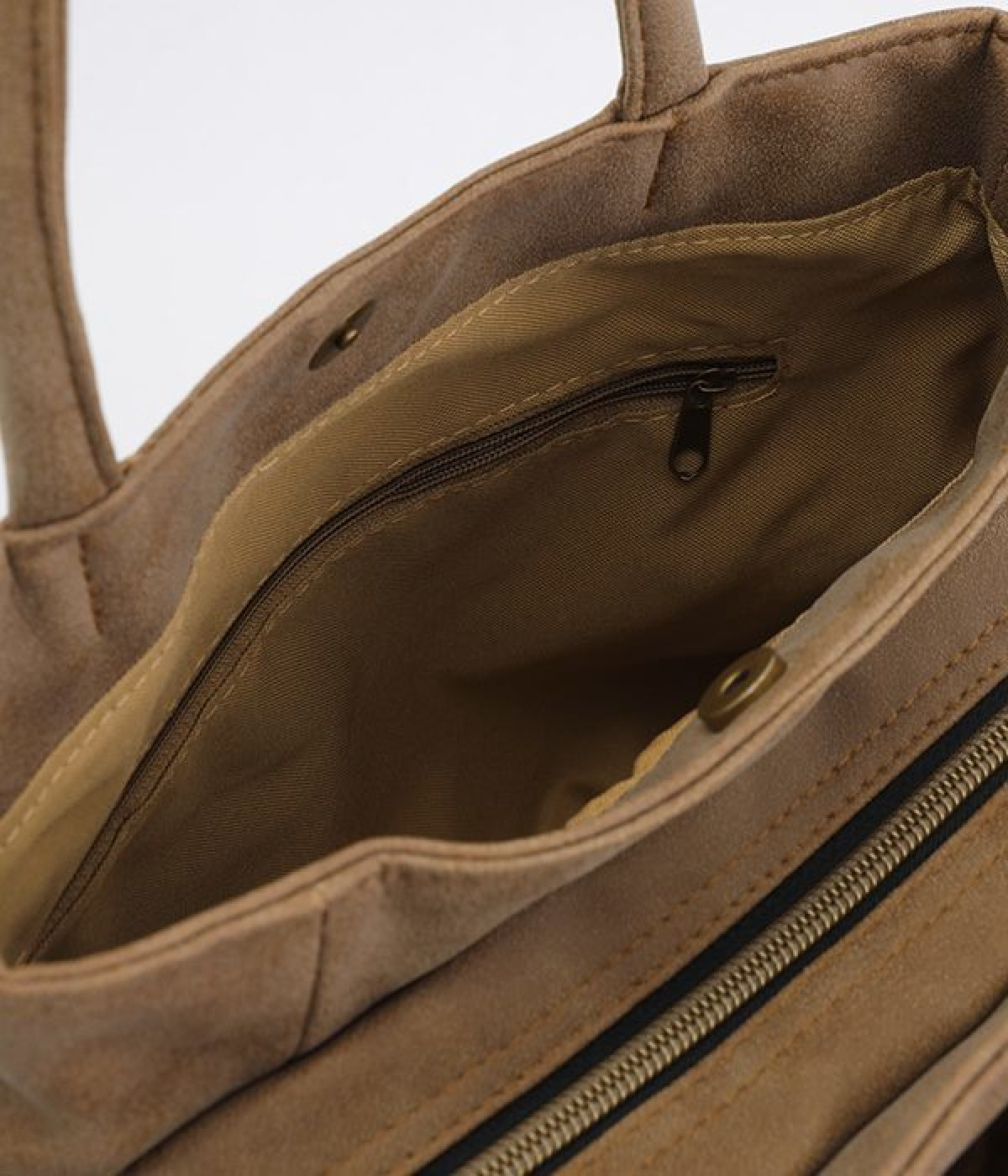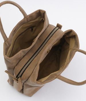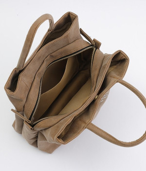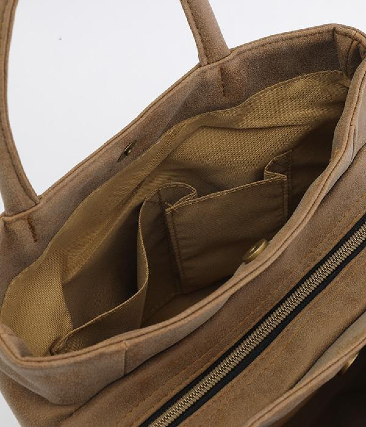 使い込んだようなリアルな風合い&マット仕上げで大人の雰囲気をまとうバッグ。収納部を大きく三つにセパレートして、アイテムごとの仕分けが簡単に行える仕様です。センターの収納部にはファスナーが備わり、貴重品などを入れておくのに便利。いくつものポケットもセットしているので、中身が迷子になりません。コンパクトなシルエットながらマチ幅を確保し、毎日の手まわり品がすっきりとおさまります。とても軽量の仕上がりで手持ちタイプでも持ち歩きやすいのが魅力です。
