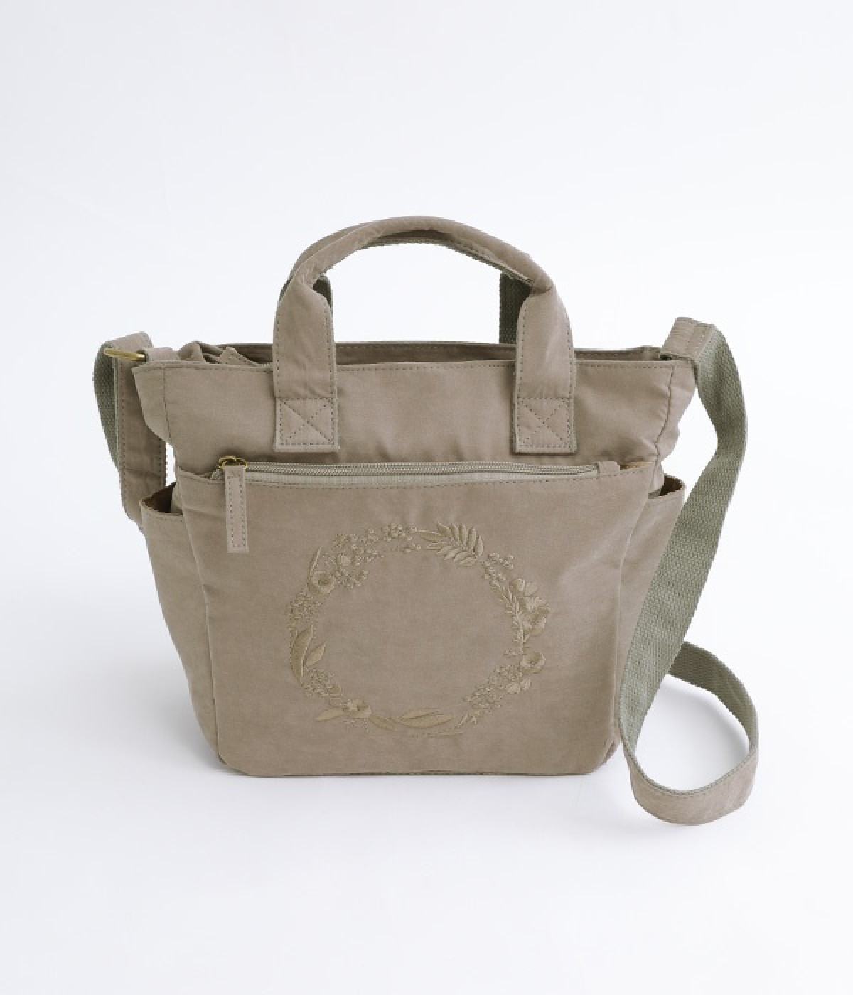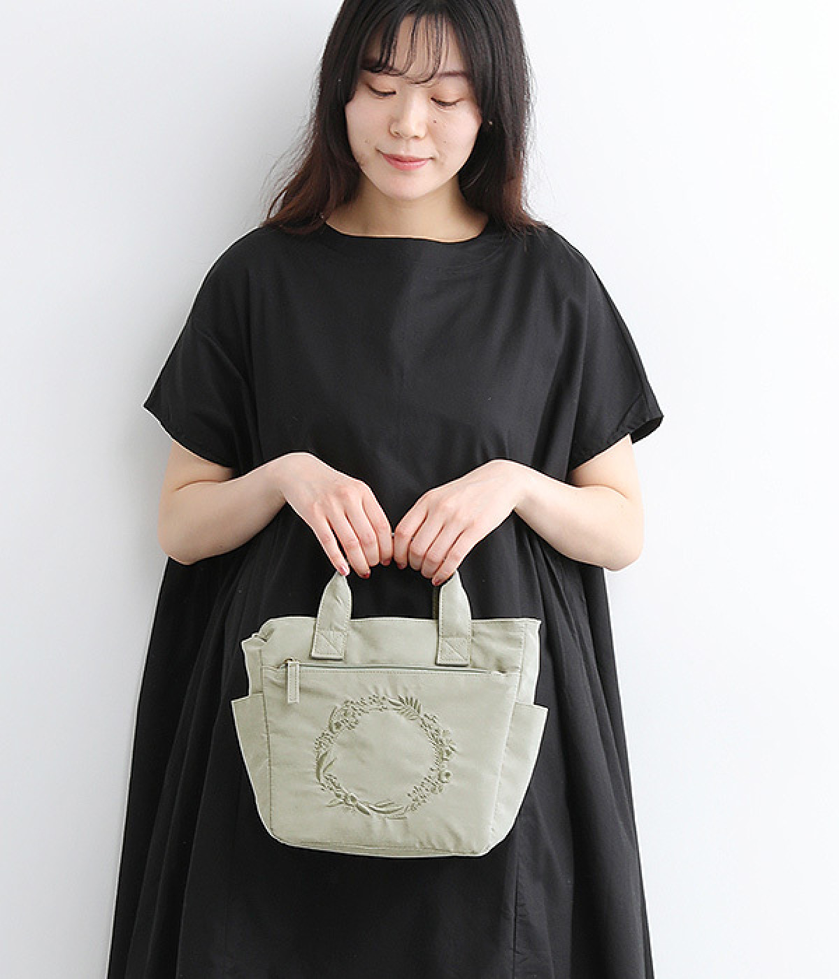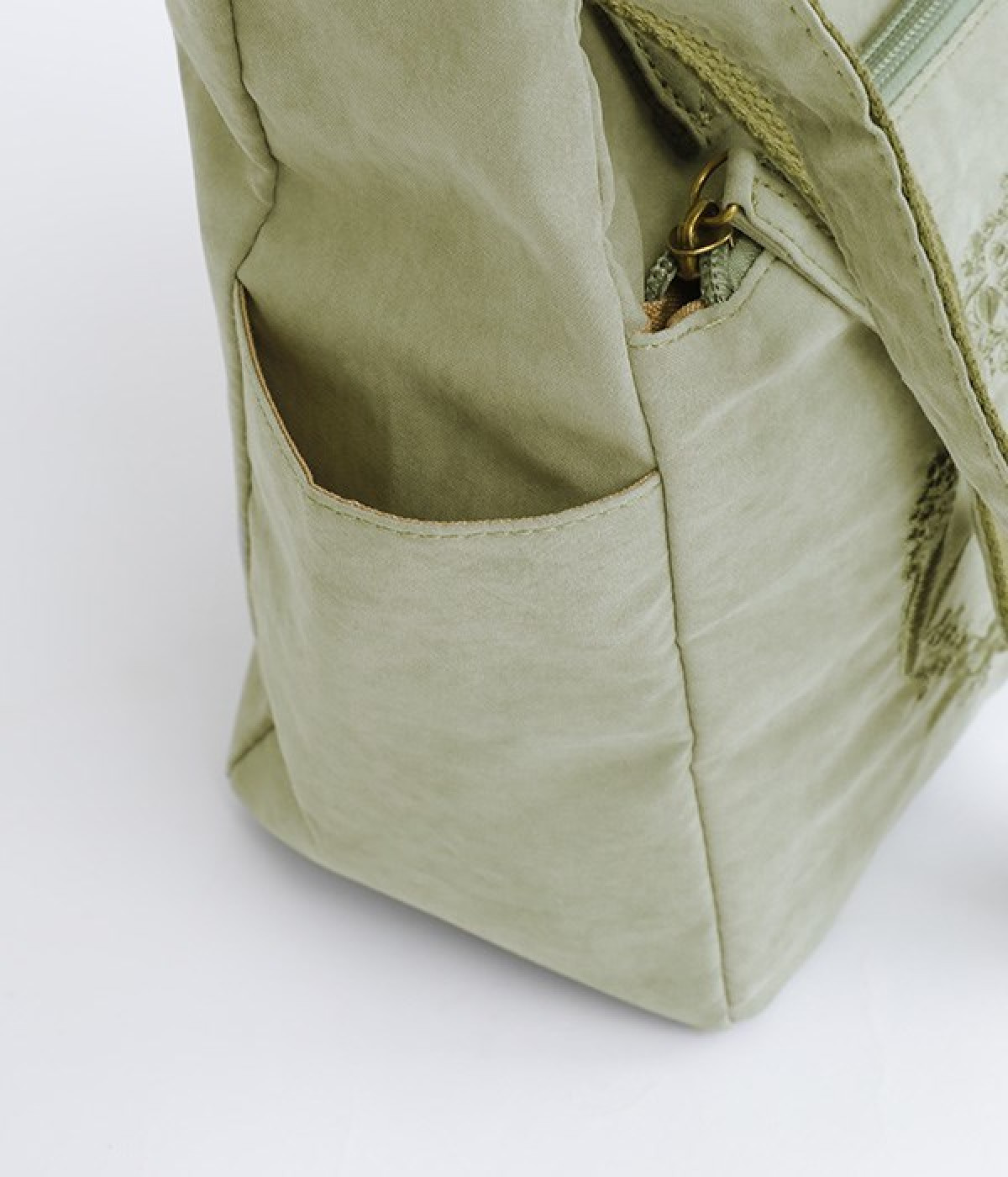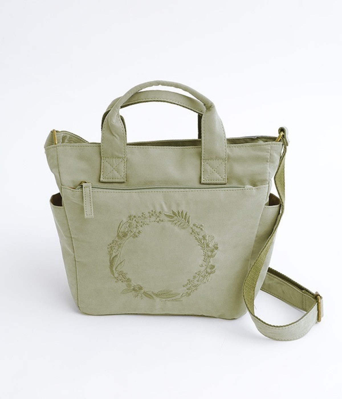 やわらかい手触りが特徴のピーチスキン風生地に、ボタニカル柄刺しゅうを施したショルダーバッグです。表情豊かな仕上がりで、大人のナチュラルスタイルと相性◎。手提げも肩掛けも可能なので、荷物の量やコーディネートに合わせて持ち方がアレンジできます。ファスナー開閉で防犯面も安心。ポケットも充実しているため整理整頓しやすく、デイリーのお出掛けに活躍します。
