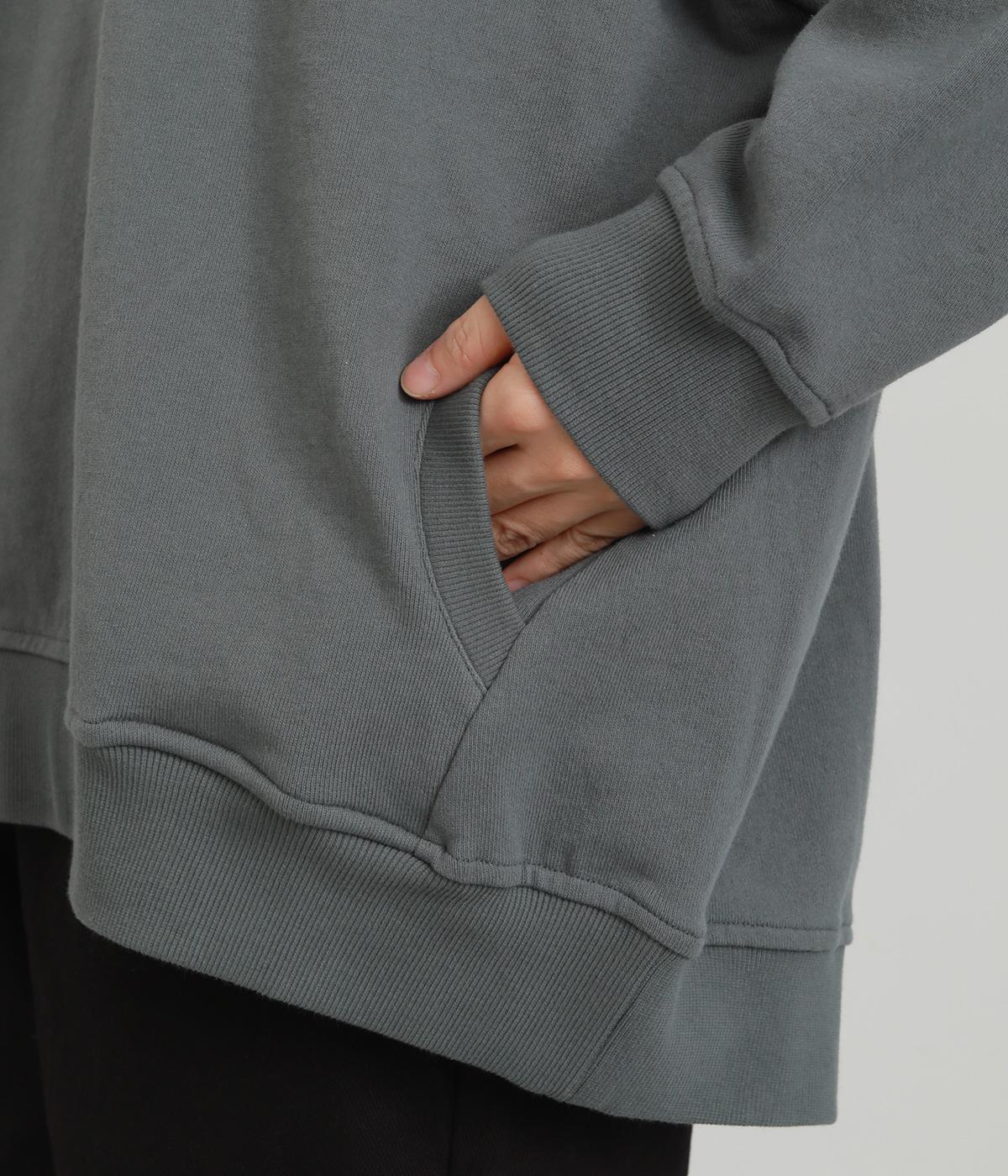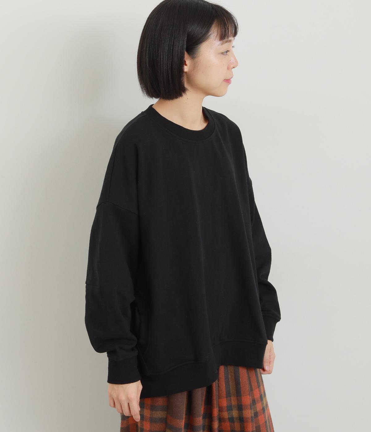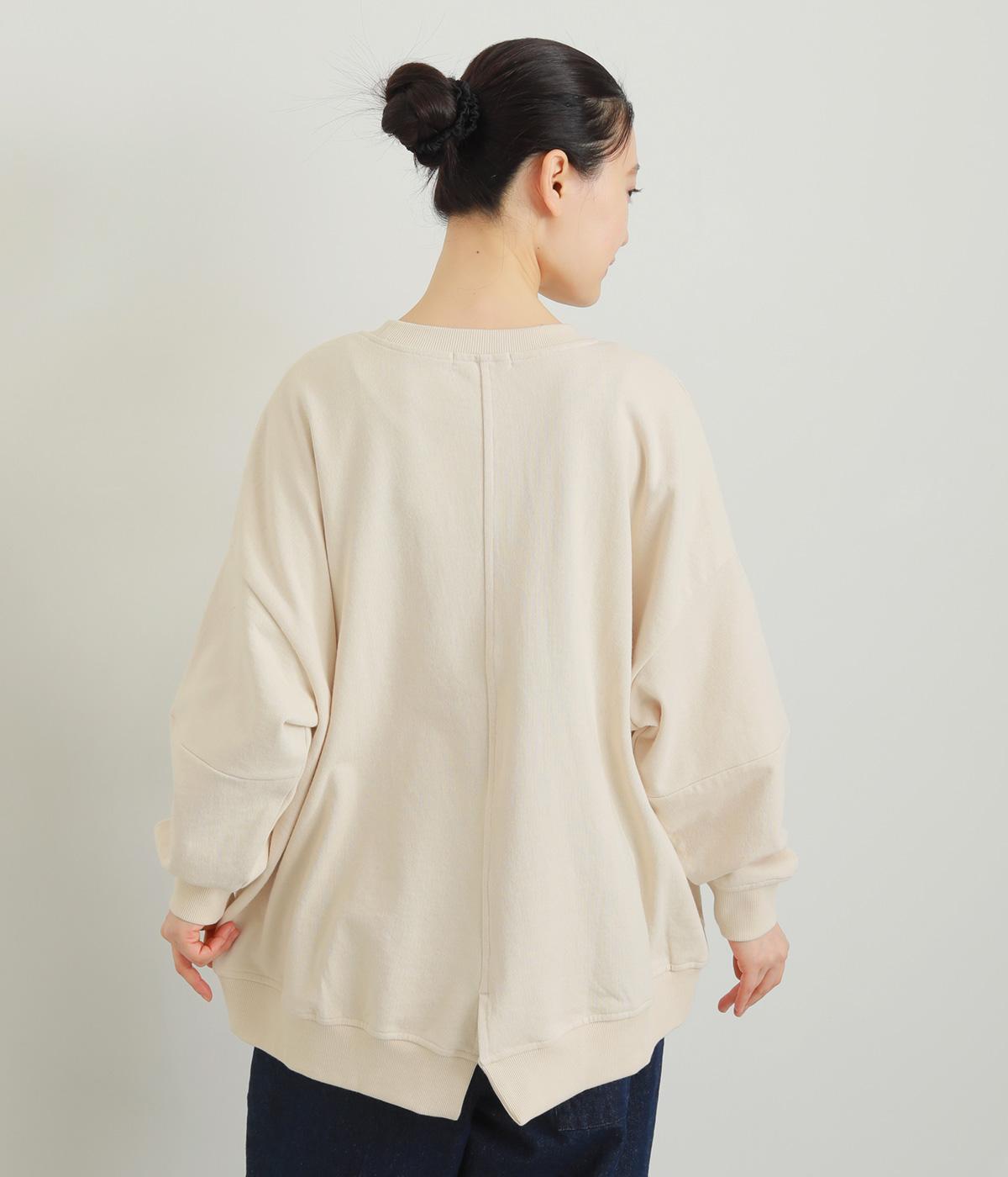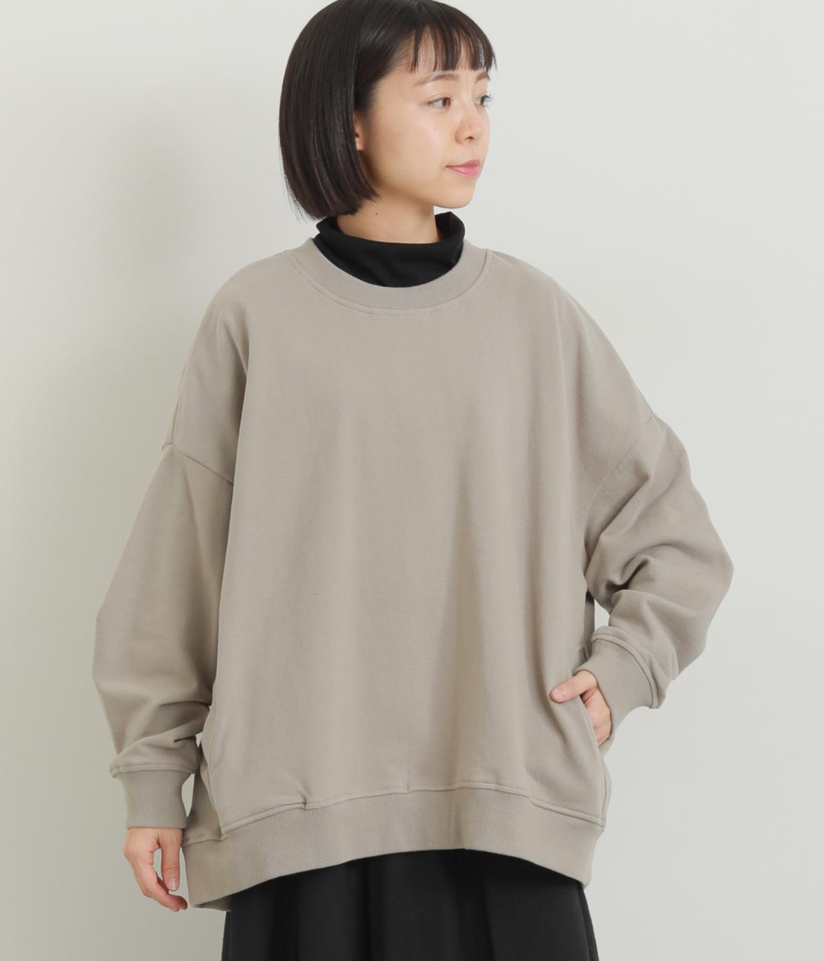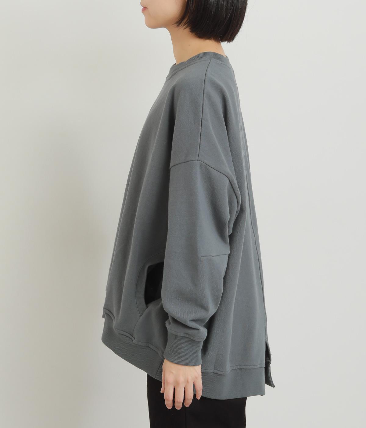 くり抜きタイプのサイドポケットが特徴的で可愛らしさのあるプルオーバー。ドロップショルダーにゆとりのある身幅で着心地はリラクシー。やや長めの後ろ裾はカットを入れてちょうどいい抜け感を持たせました。